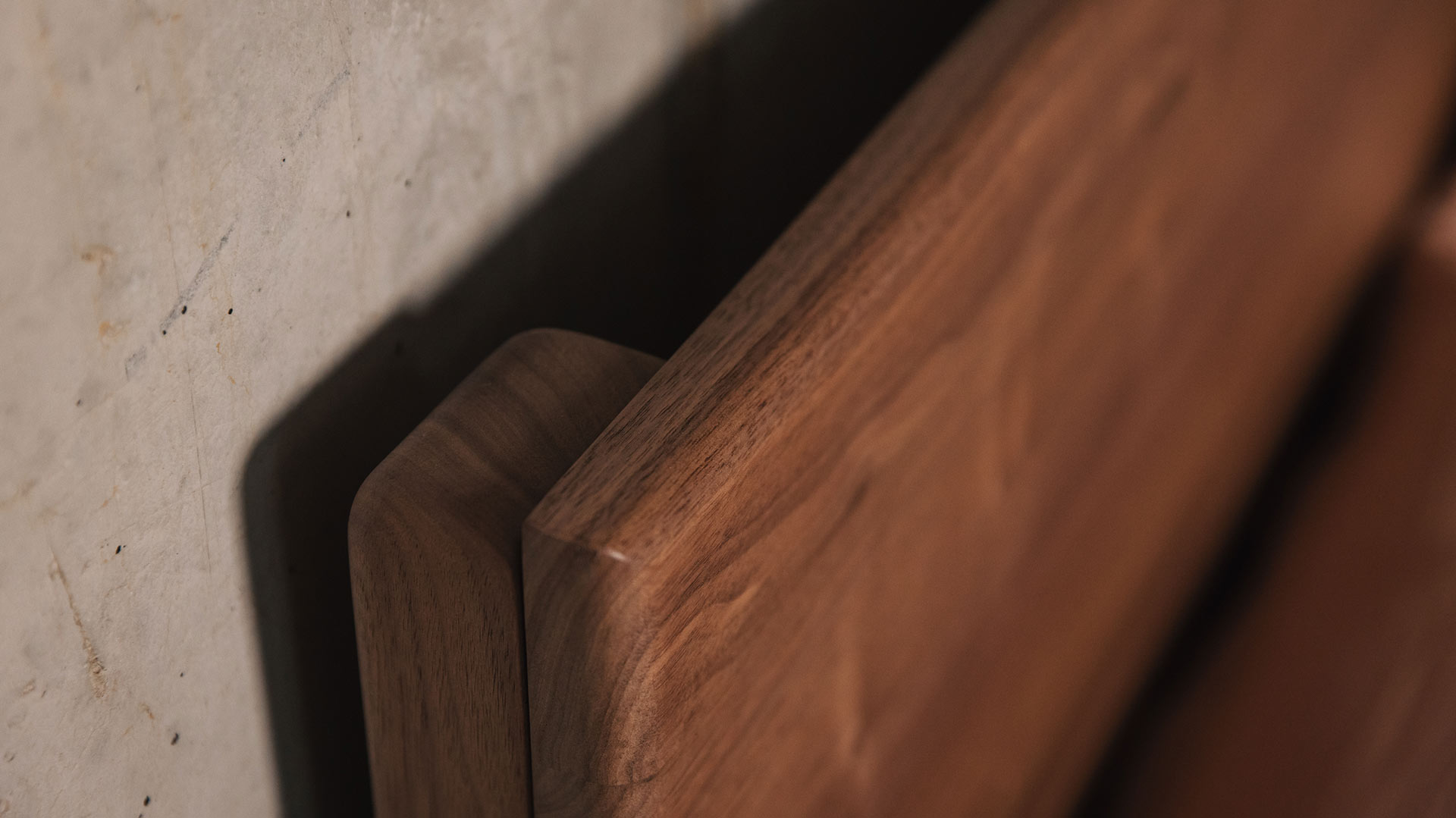 Characterised by a large headboard and soft rounded edges, this bed is available here in solid Walnut in a UK kingsize (fits a 150x200cm mattress).