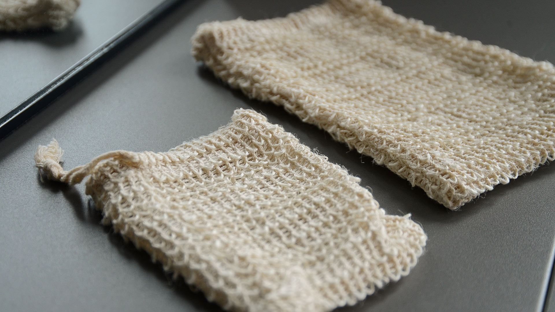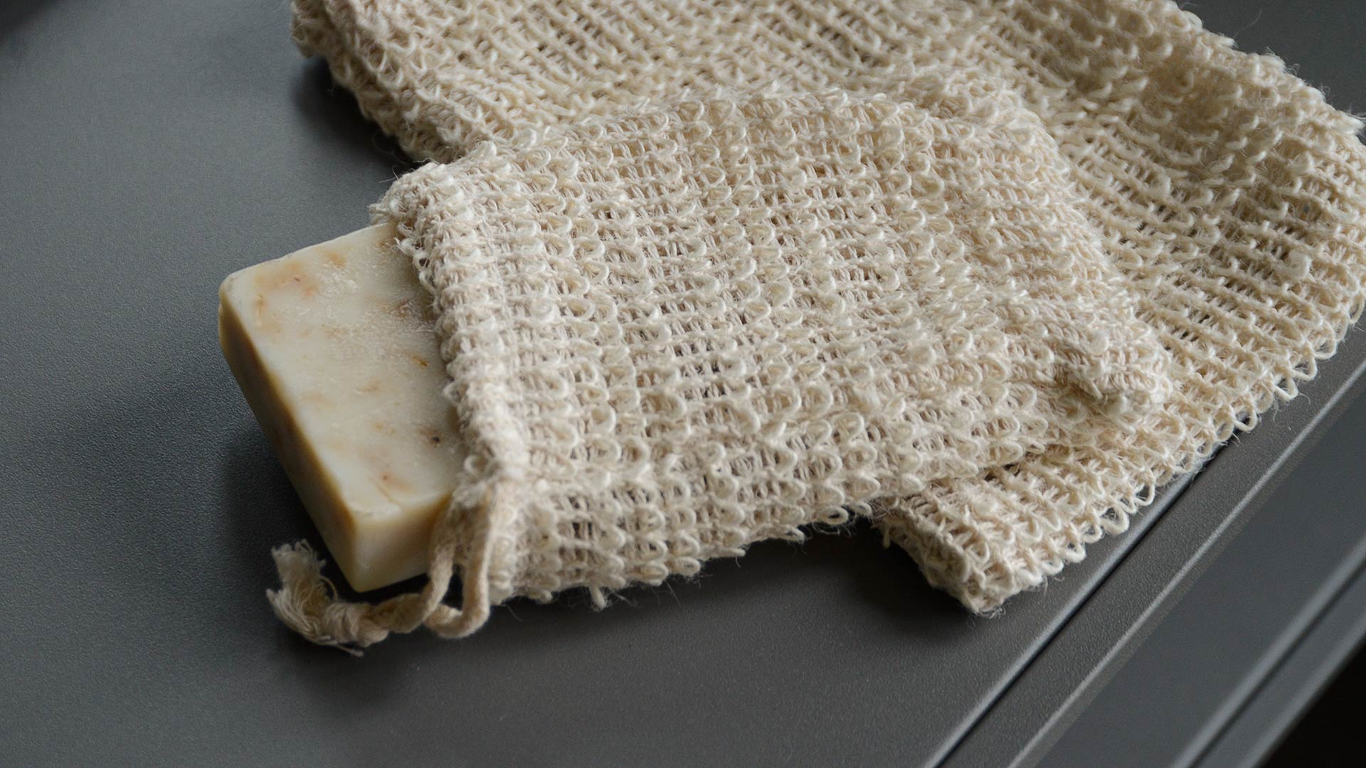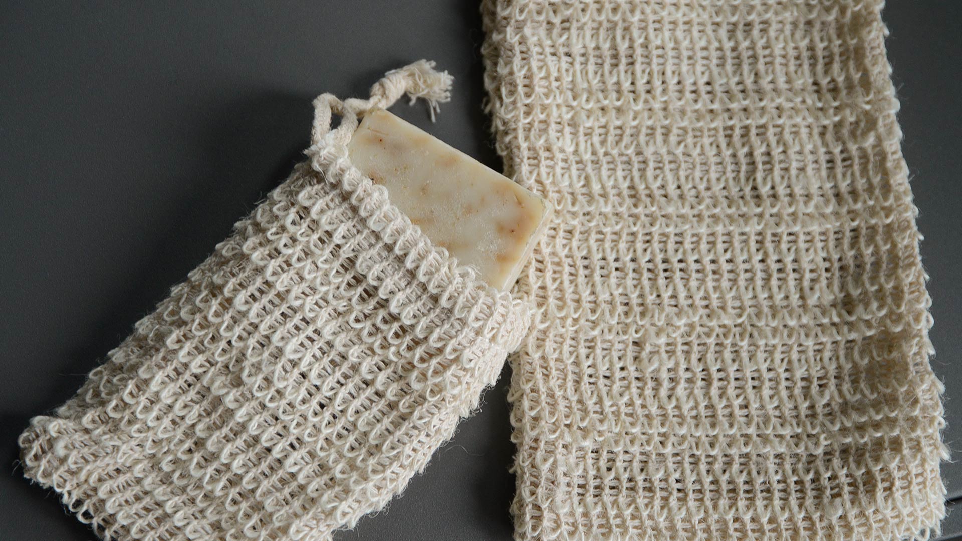 A set of exfoliating bath or shower mitts in 100% natural hemp. The set includes one small exfoliating drawstring bag and one large exfoliating mitt. For use with your favourite soap bar or body wash.