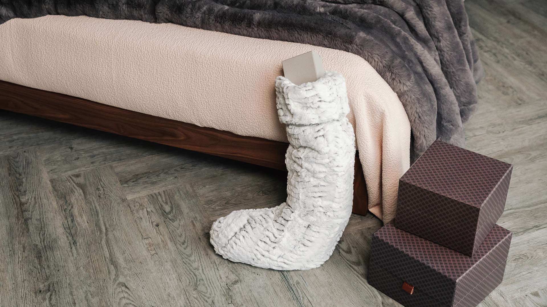 A cosy, faux fur Christmas stocking in a white ‘fur’ with hints of dark grey. This snuggly stocking has a classic turn over top, hanging loop and is lined with soft velvet look, mid grey fabric. Add a touch of luxury to your space or fill with presents to gift to loved ones!