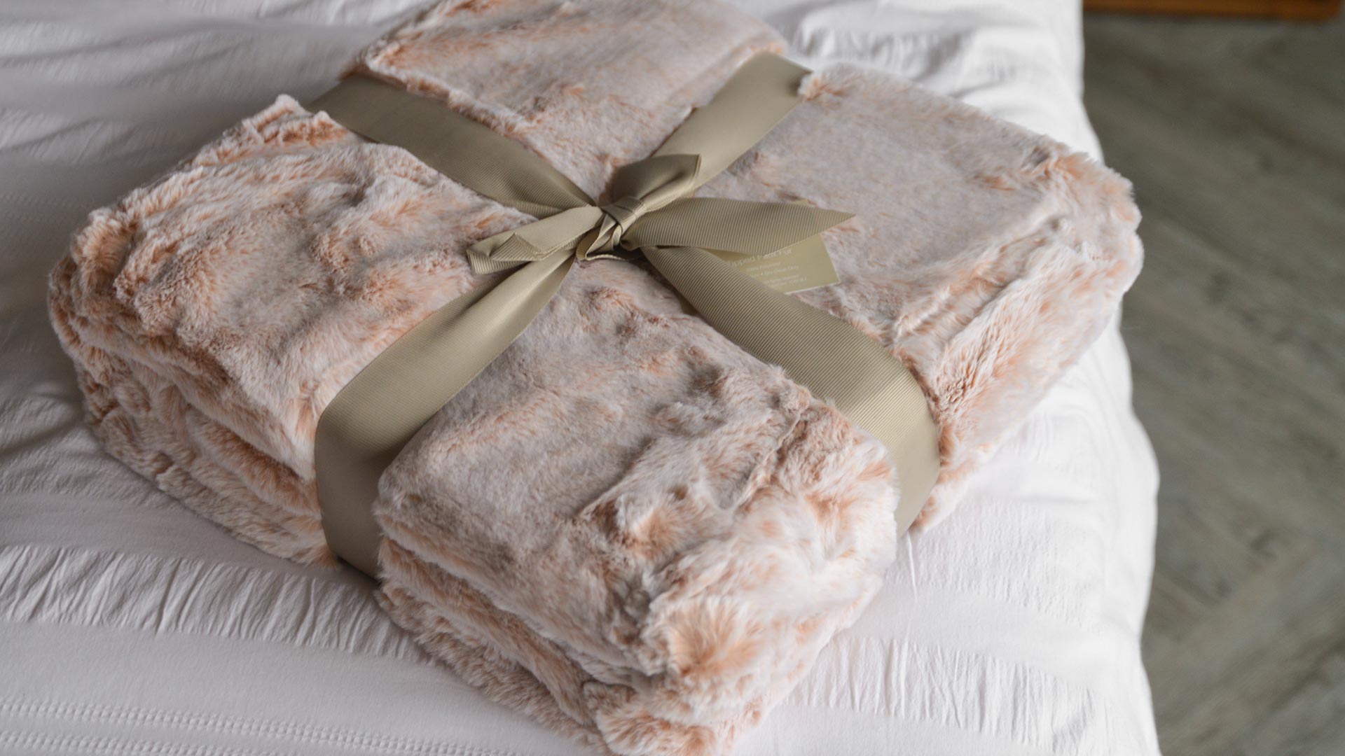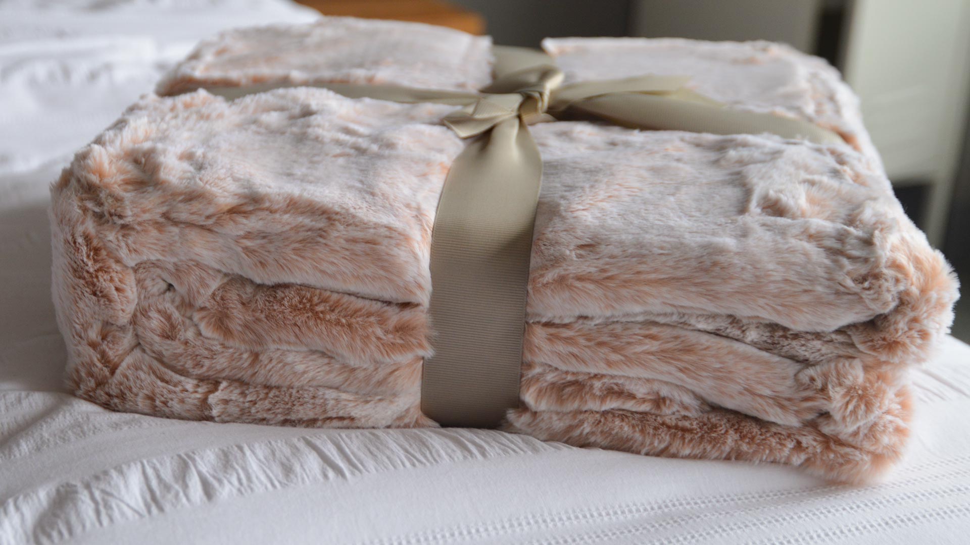 A plush, faux fur throw, available in a warm blush shade with very pale tips. The reverse is in a soft ‘velvet feel’ fabric in deep blush.