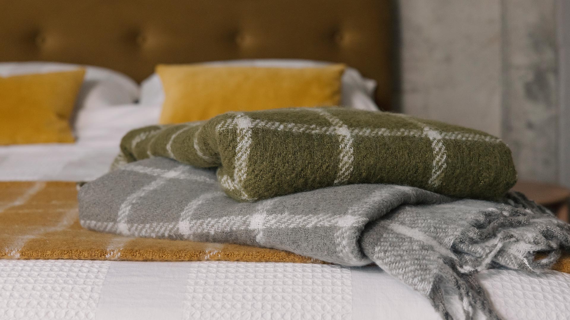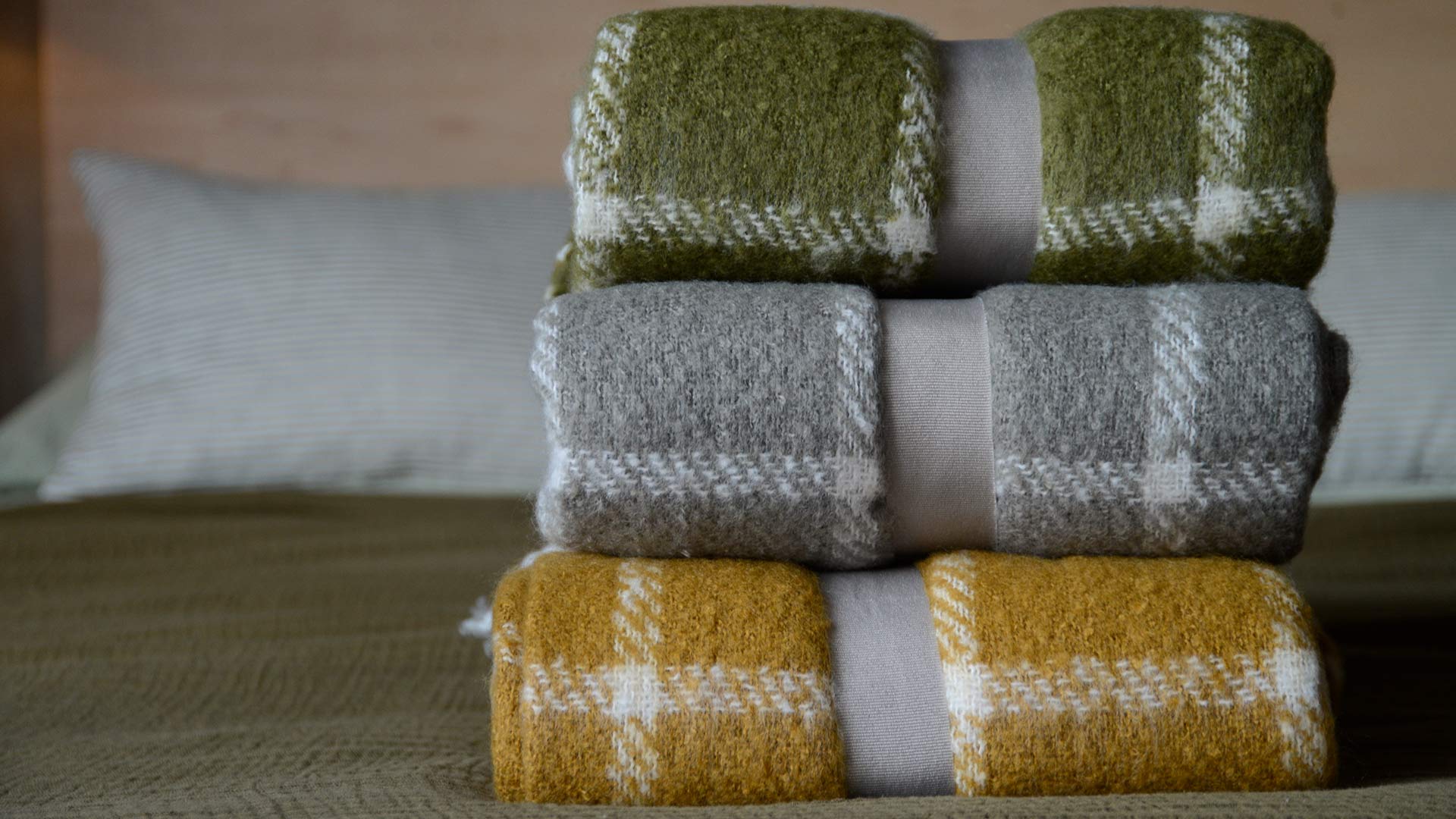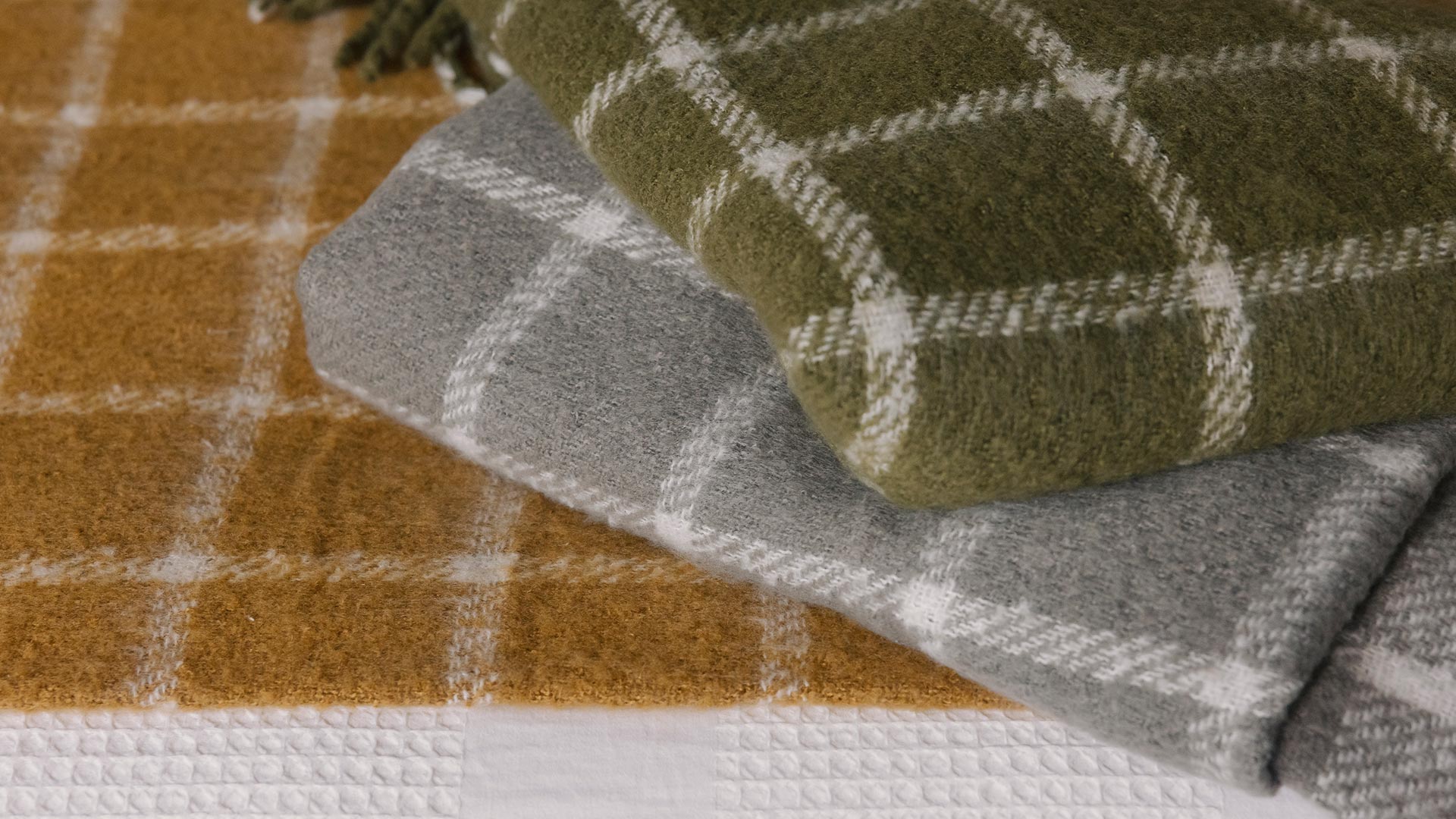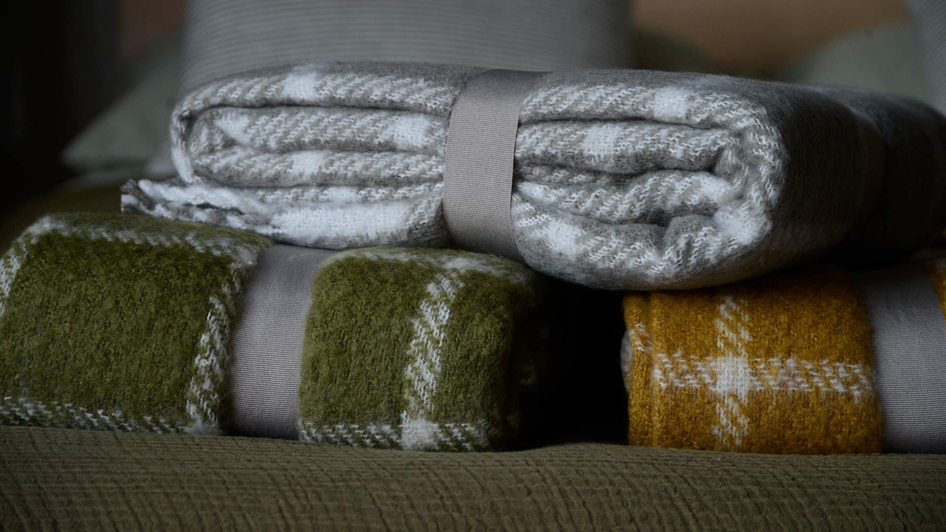 Gently textured and classic, these throws have a soft mohair texture. Available in three colours; olive green, moss grey or ochre. Each finished with a soft white chequered pattern. Perfect for cuddling up on the sofa on cooler nights.