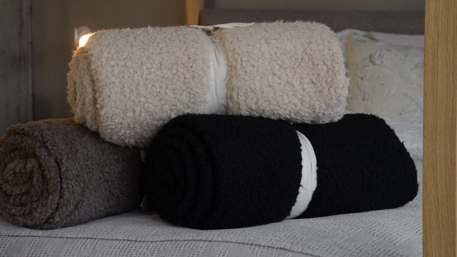 Luxurious and incredibly soft, cosy throws made using a snuggly faux sheepskin fabric. Available in a pale caramel colour, a deep msuhroom shade and classic black.