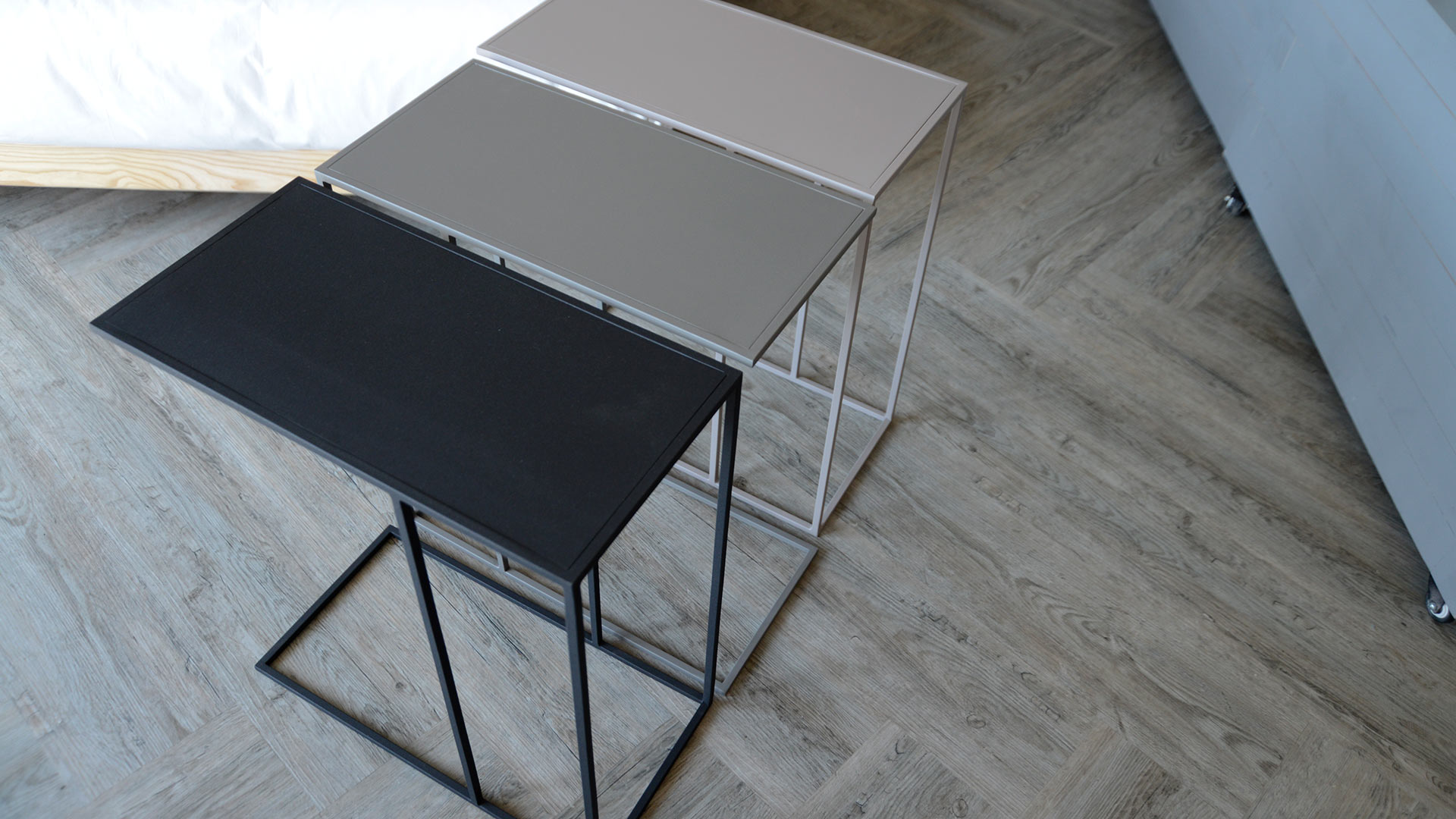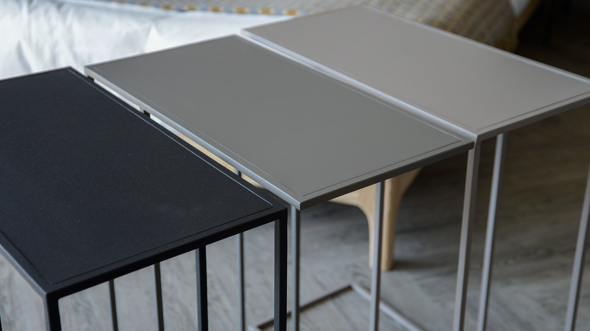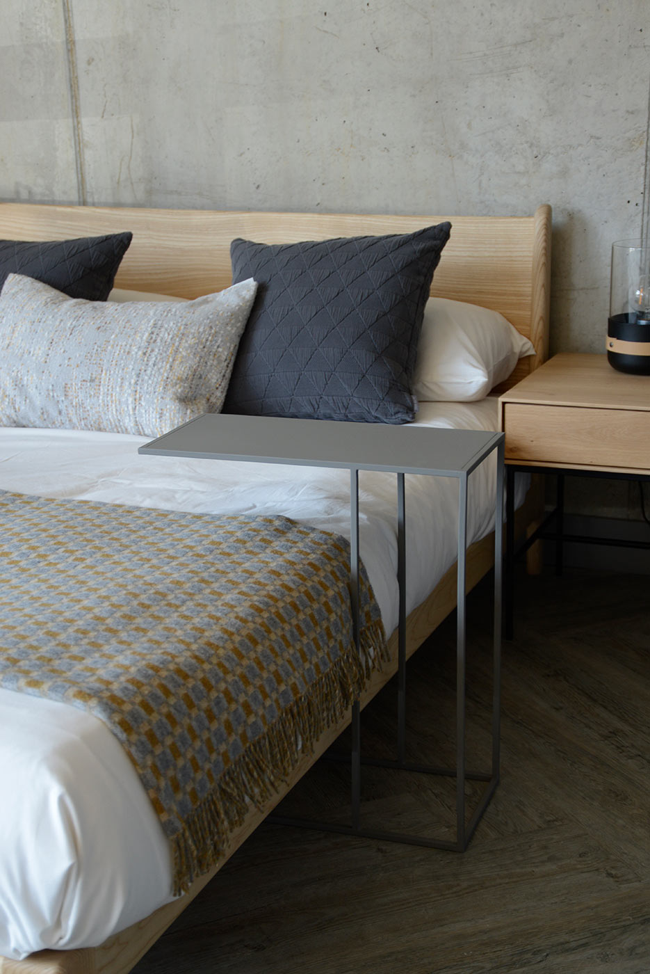 These stunning Fera tables will look fantastic in any modern bedroom or lounge. They particularly suit low beds where the top can sit over the mattress. Steel tables powder coated in the following colours: slate (almost black), warm grey or dove grey (a slightly paler grey with a hint of lilac).