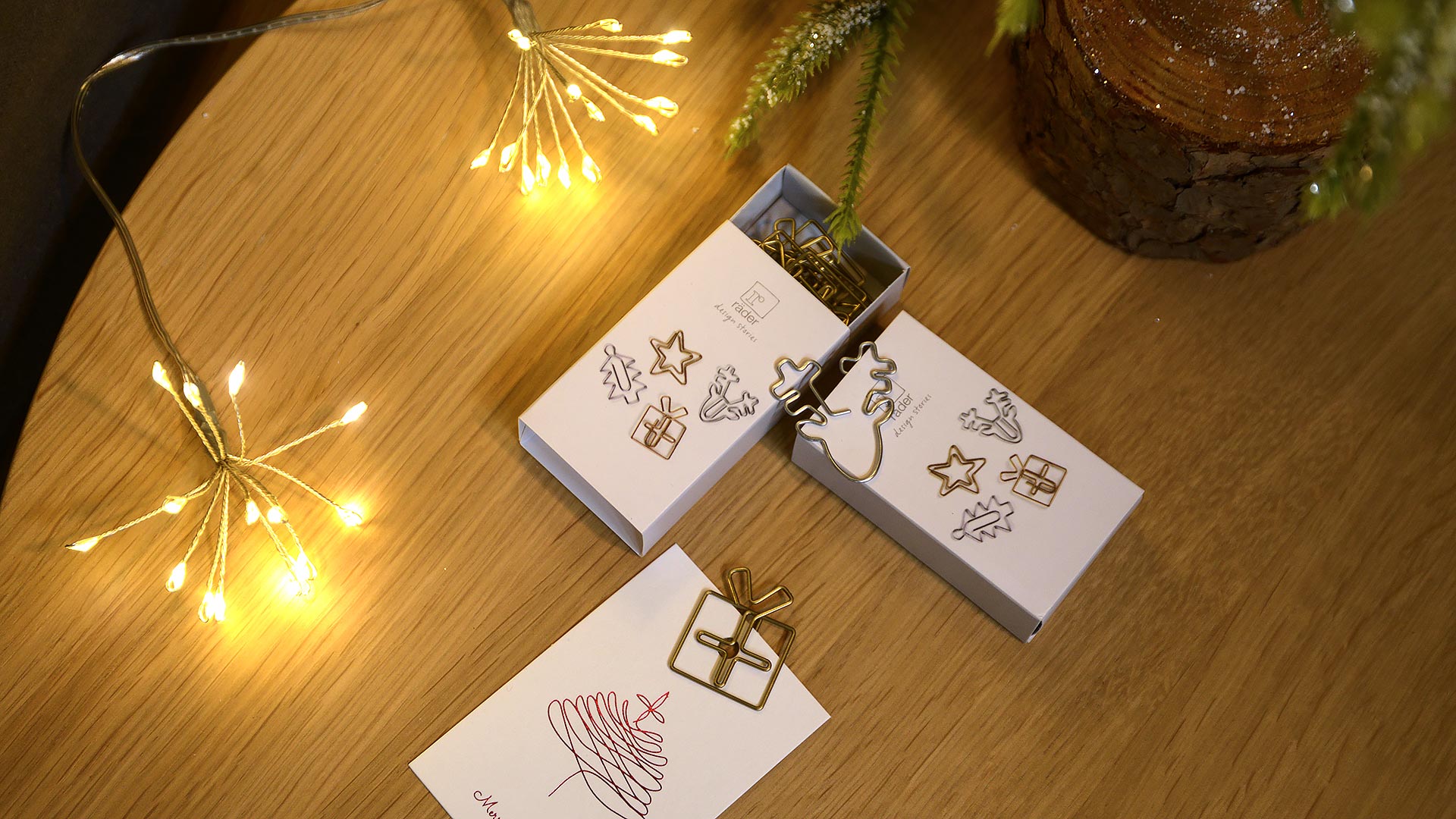 Adorable little silver reindeer paperclips and gold gift shaped paperclips – perfect as a stocking stuffer, secret Santa or to send festive notes. Presented in a sweet matchbox style package, each box contains 15 festive paperclips.