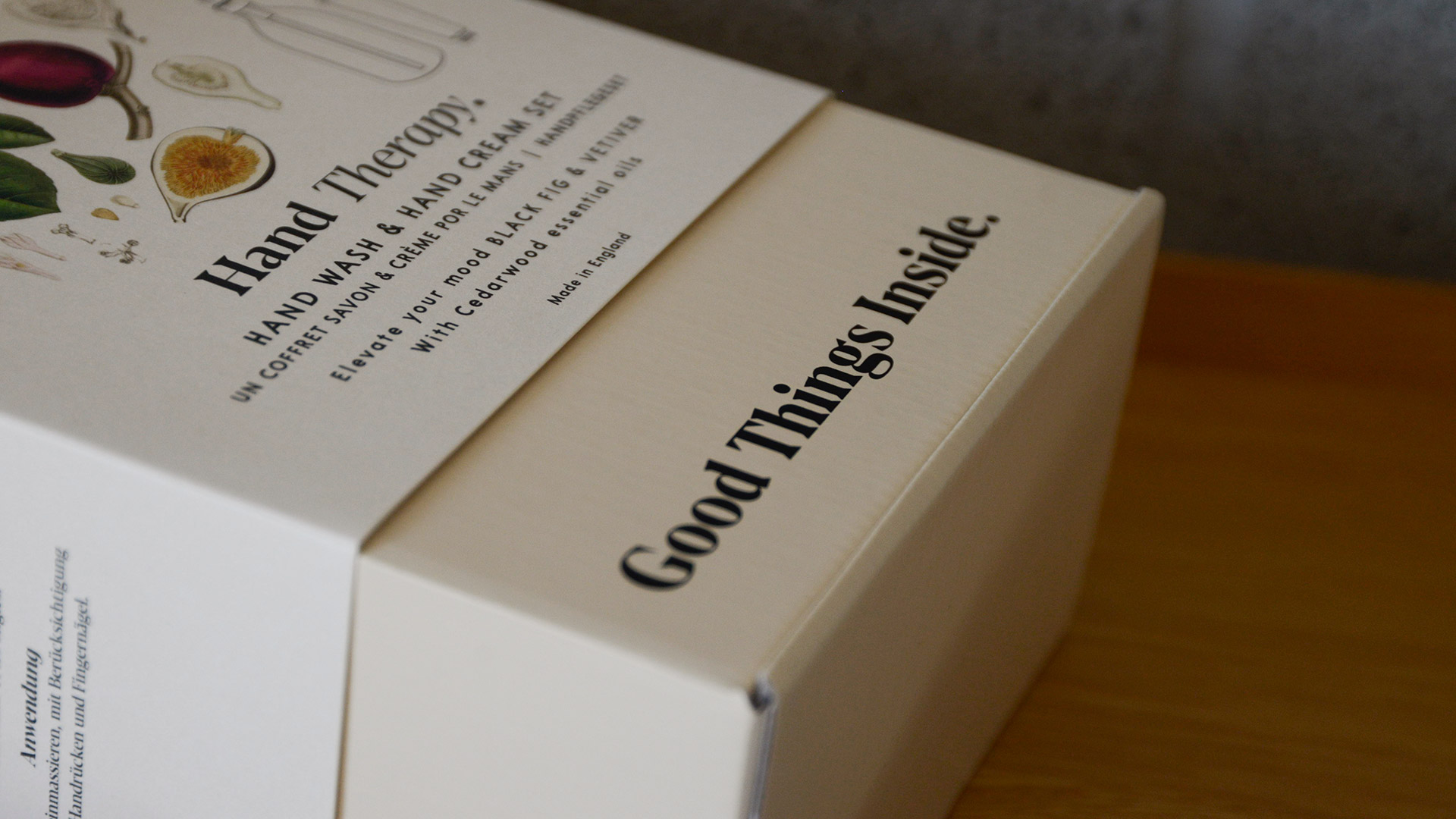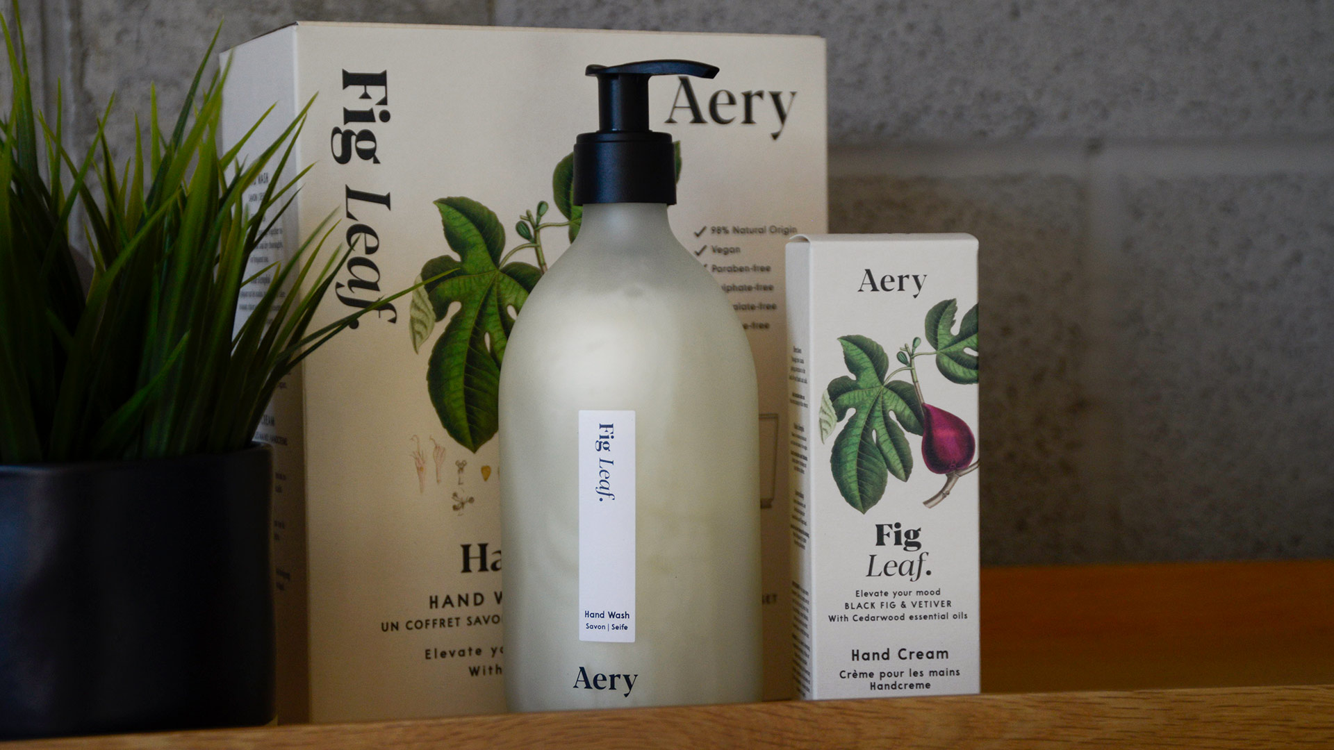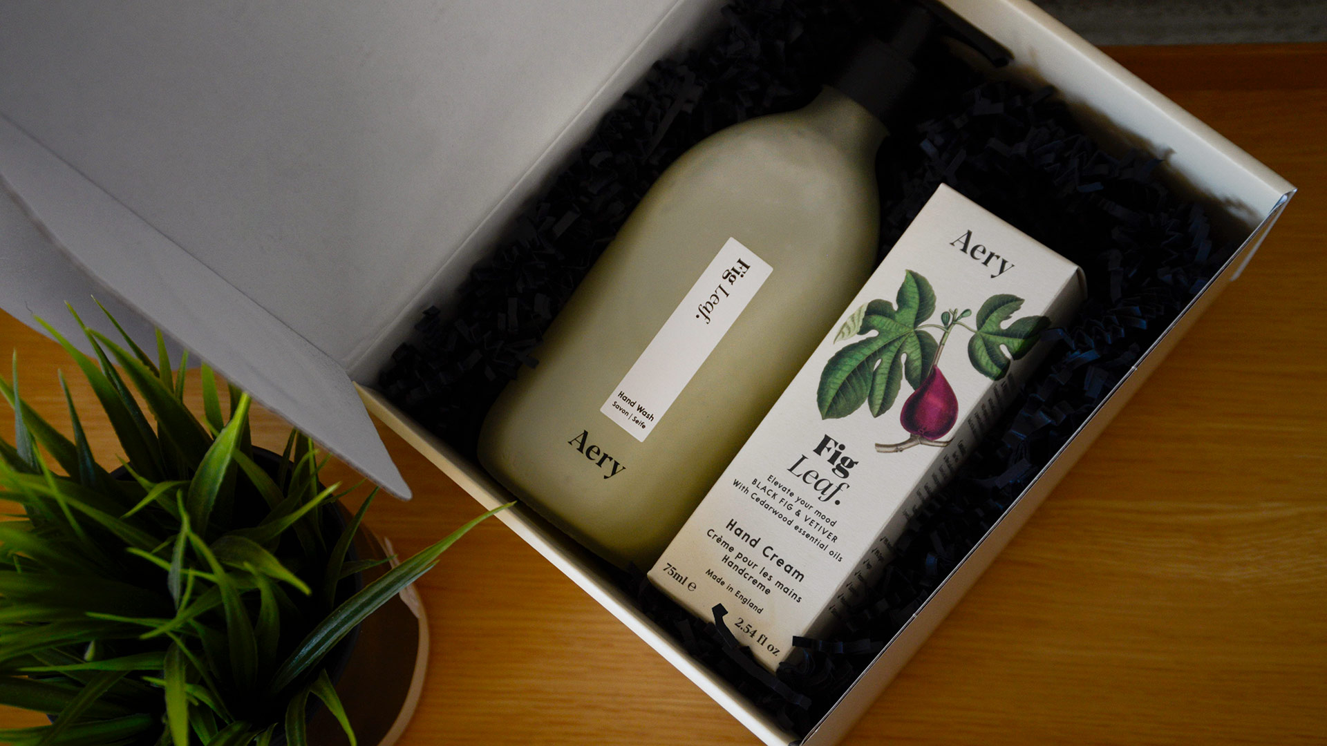 A luxurious fig leaf hand care set with a fresh, fruity scent. A beautifully packaged set including a hand wash in a stylish glass dispenser, and a deeply moisturising hand cream.