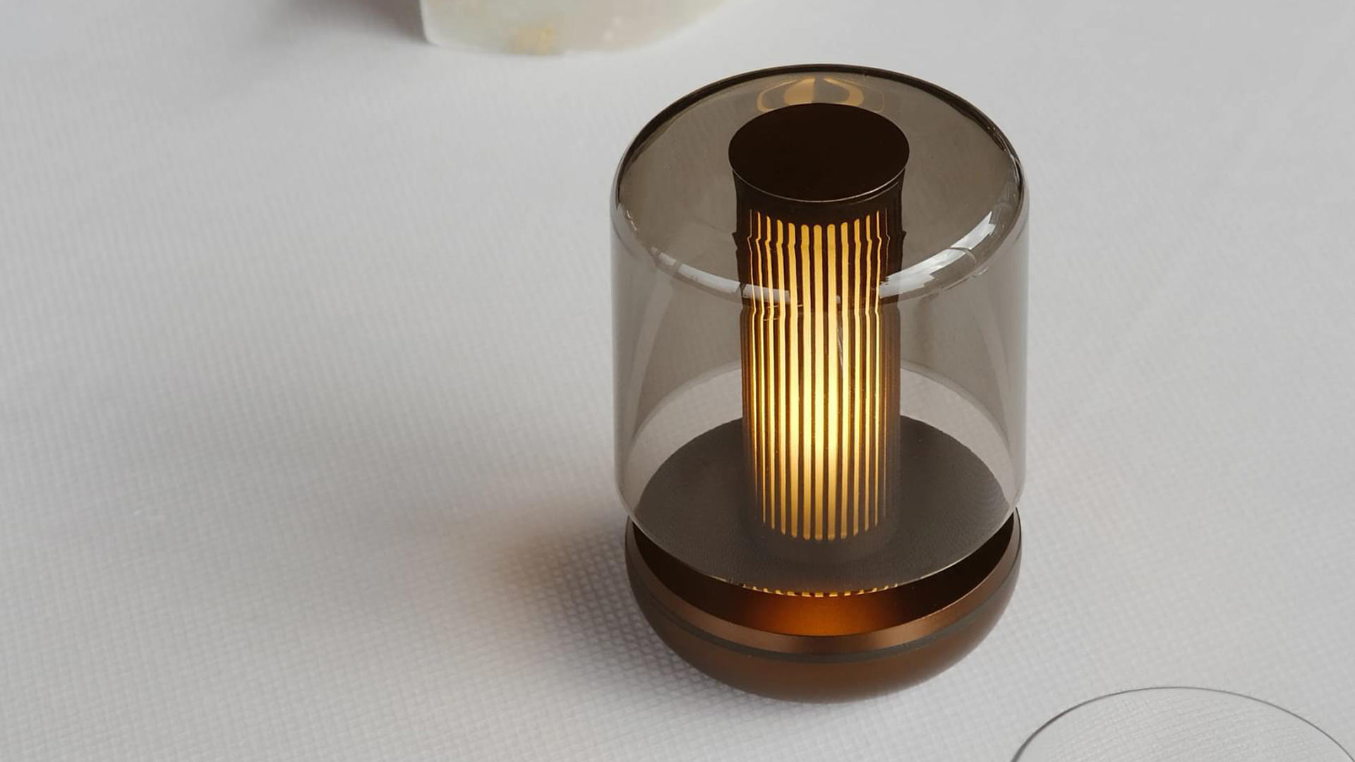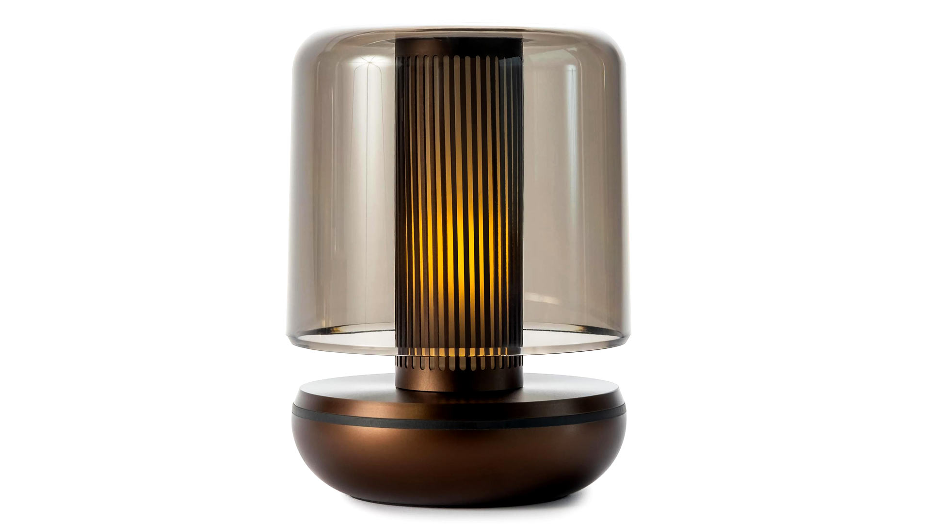 This sweet, portable mini light from Humble is the perfect partner for your daily routines. Either carry it from room to room as needed, or use as a feature on bookshelves or mantelpieces. It is rechargeable, with USB charging cable included. A dark bronze base with a smoked glass provide a luxurious, mid century look. With 3 dimmable settings, you can create the perfect cosy atmosphere. Suitable for indoor and outdoor use (IP65 waterproof)