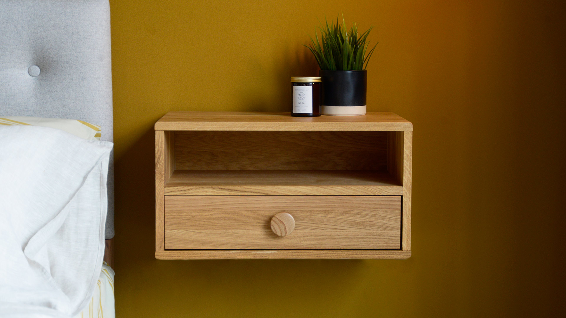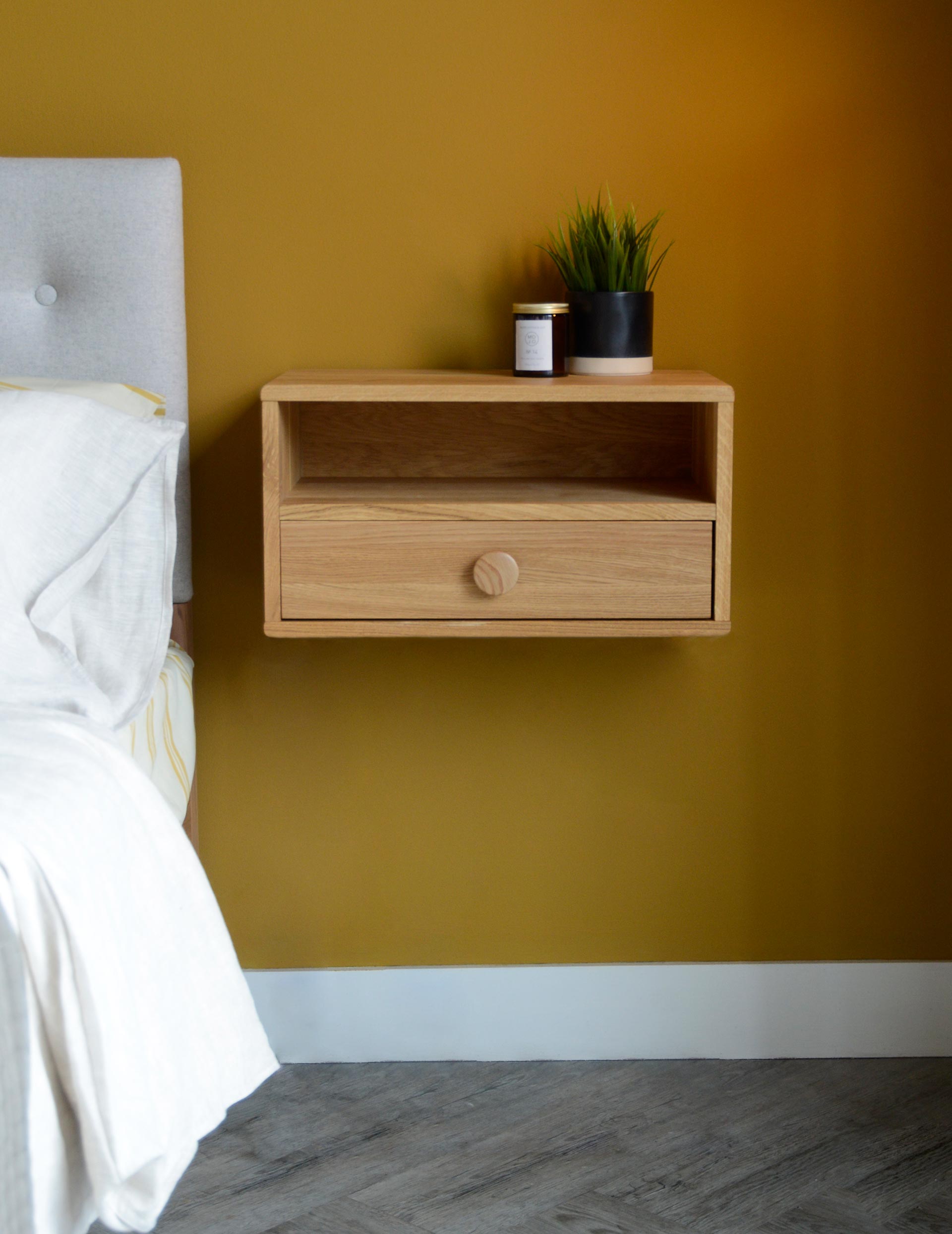 A simple yet stylish design, these solid oak units can be attached to the wall as minimalist floating bedside tables, or left freestanding to compliment a low bed. Featuring either one drawer and a shelf, or two storage drawer, these units boast a minimalist, gently curved design.