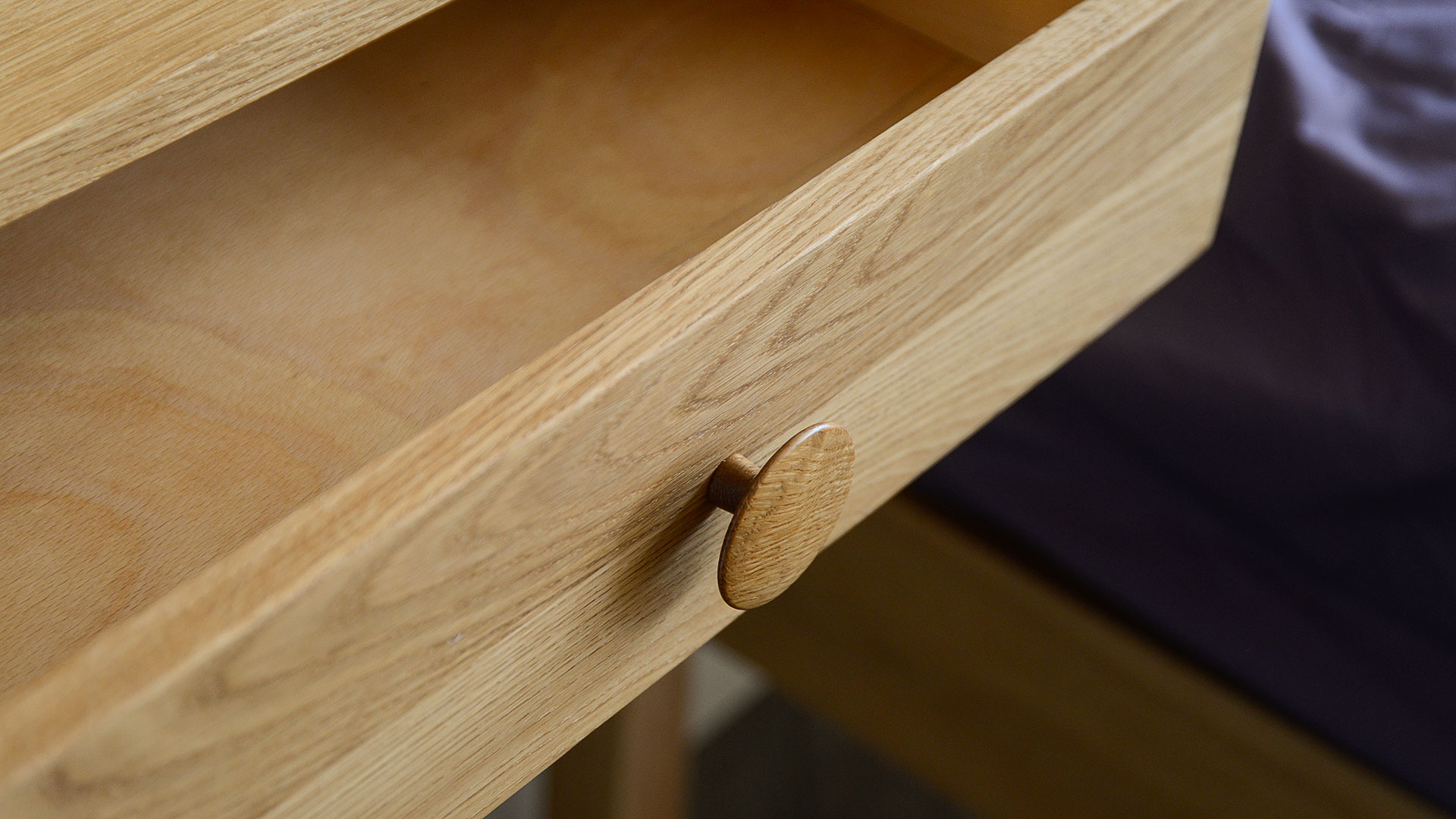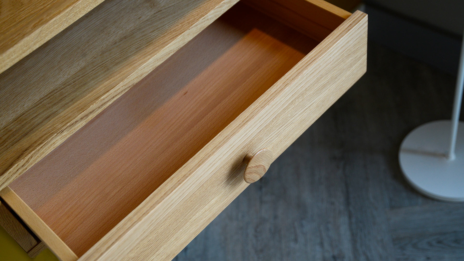 Made from solid oak with an oiled finish. These drawer units are slightly darker in tone than our own oak timber. However, as oak naturally warms and deepens over time, we feel these make a great match together.