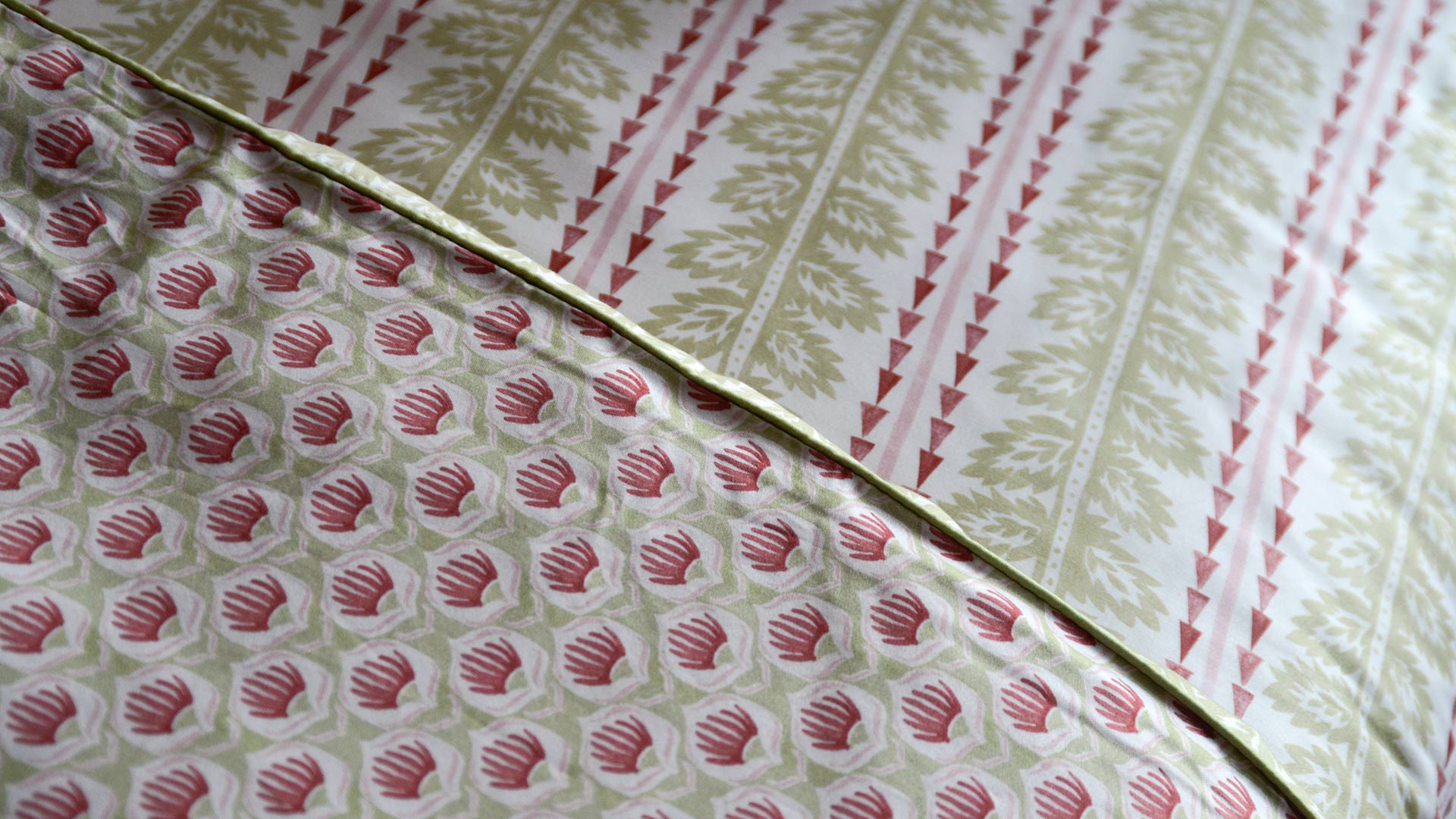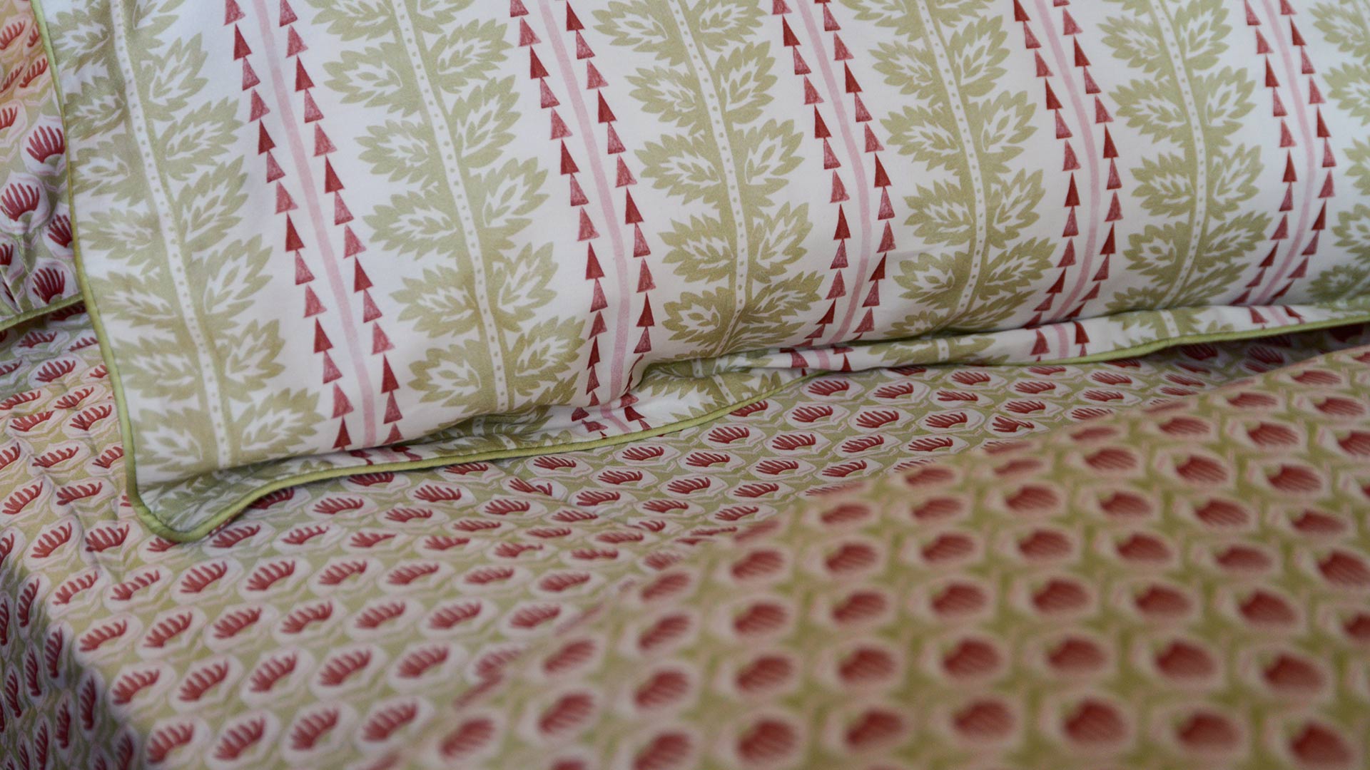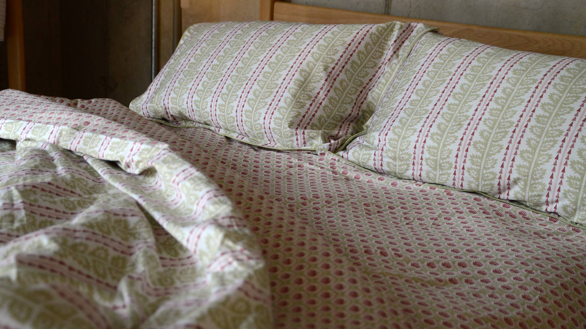 Duvet cover and pillowcases: a green leaf stripe pattern with deep pink bands to one side, deep pink mini flower pattern with a light olive background. Fitted sheet: deep pink mini flower pattern with an ivory and light olive background