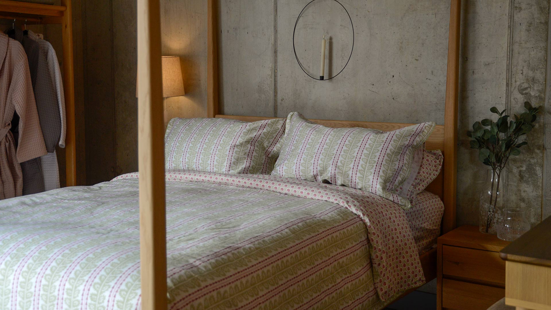 The Flora bedding collection includes duvet cover and fitted sheet sets available in a standard UK double and kingsize. Made from 100% sateen cotton, this collection includes a reversible duvet cover with matching pillowcases. The fitted sheet matches the reverse side of the duvet set, and its two pillowcases are identical to the ones included in the duvet cover set.