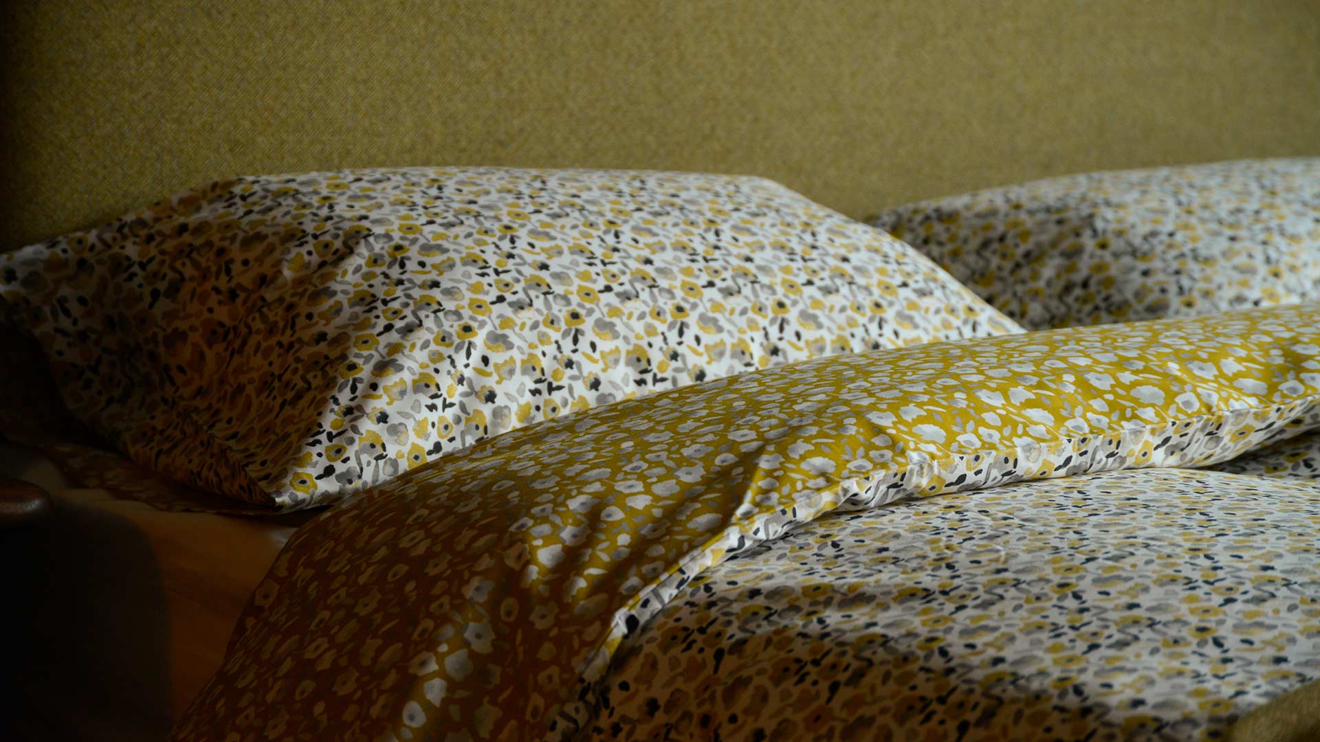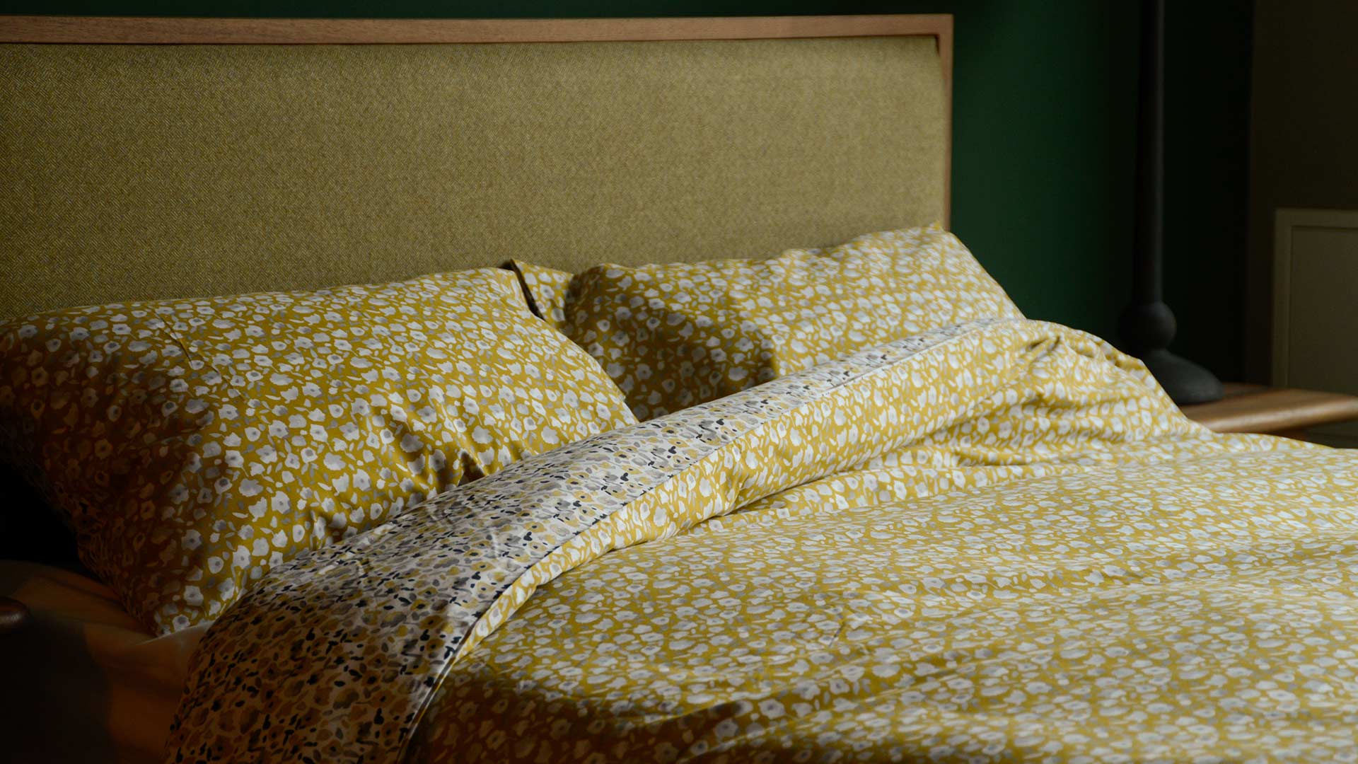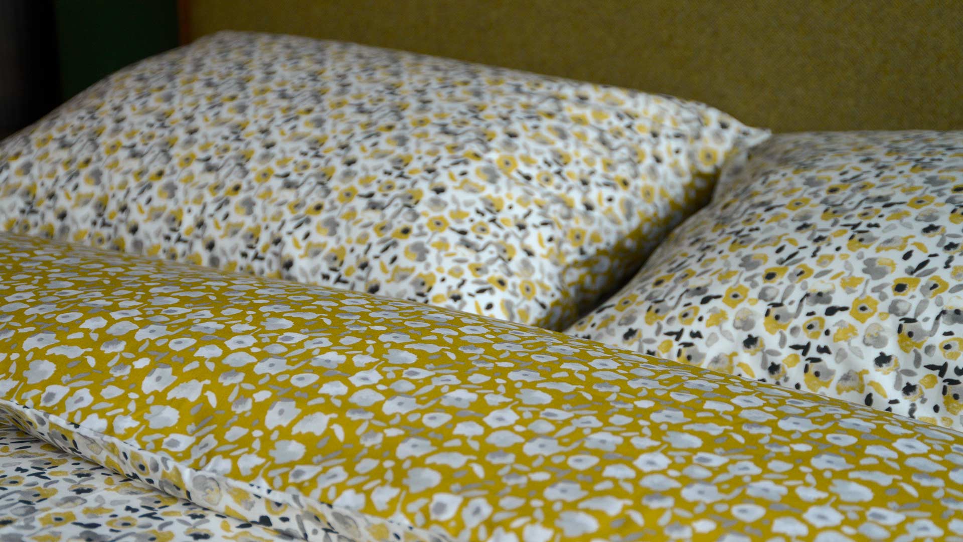 A reversible duvet set with a modern floral pattern. One side has an ivory background with black. grey and mustard yellow flowers. The reverse has a mustard (deep yellow with a subtle greenish tone) background with pale grey and ivory flowers.