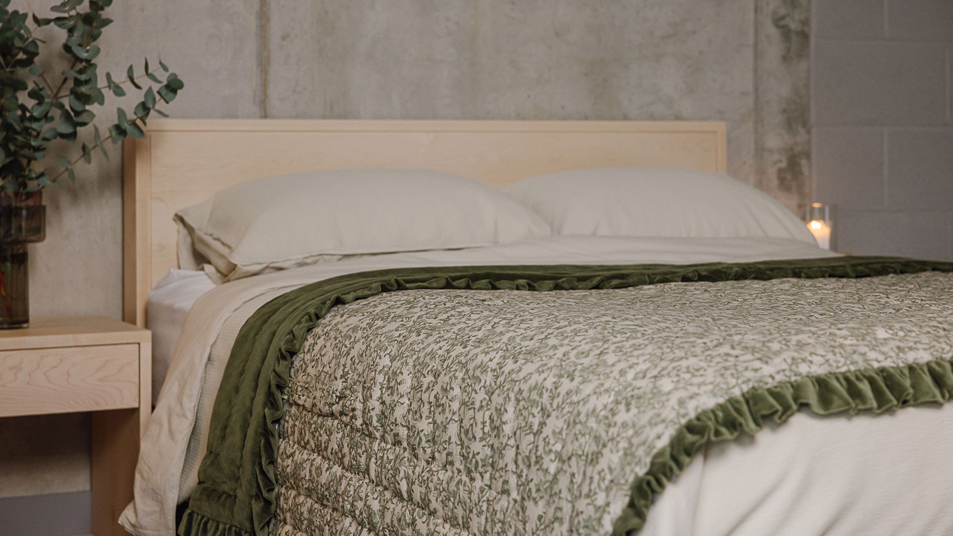 A bold, timeless bedspread in a gorgeous combination of pale beige and green florals to the front and a lush, olive green velvet to the reverse. Finished with a velvet ruffle to all edges for a traditional twist. More information can be found below.