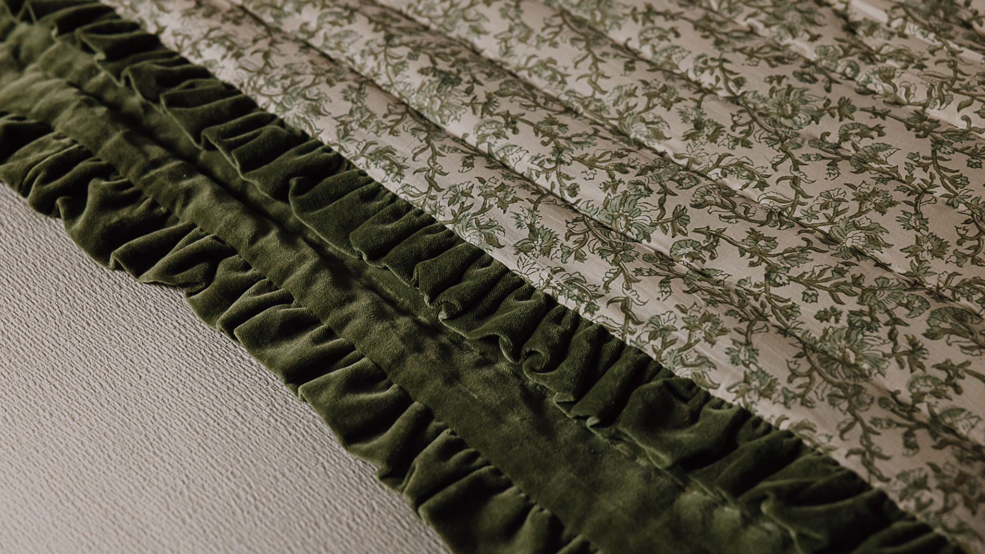Plush, generously sized and luxurious. This bedspread features a small scale floral design in varying, muted green tones to the front and a rich, olive green velvet to the reverse. Finished with a ruffle border to the edges in the same green velvet, this bedspread is the perfect traditional accent piece. The front is in a fine weave and the reverse is crafted from a heavier cotton velvet.
