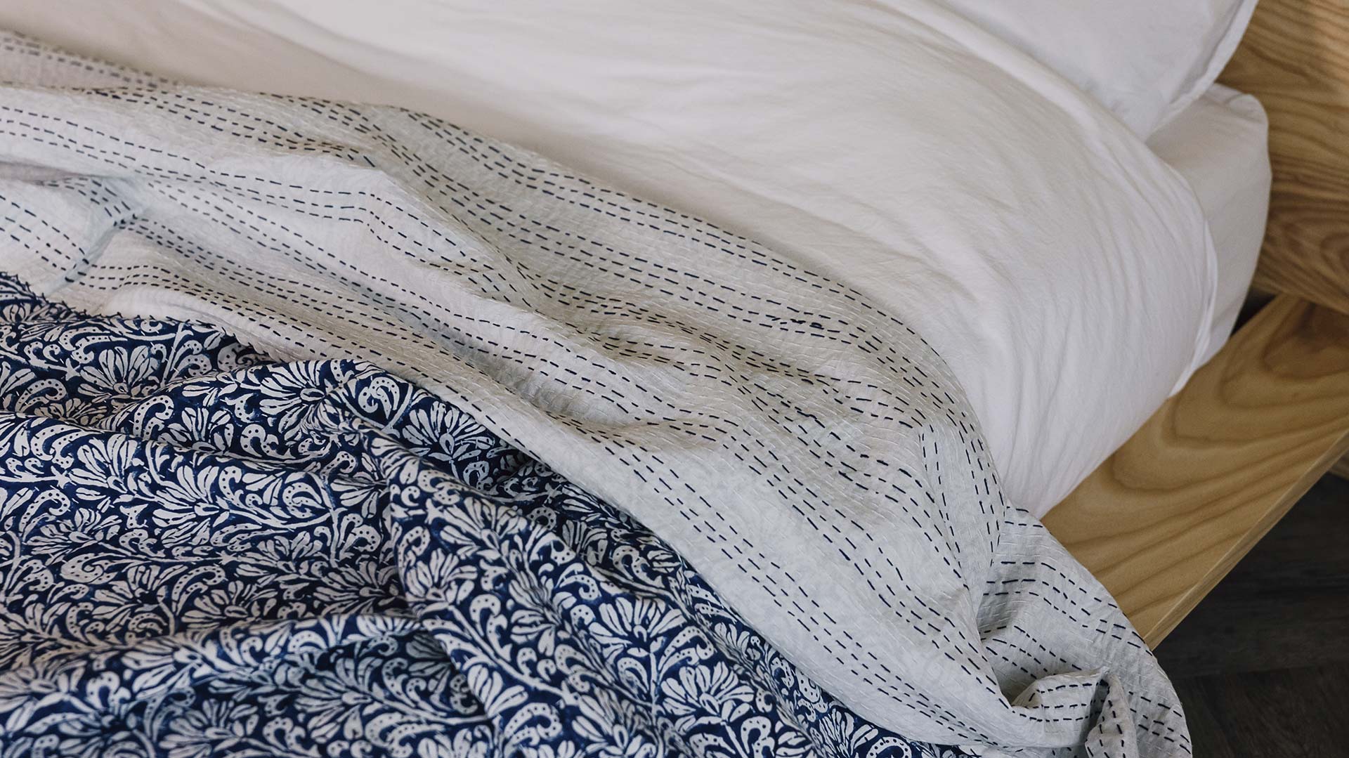 All bedspreads are reversible – the reverse side features the same white background with the kantha-style stitching in white and blue or green.