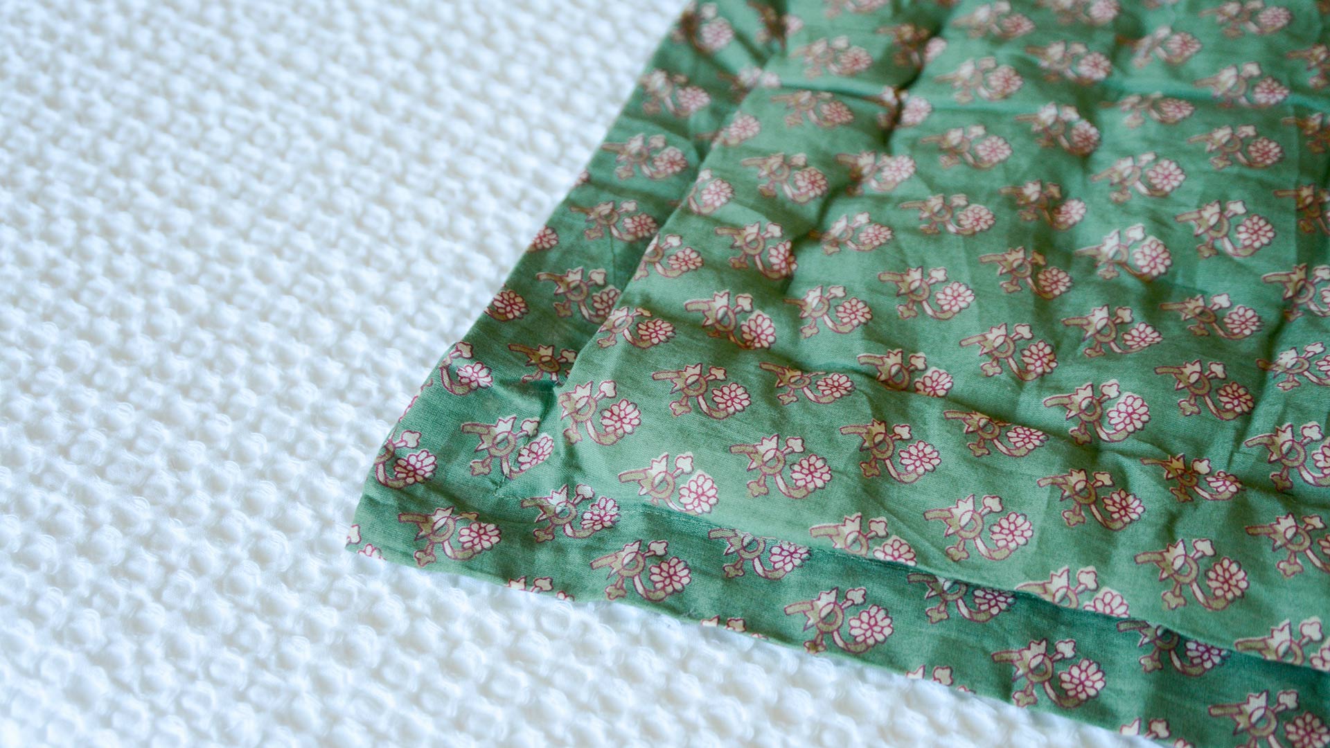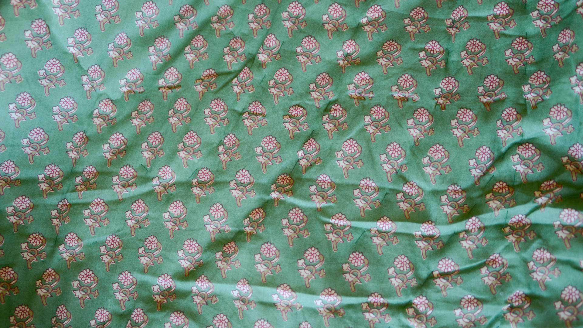 Green: a beige and red floral design over a grassy green background Red: a combination of floral and ornamental designs in beige and gold tones over a bold red background Yellow: a whimsical design of ochre yellow flower chains across a pale ivory background