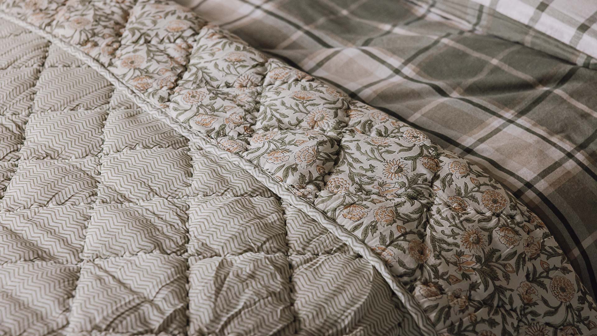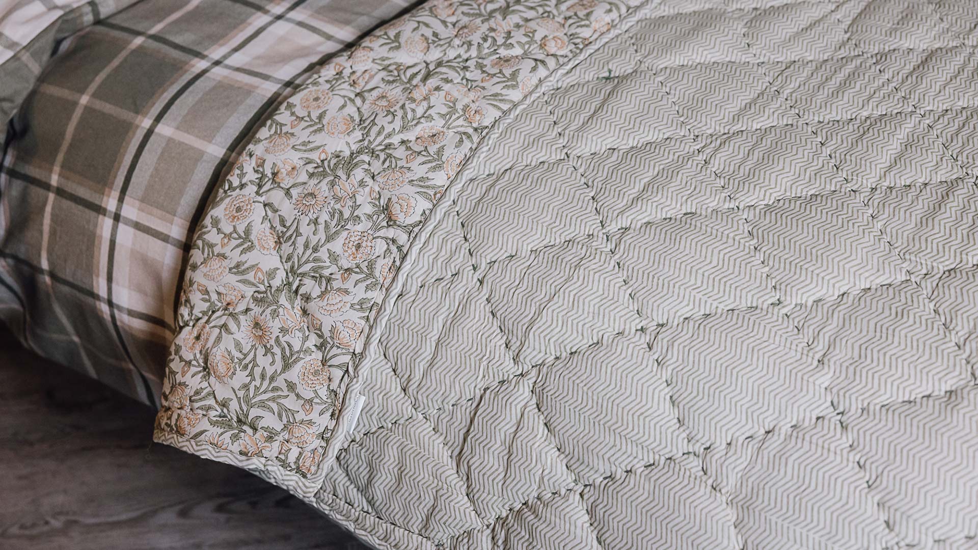 A generously sized quilted throw with a traditional floral pattern in a gorgeous combination of pale pinks and greens. Finished with a subtle zig-zag stripe pattern to the reverse in a muted green for a more modern twist. More information can be found below.