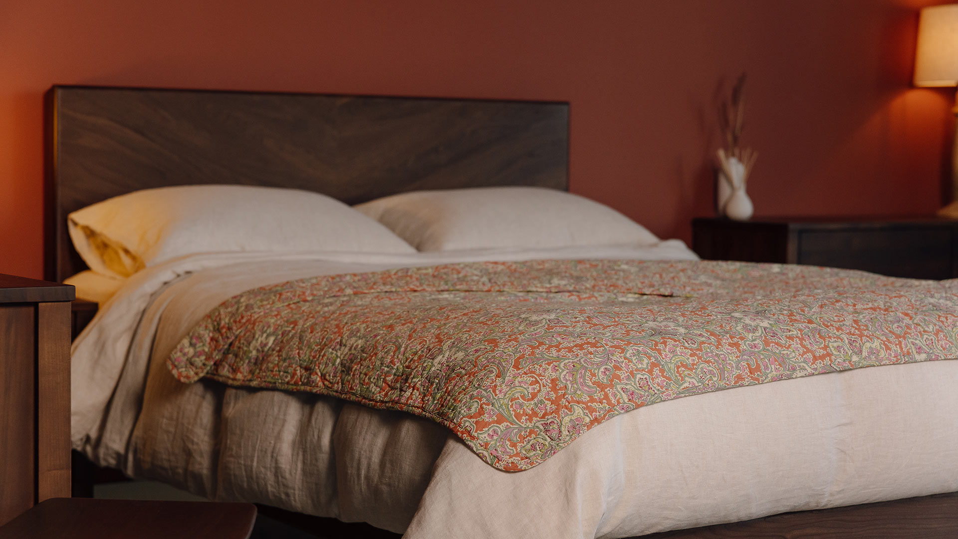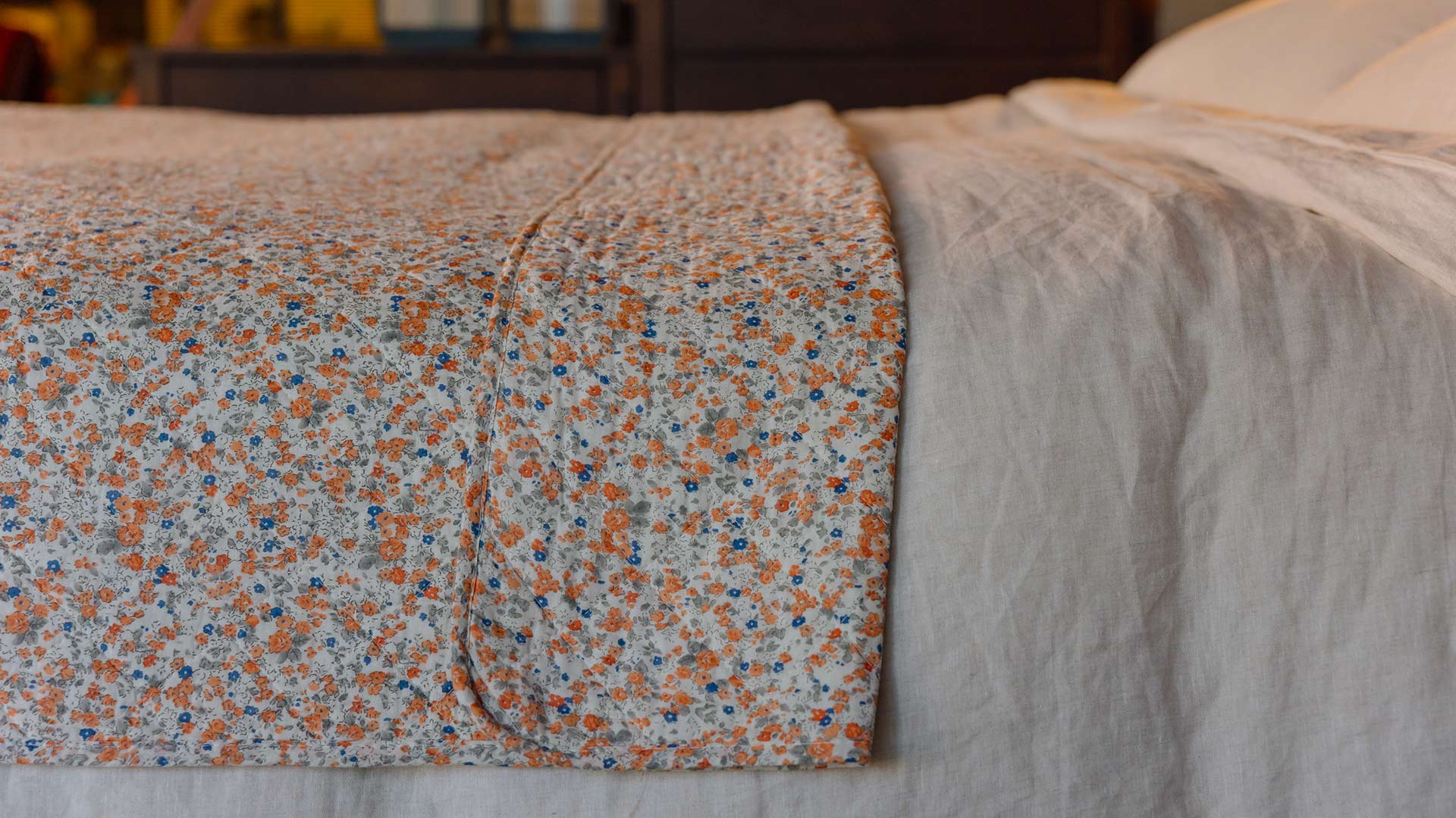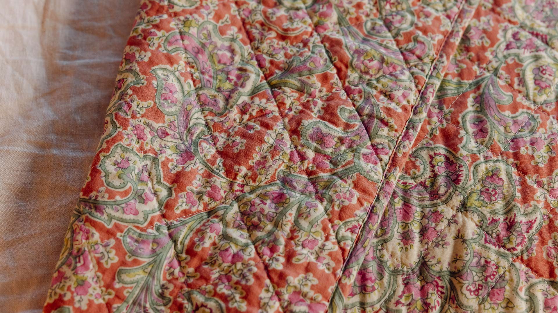 Colourful floral throws, each with a stitched design that creates a ‘quilted’ effect. Available here in three vibrant floral patterns; Orange & Blue, Muted Green and Orange Paisley.