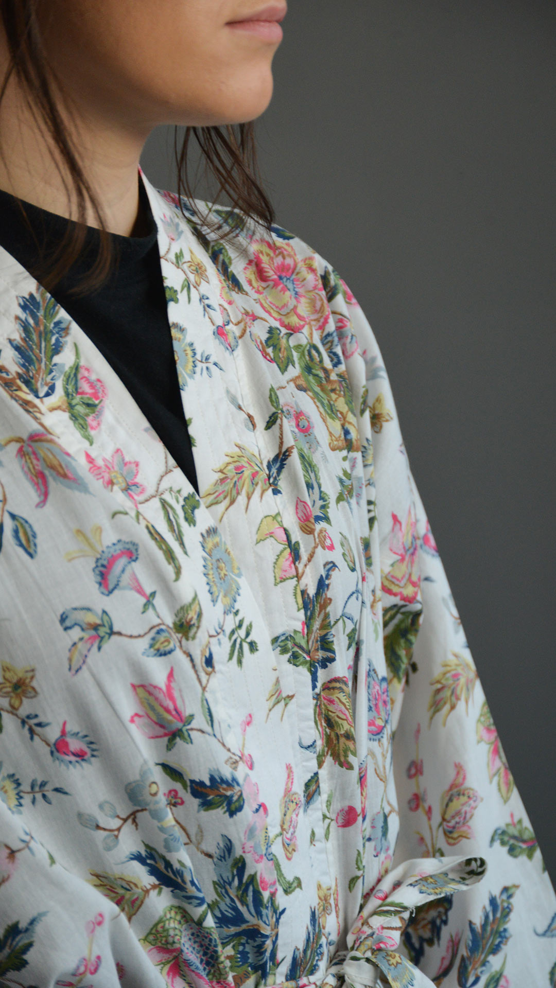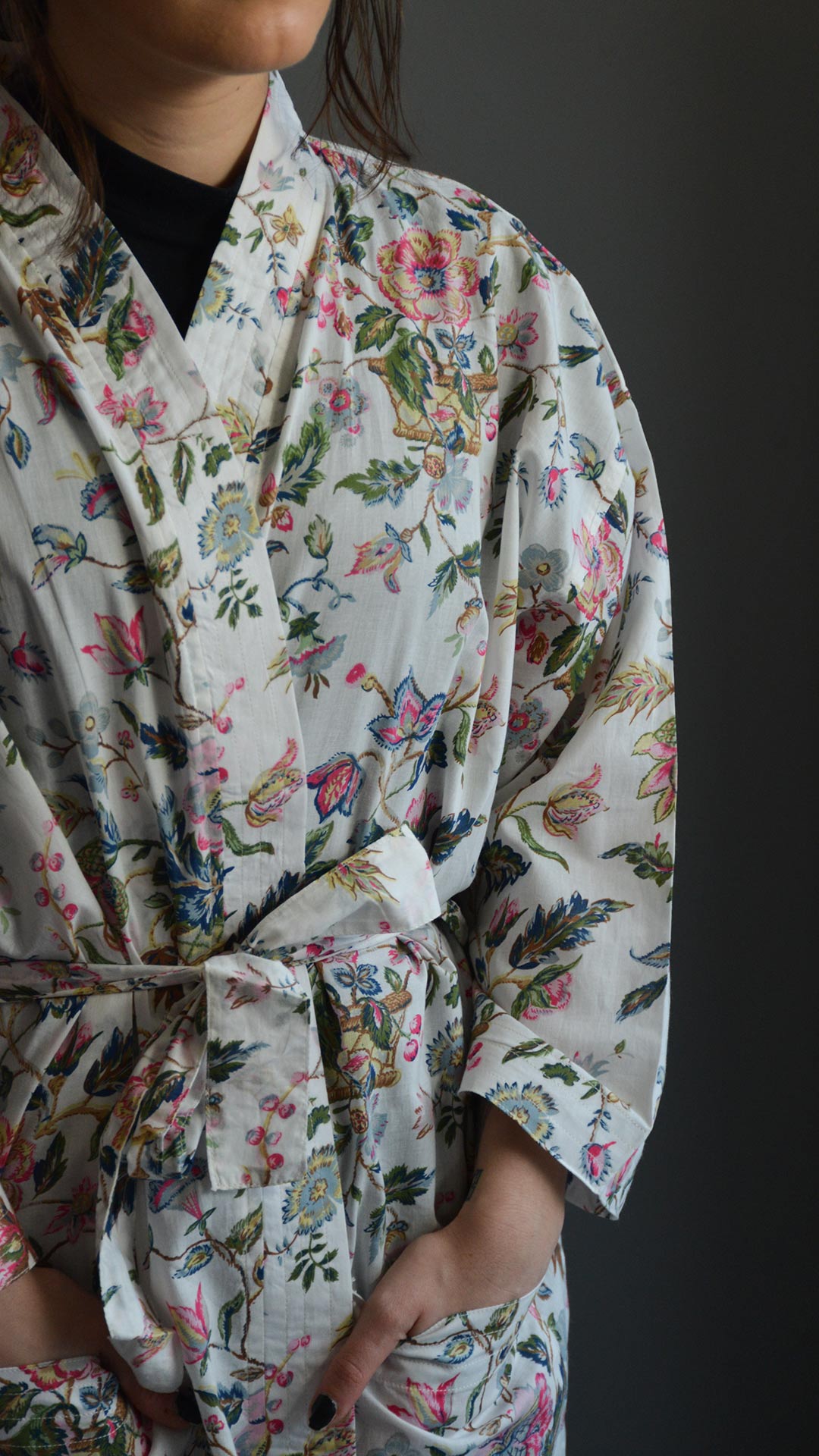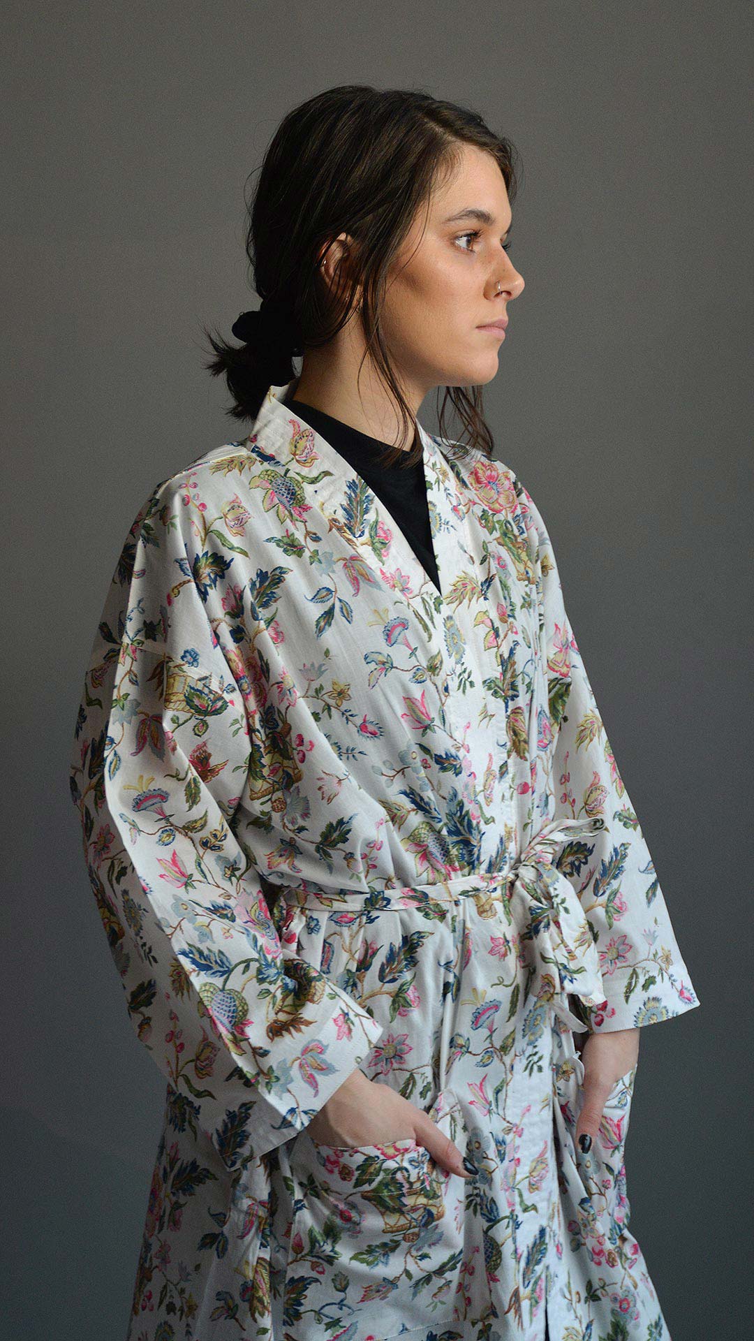 Lightweight soft cotton robe with a bold print of flowers and branches over an ivory background. The robe has two front pockets and a tie belt.