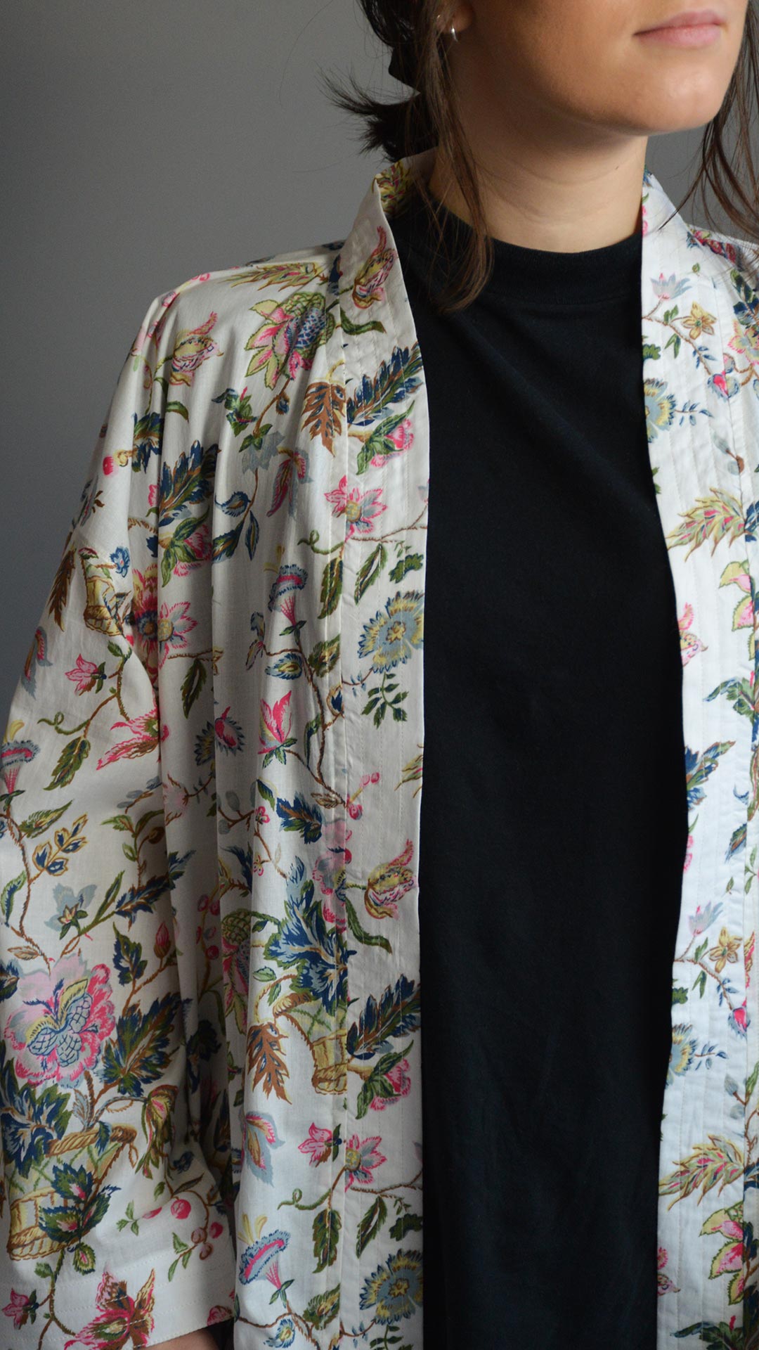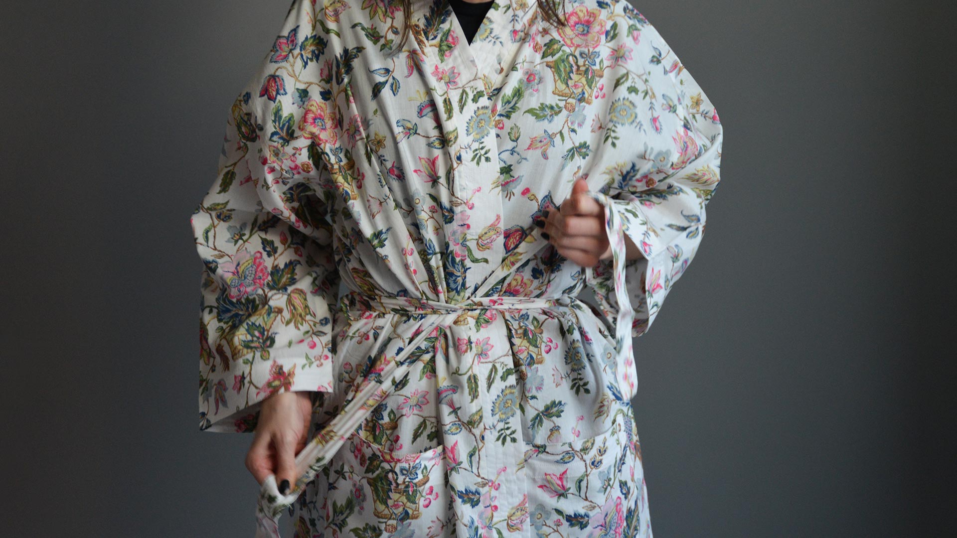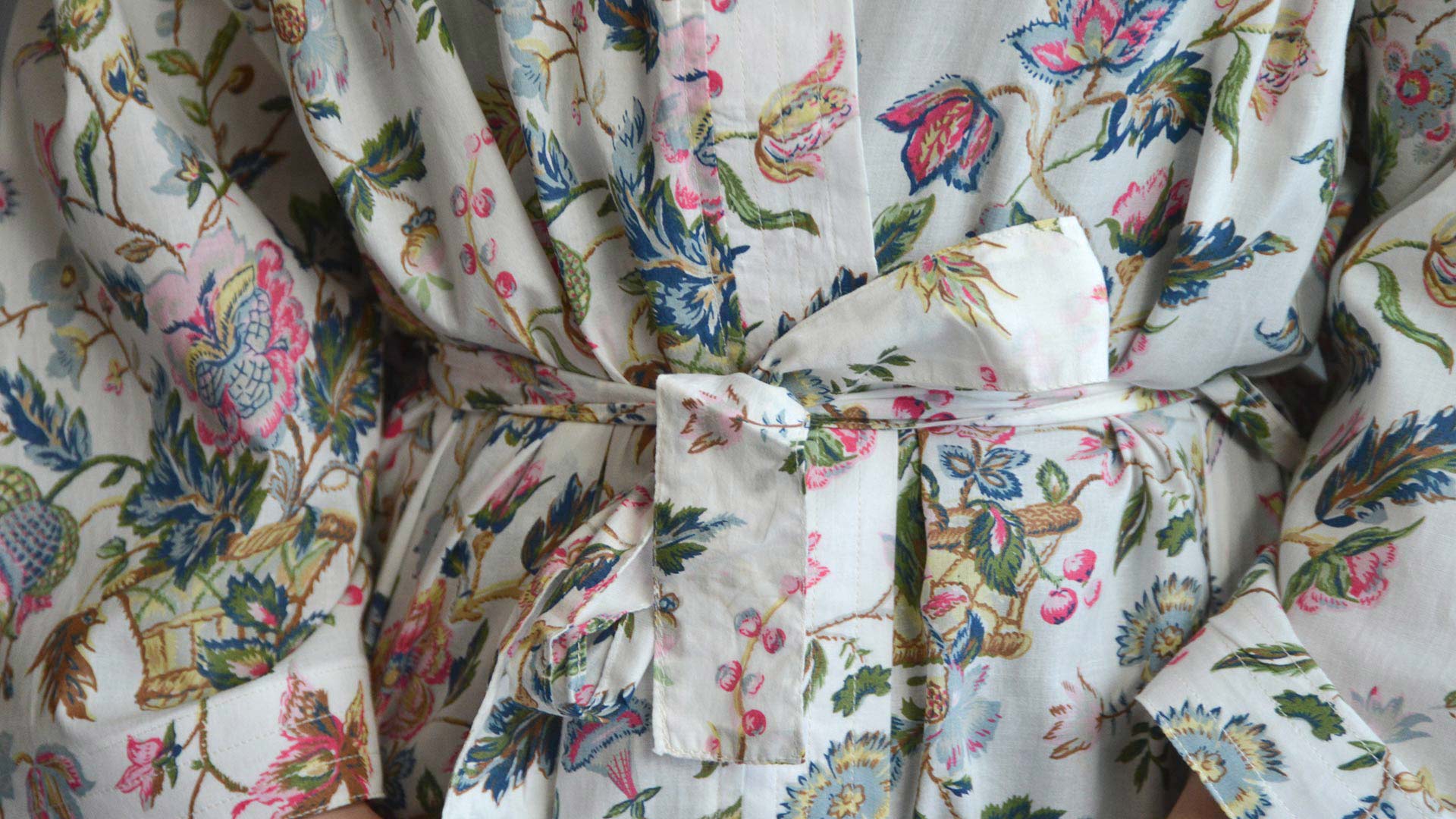 Lightweight soft cotton robe with a bold print of flowers and branches over an ivory background. The robe has two front pockets and a tie belt.