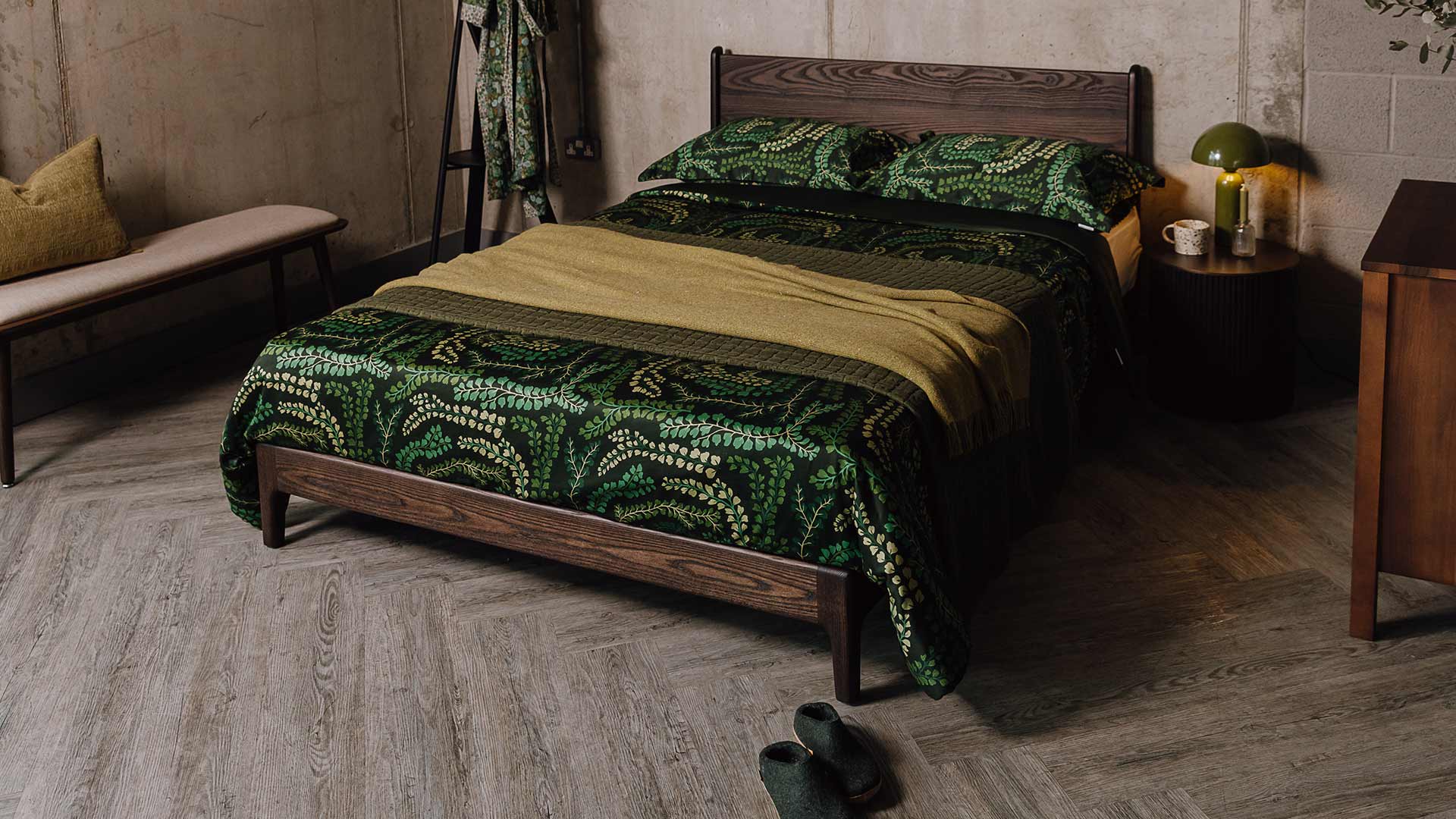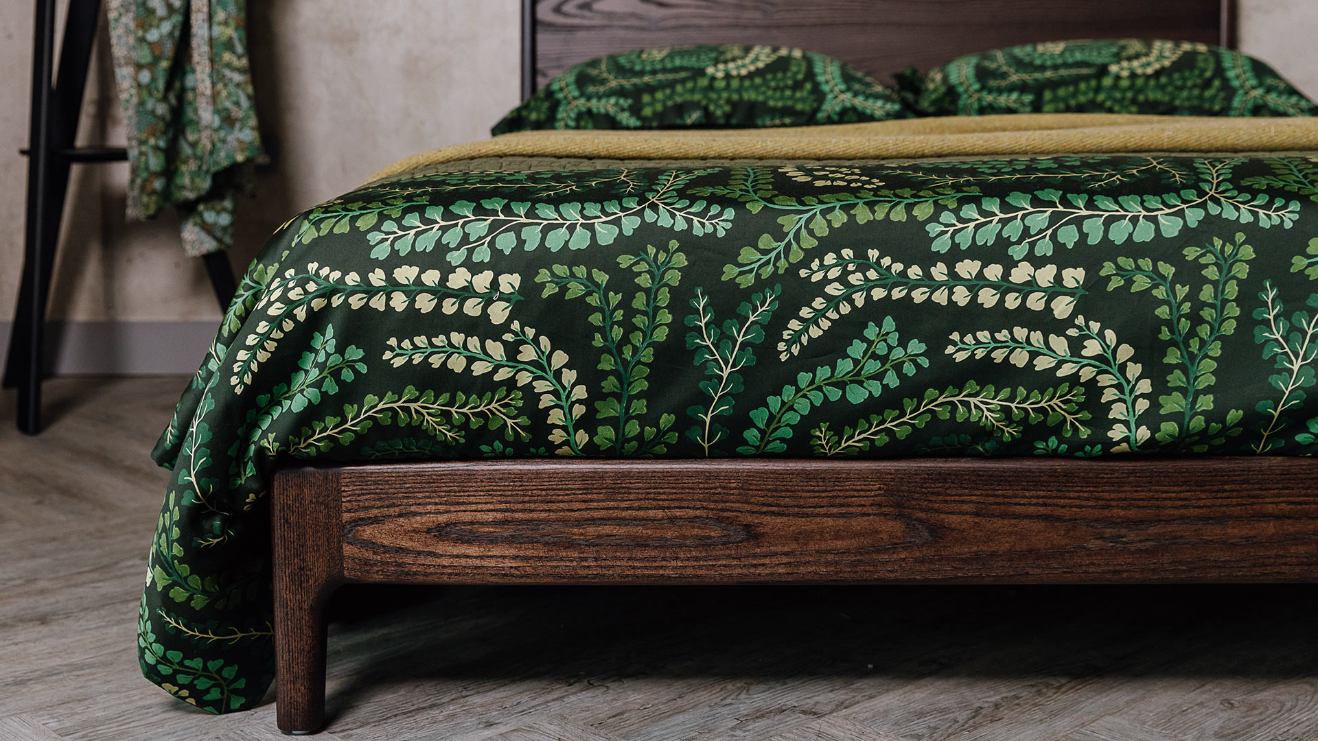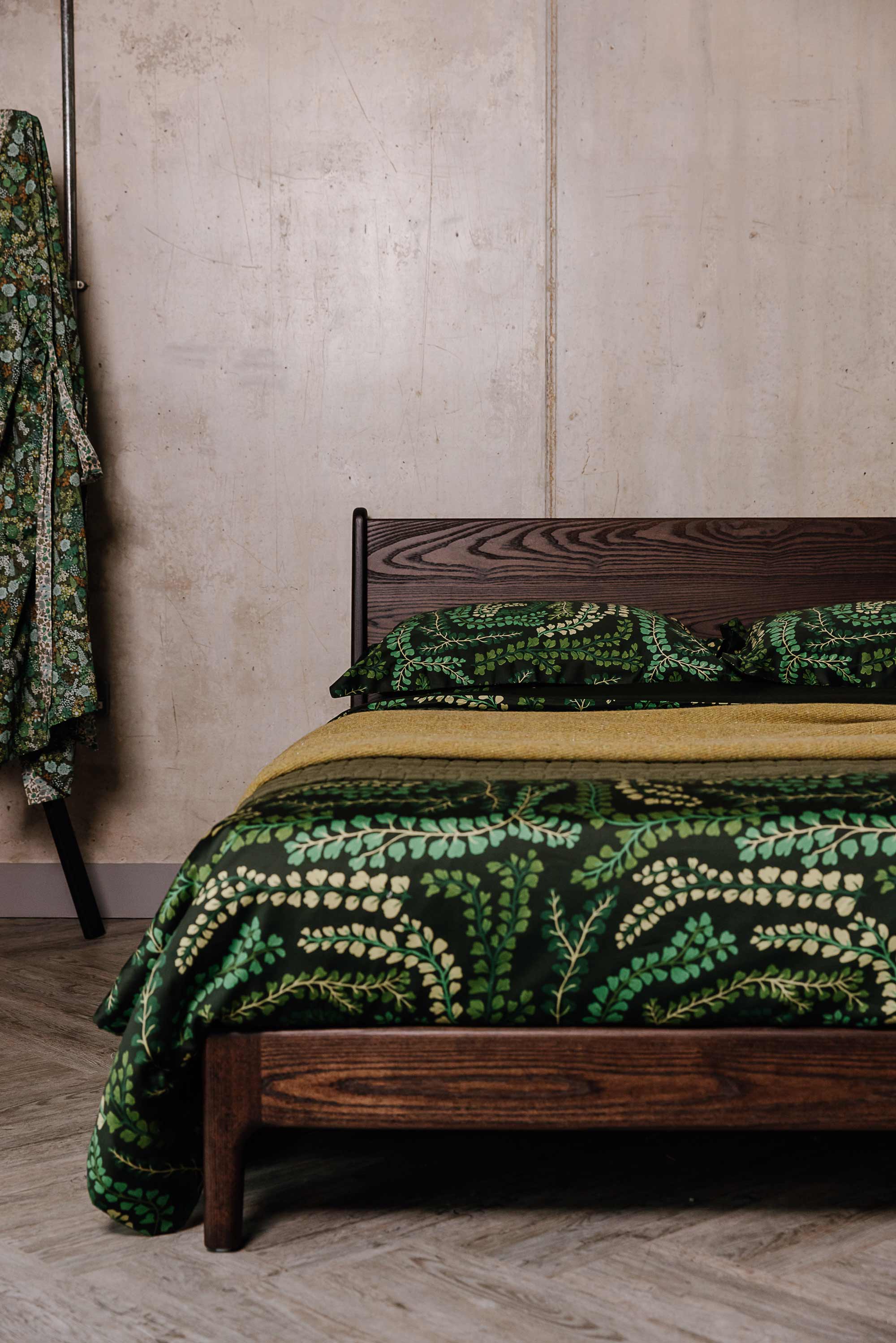 A stunning, dramatic deep green duvet set with a contemporary foliage pattern; a dark, rich green background with a lighter green foliage print inspired by wild clover and ferns. A soft, smooth sateen finish cotton – each duvet cover is complete with a pair of Oxford pillowcases in matching fabric.