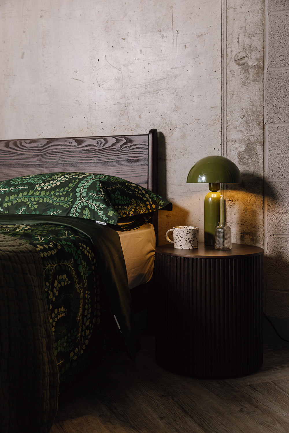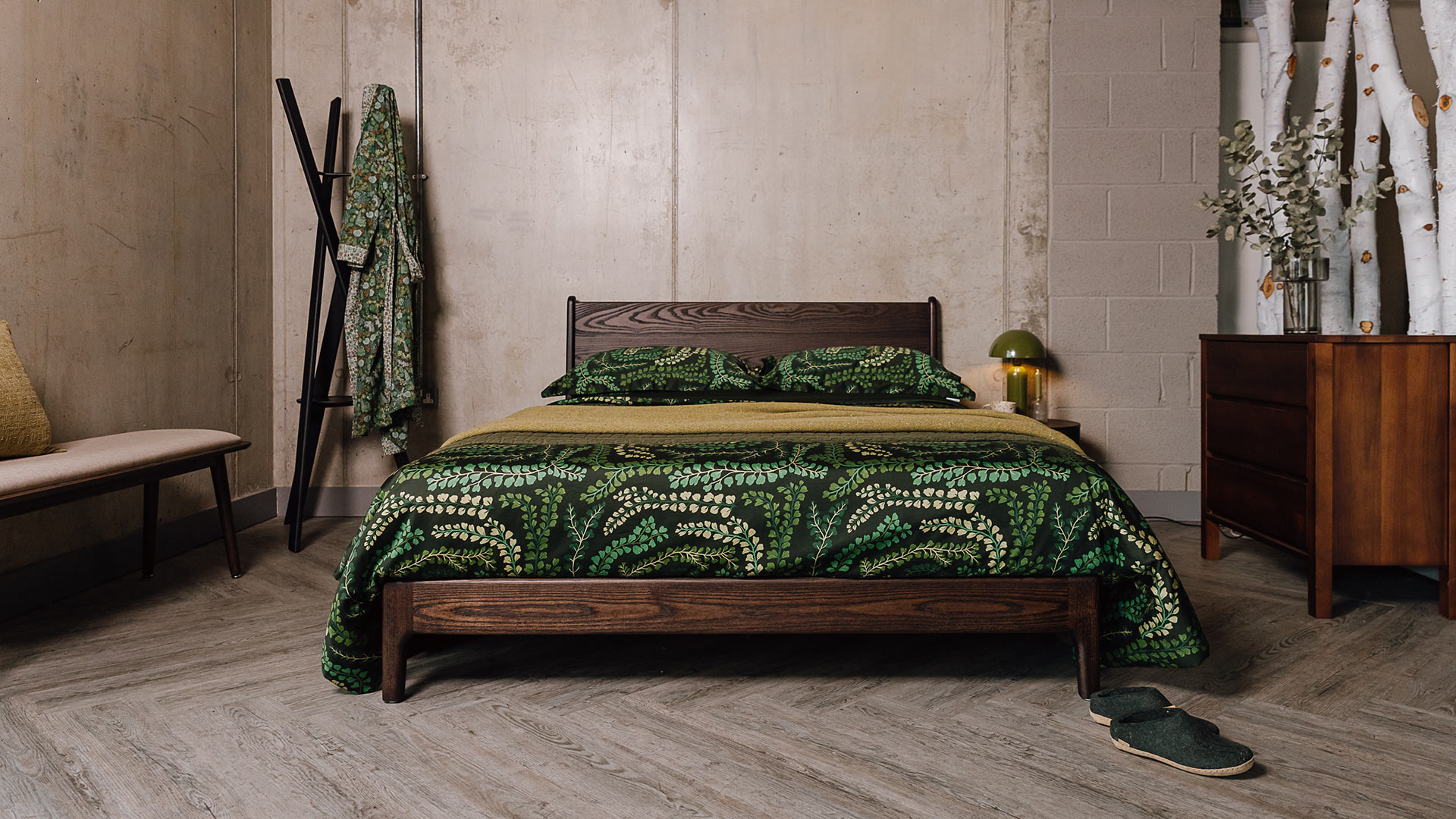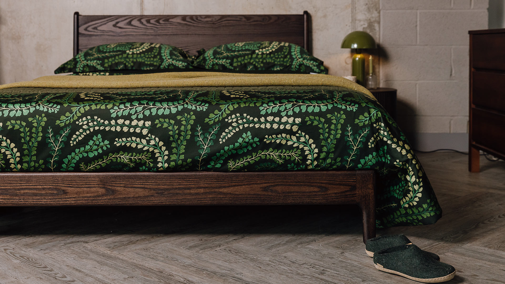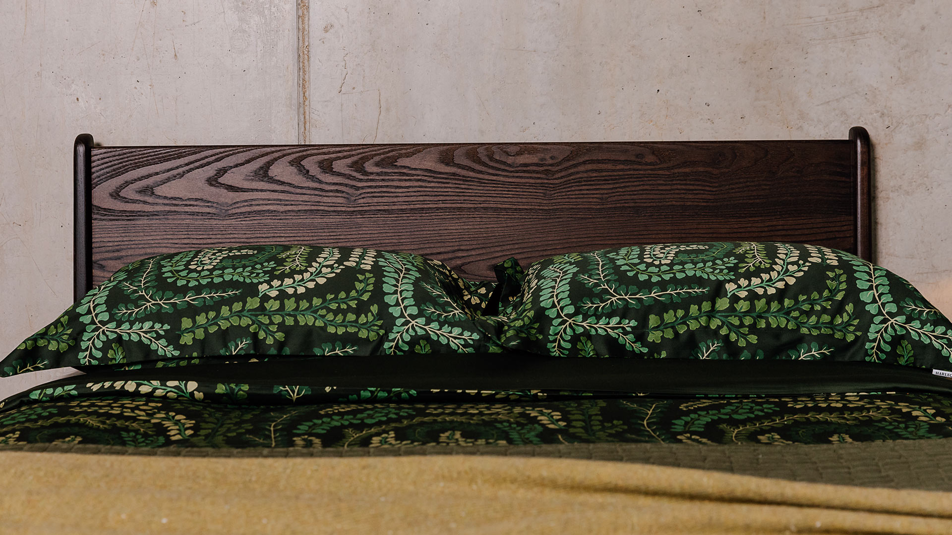 Thanks to its deep and moody colour palette, and contemporage pattern of intertwining foliage this deep green duvet cover set is a showstopper. The combination of dark, rich green and paler stems and leaves, makes this duvet cover set ideal for for any season. The reverse of the duvet cover is a soft deep green sateen cotton.