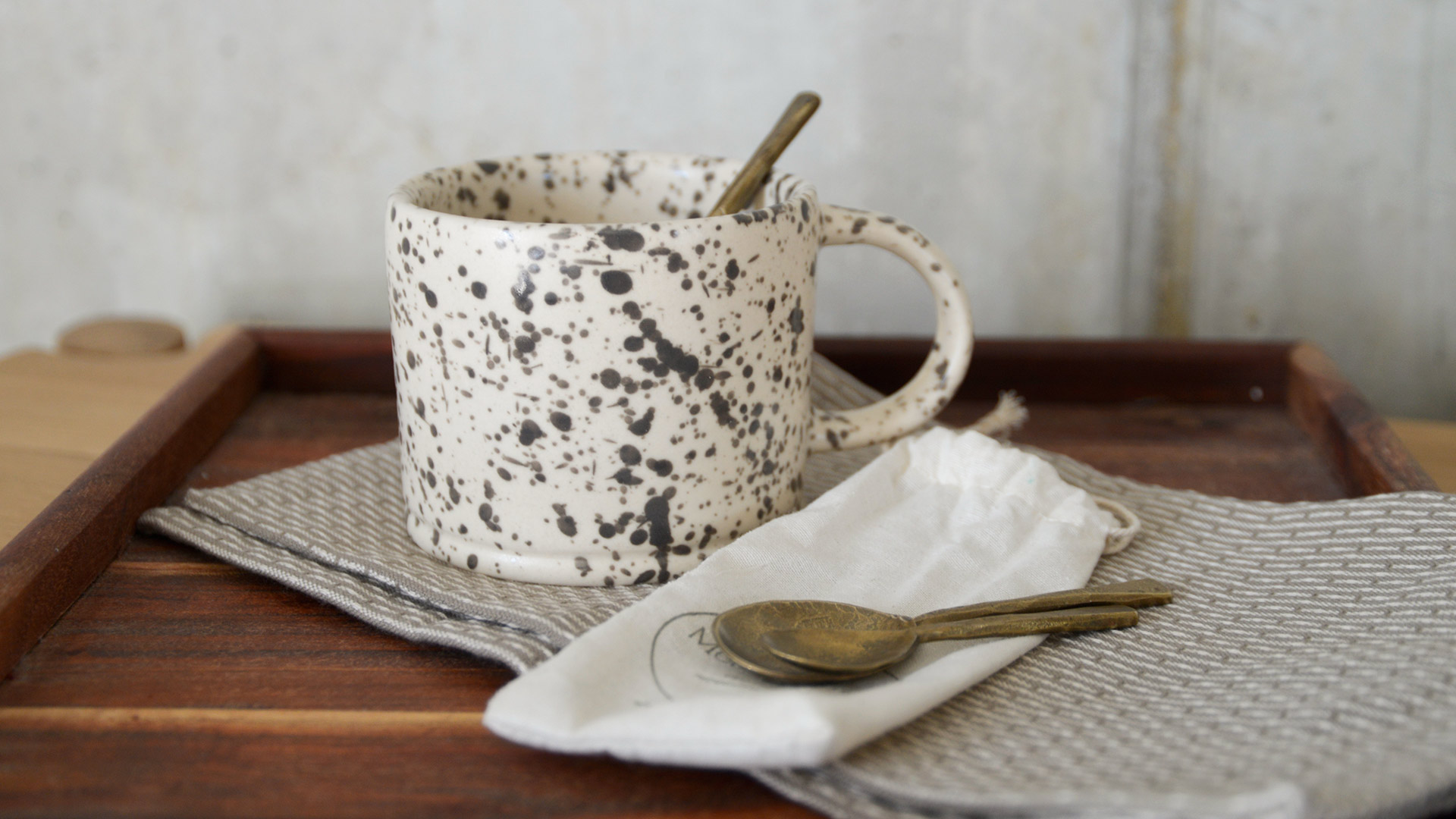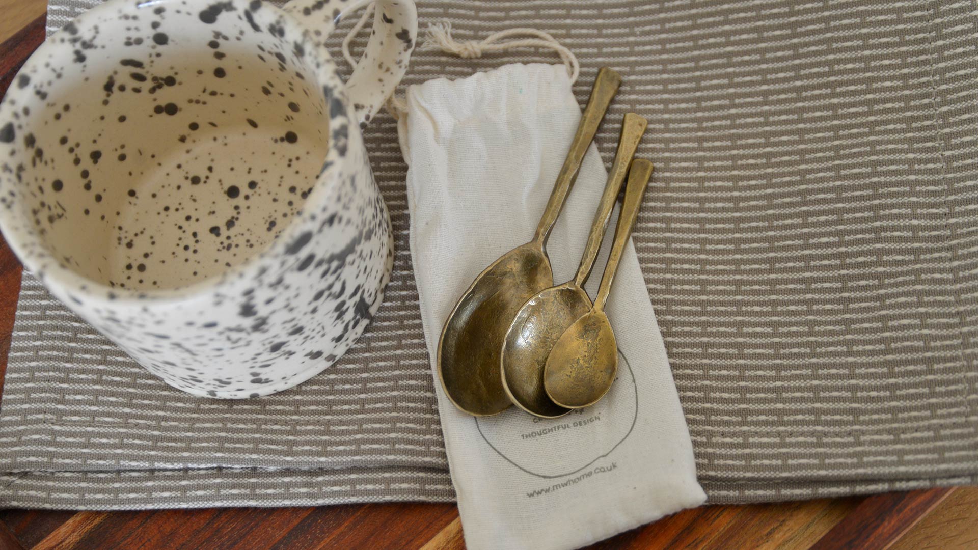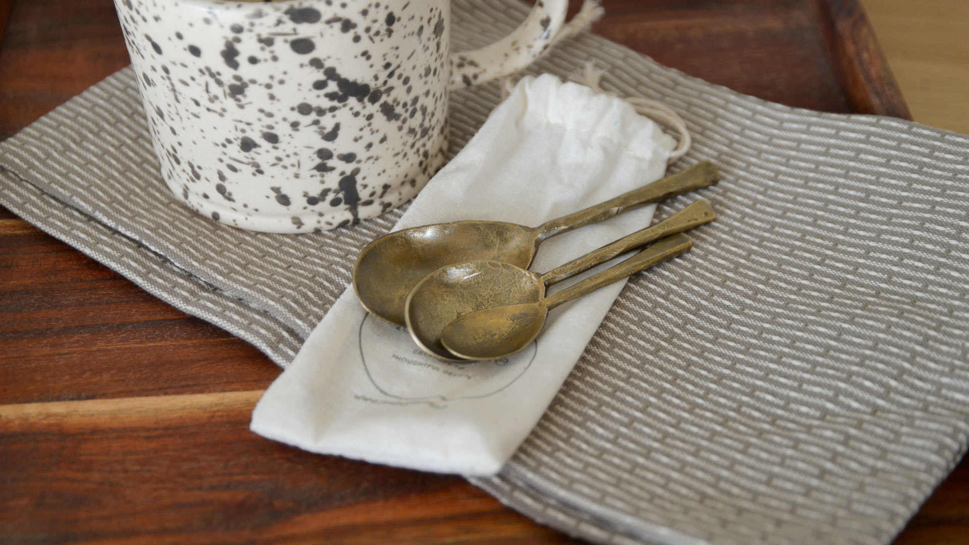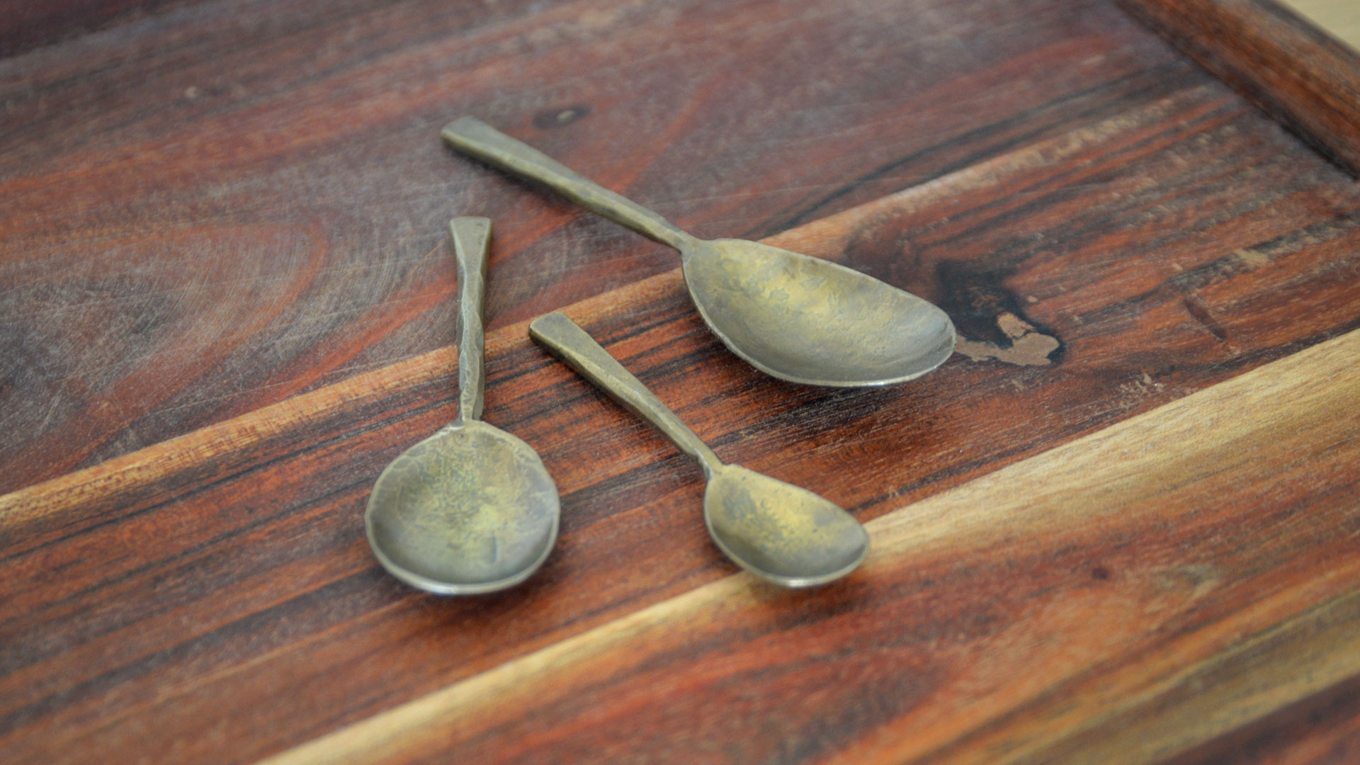A set of three forged iron spoons with a brass finish. Check out the tabs below for more information, including the sizes and care information.