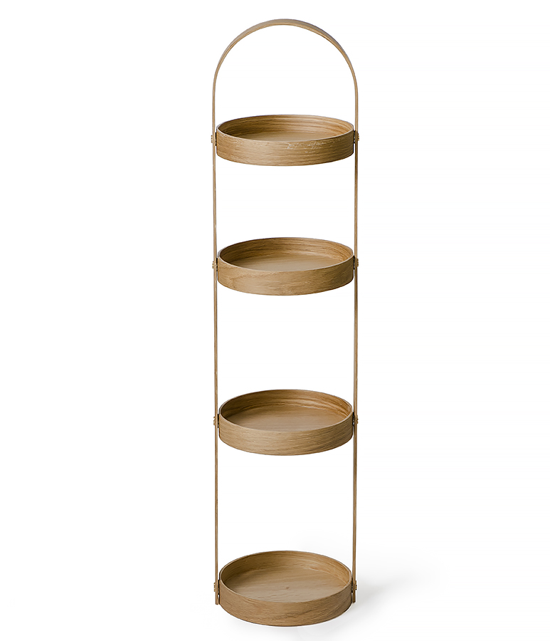 This four-tier oak storage caddy is the ideal partner for a contemporary bathroom or bedroom. Due to its slim profile and refined form, this round, oak storage caddy has a sensual appeal. Portable, well proportioned, and with staggered, shallow lipped trays, it provides accessible storage for any room. All edges are crisp and sharp, but finely hand sanded to make them soft to the touch.