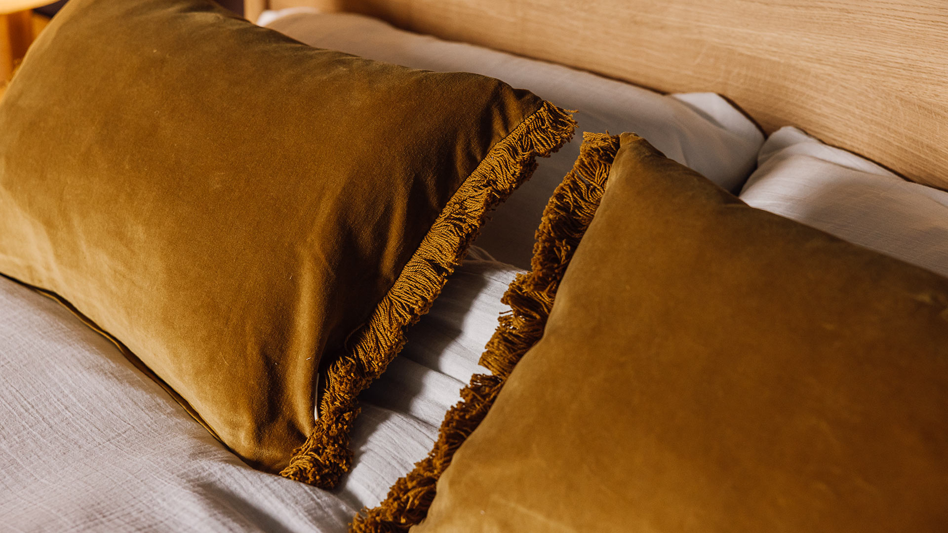 These fringed cotton velvet cushions are super soft – ideal for lounging. Feather pads included – plump them daily to restore fullness.