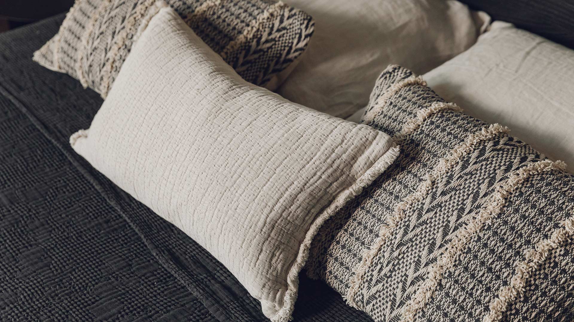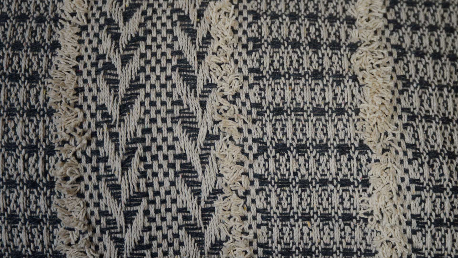 Ideal for a contemporary, natural interior, these geometric boho pattern cushions are plush and comfy. Complete with a feather pad inner and a cover made with high content recycled cotton. Adorned with a stitched, textured pattern in charcoal grey and ecru fibres to the front, and a plain soft canvas to the reverse. Tufted lines separate the pattern and add extra interest.