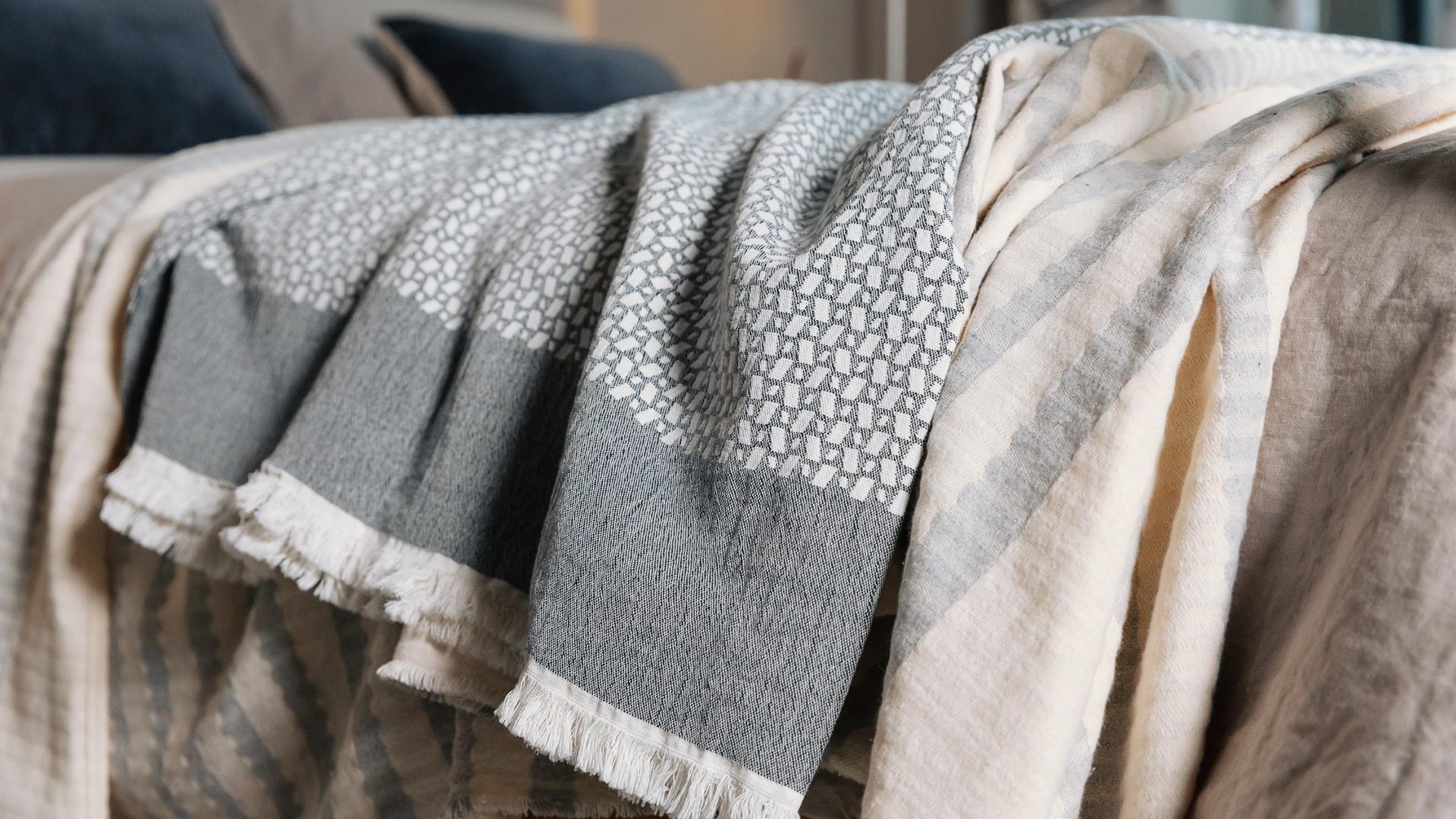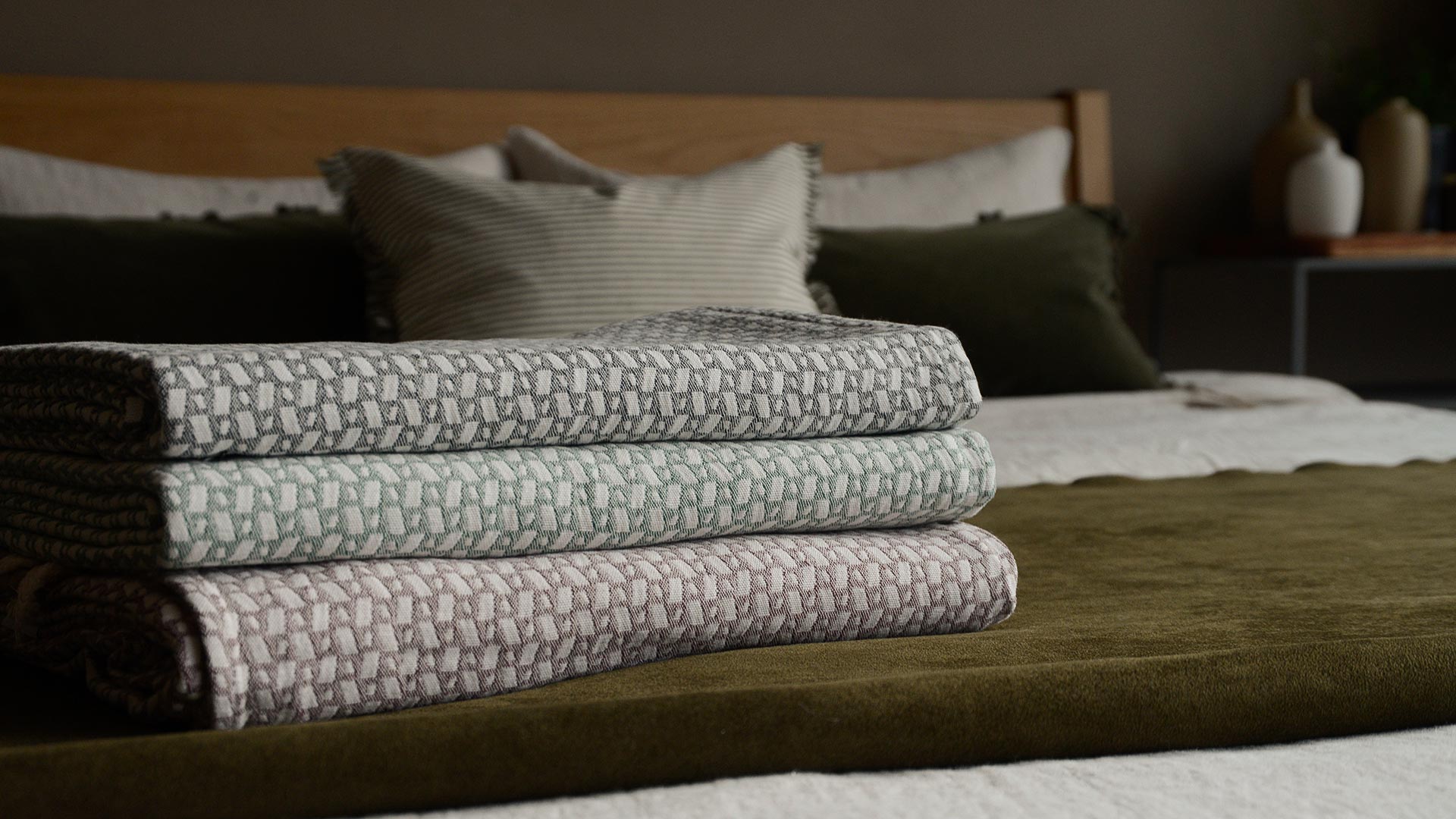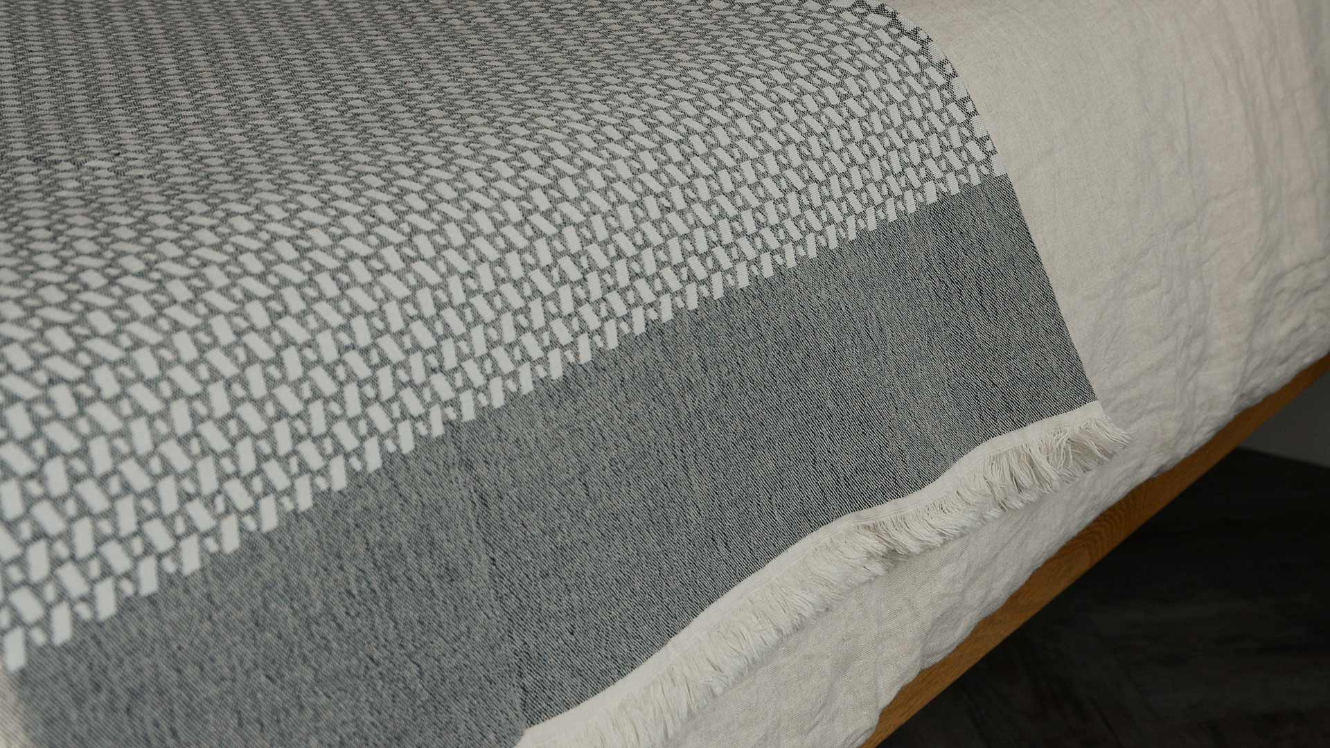 Modern, geometric cotton throws and large bedspreads available in 3 colours. 100% cotton.