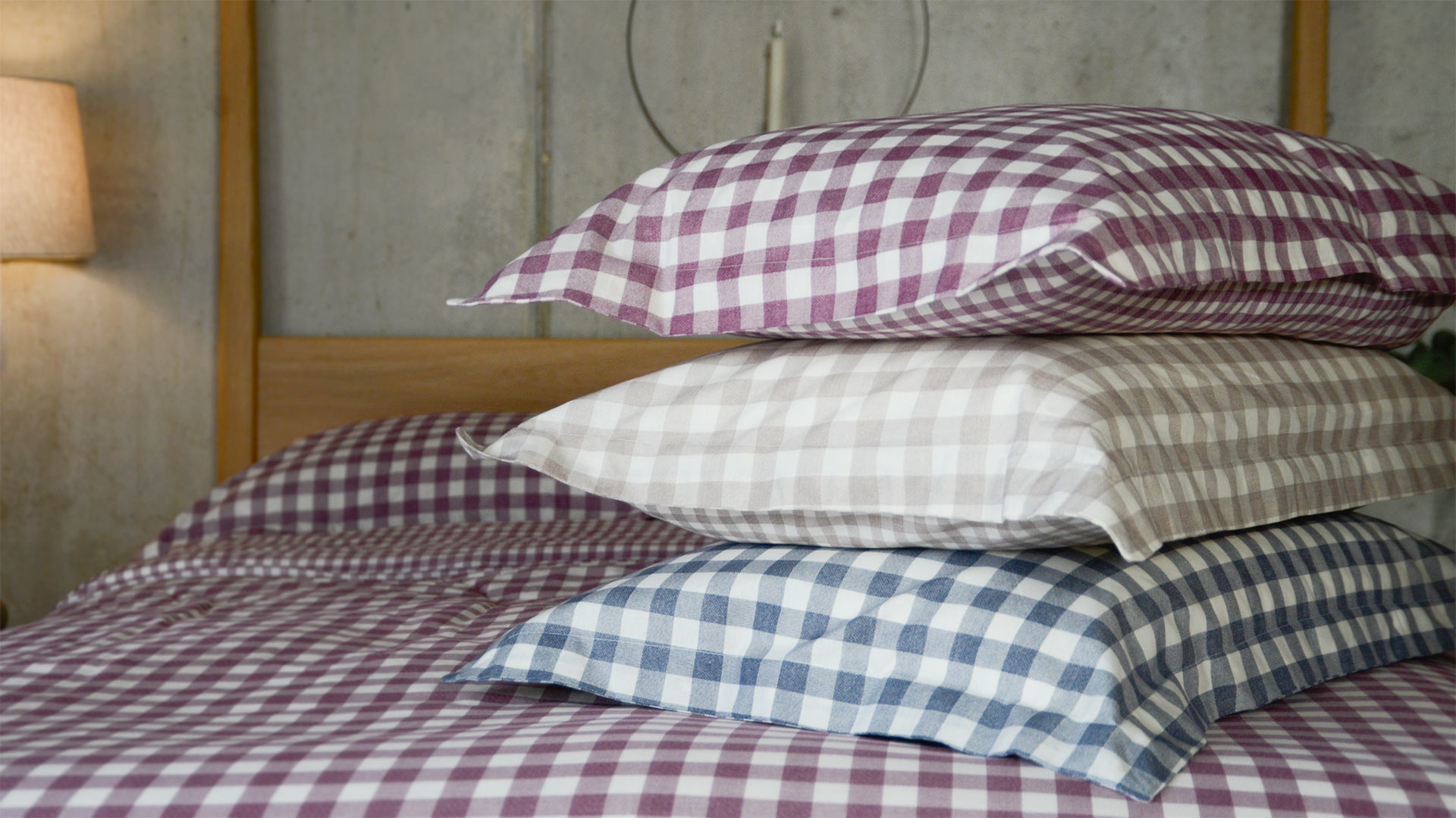A collection of gingham cotton bedding in 100% cotton. An ivory bedding set with a soft gingham pattern in either soft beige, navy blue or berry purple. The duvet set has a classic gingham pattern to the front and the same pattern in a smaller scale on the reverse. The oxford pillowcases have an envelope closure.