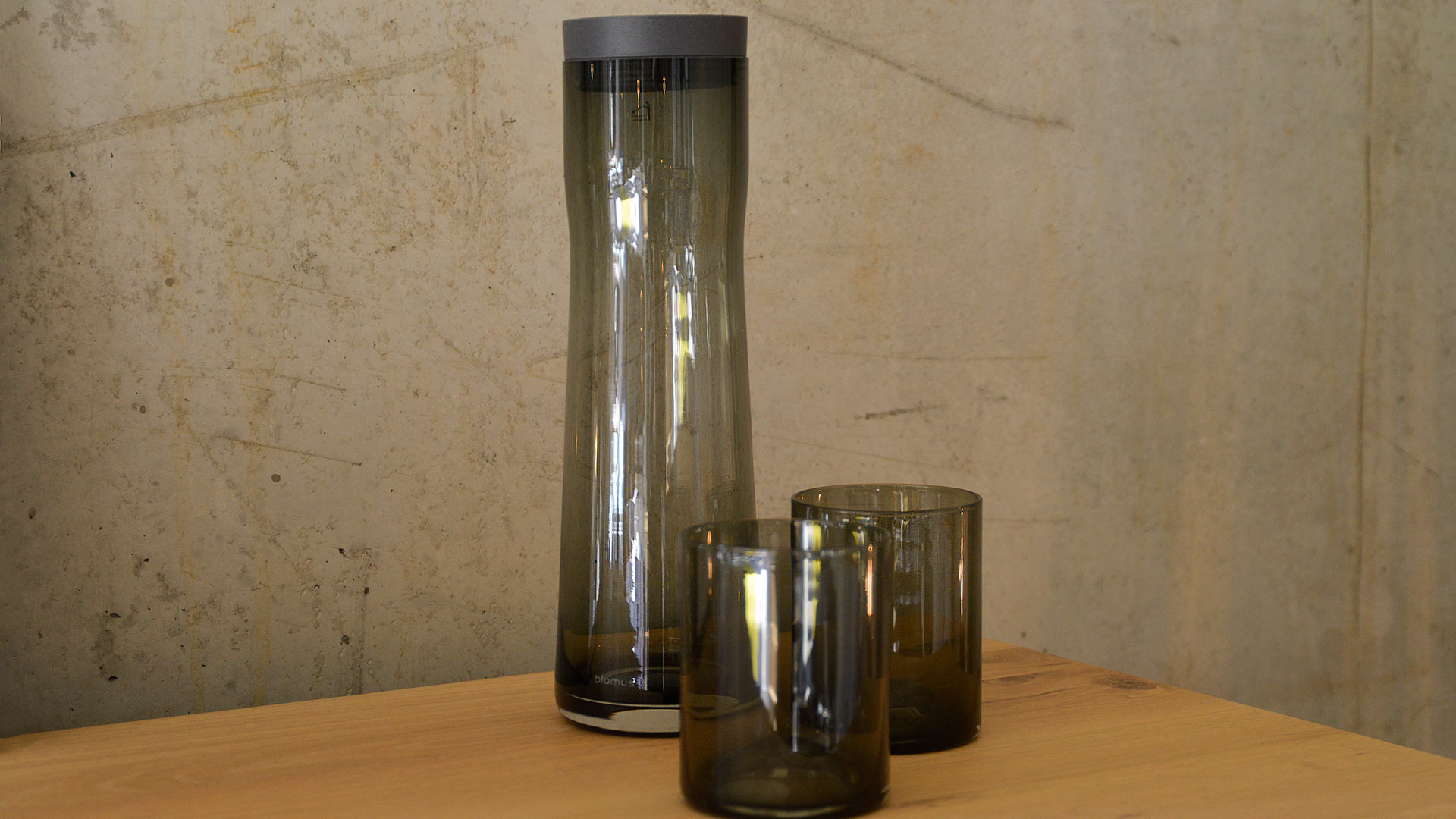 A beautiful, smoke coloured glass carafe and tumblers. Choose from either a set of 2 water glasses in a deep smoke grey colour, or a carafe in the same smoke coloured glass. The carafe is finished with a polished steel and silicone lid.