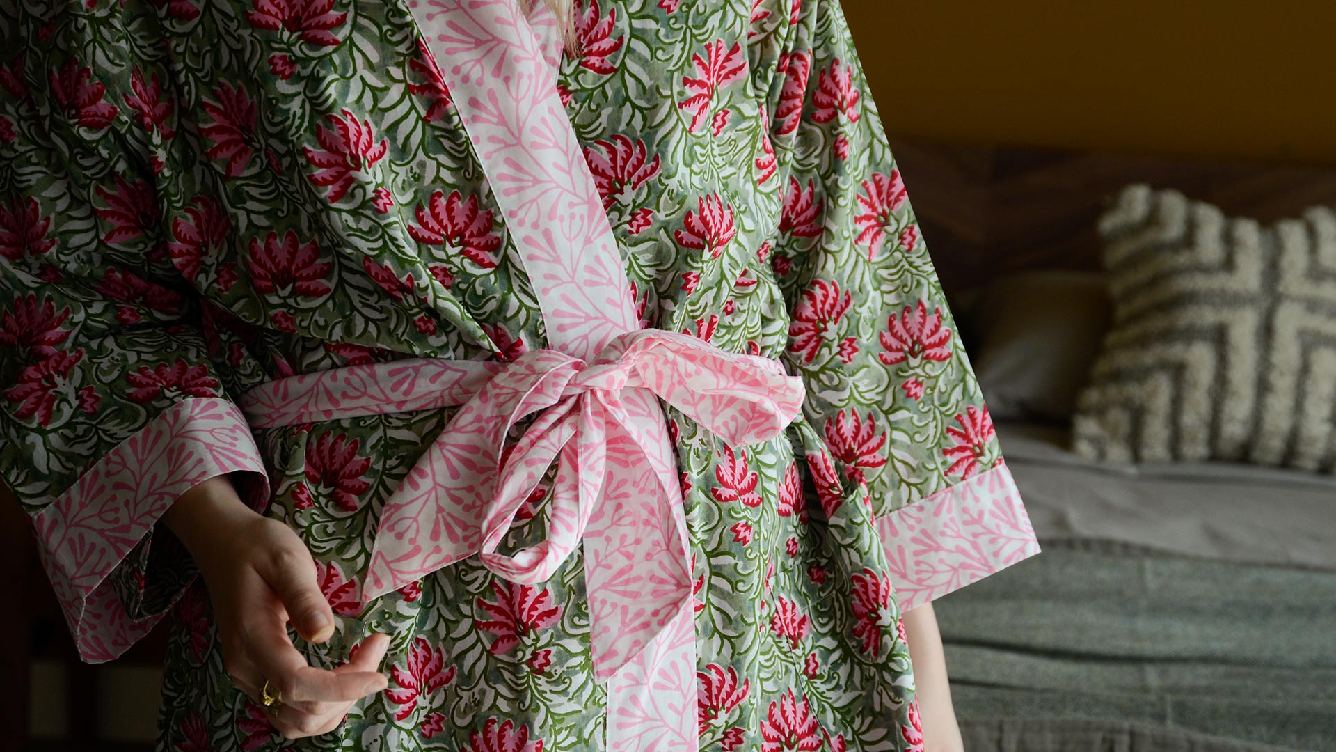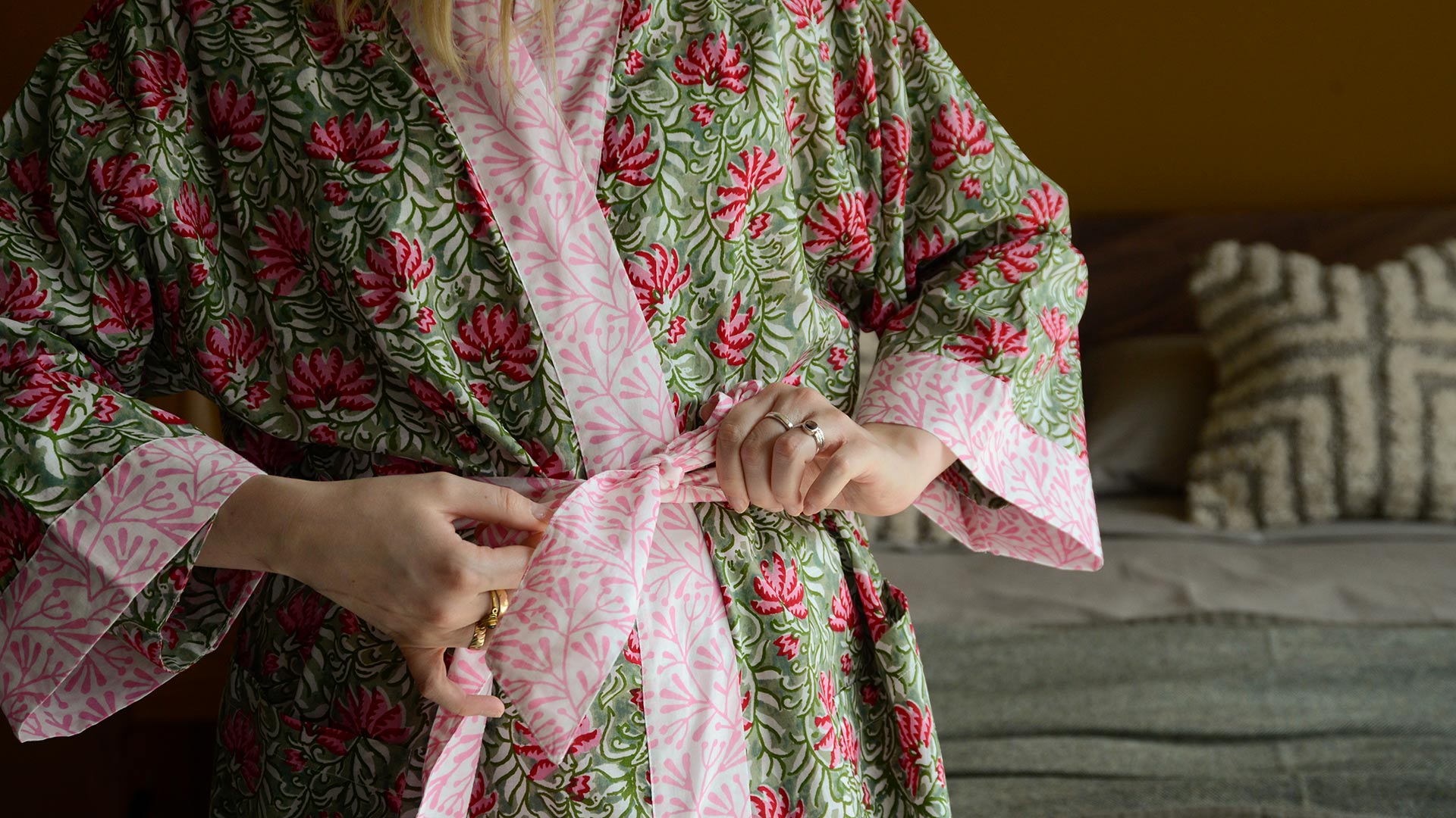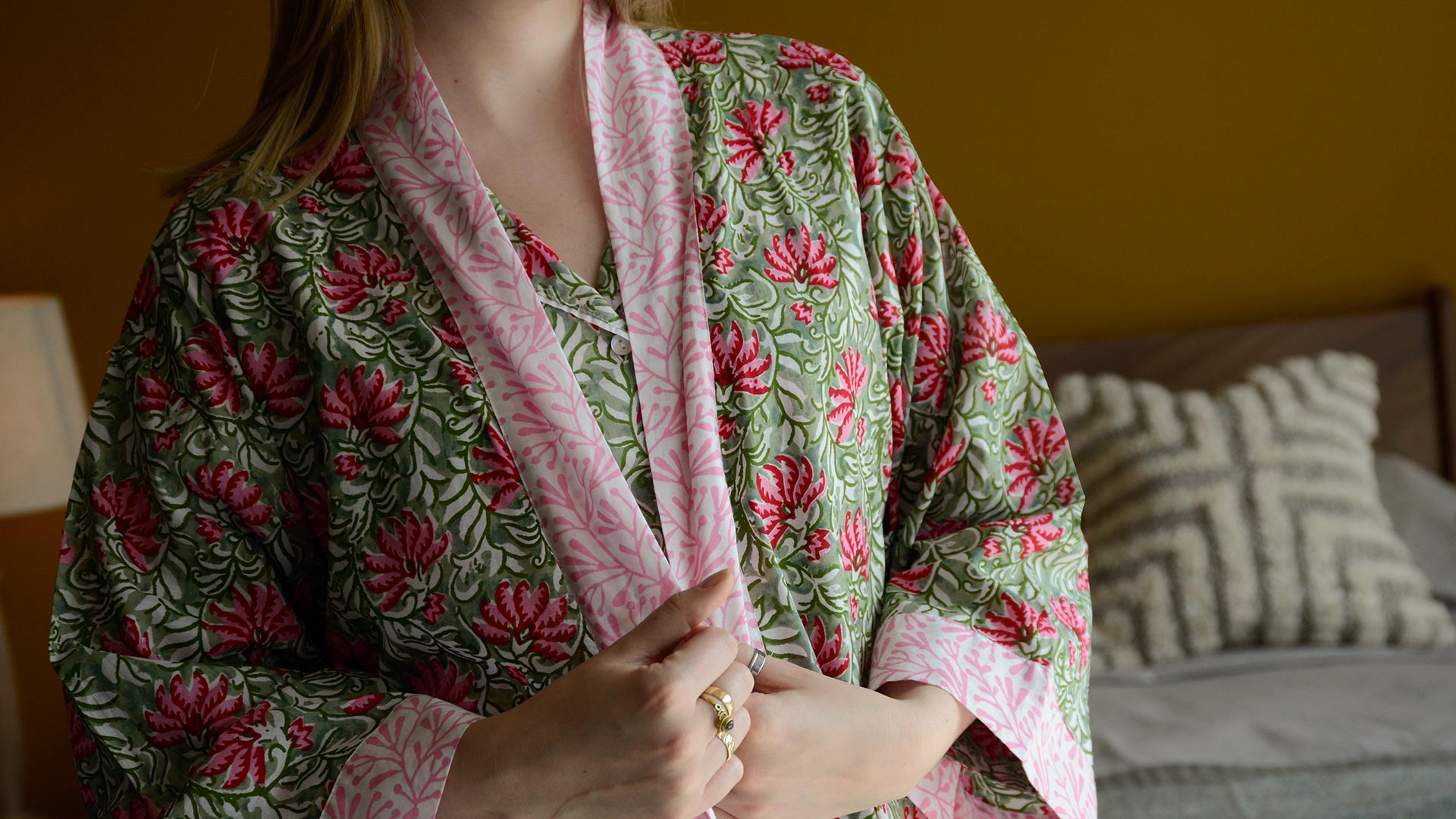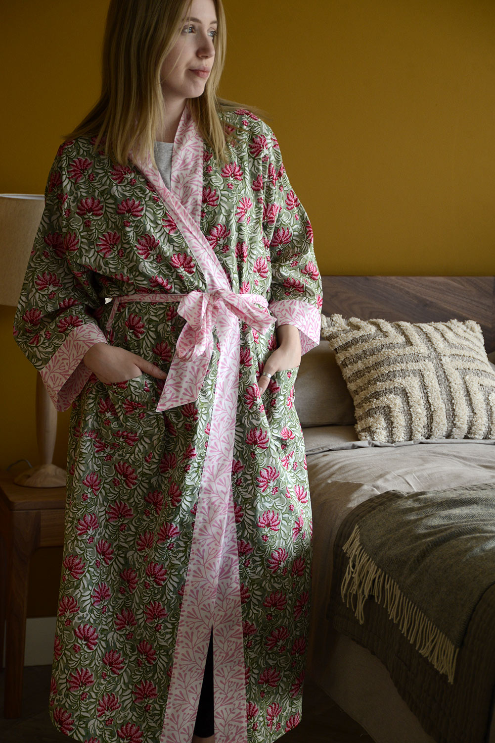 This floral print kimono is created using traditional block printing techniques. A matching dressing gown is also available just here.