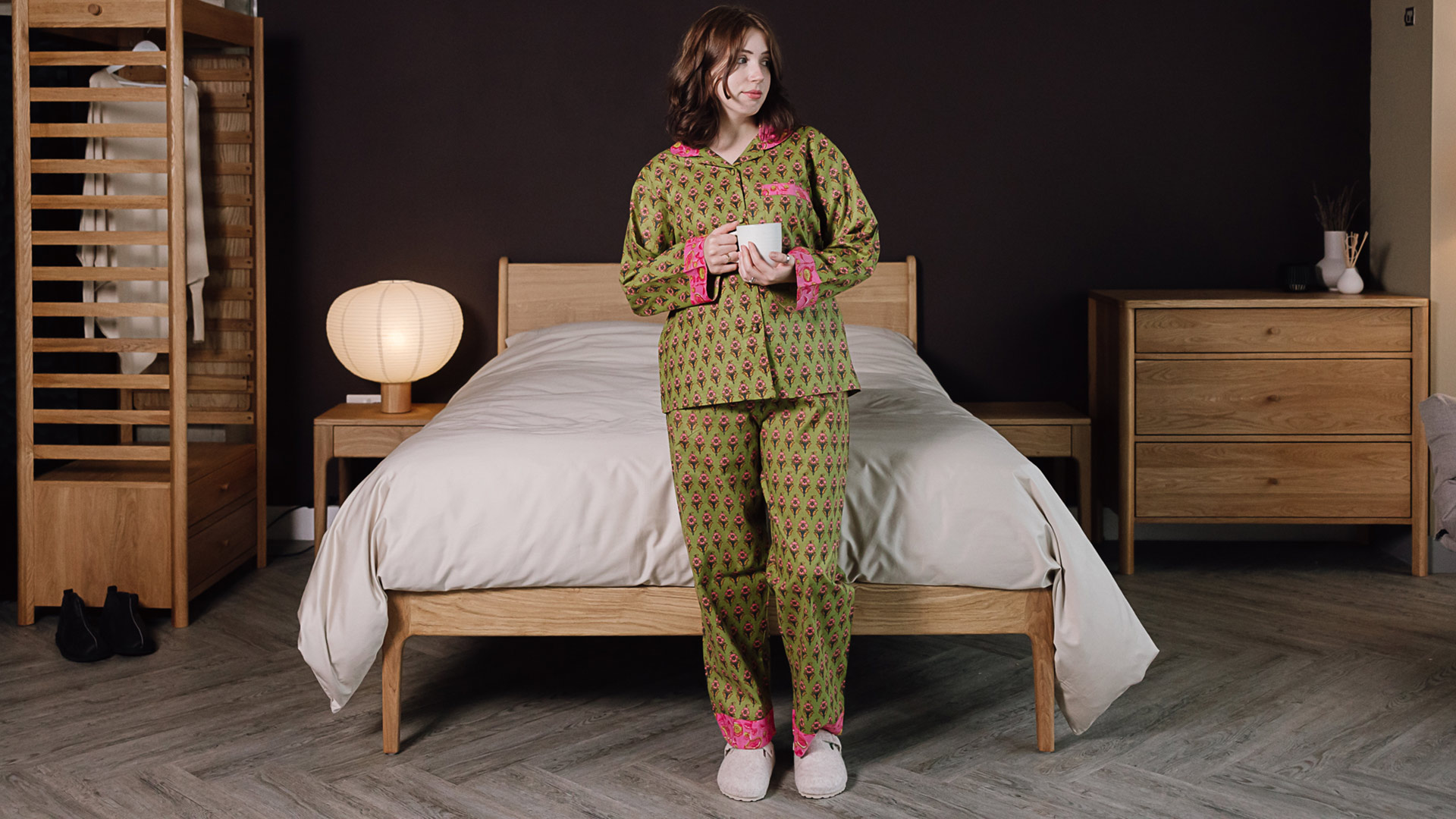 Soft cotton pyjamas featuring a bright green and pink floral print. Made using traditional block printing techniques. Made from 100% cotton.
