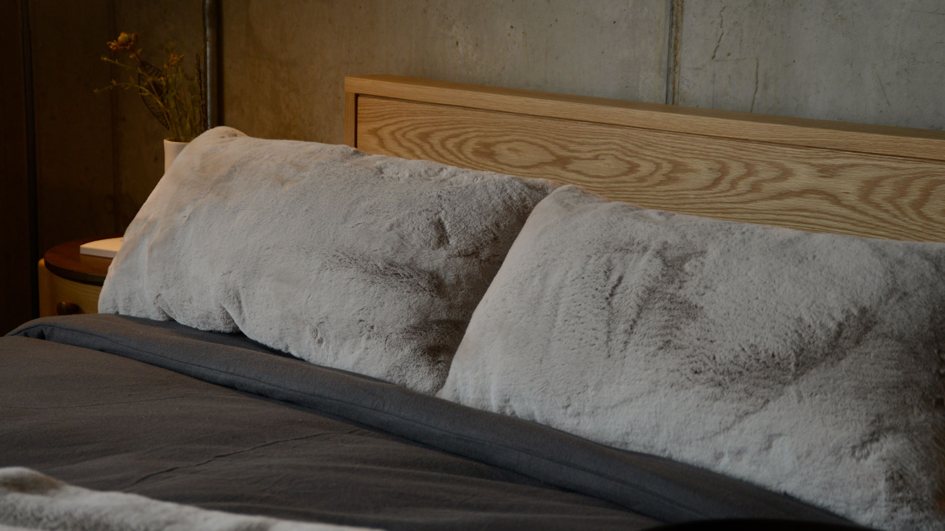 Substantial and luxuriously soft, these greige faux fur cushions are available here in a large size – perfect for double, king-size or super-king beds. Made in the UK.