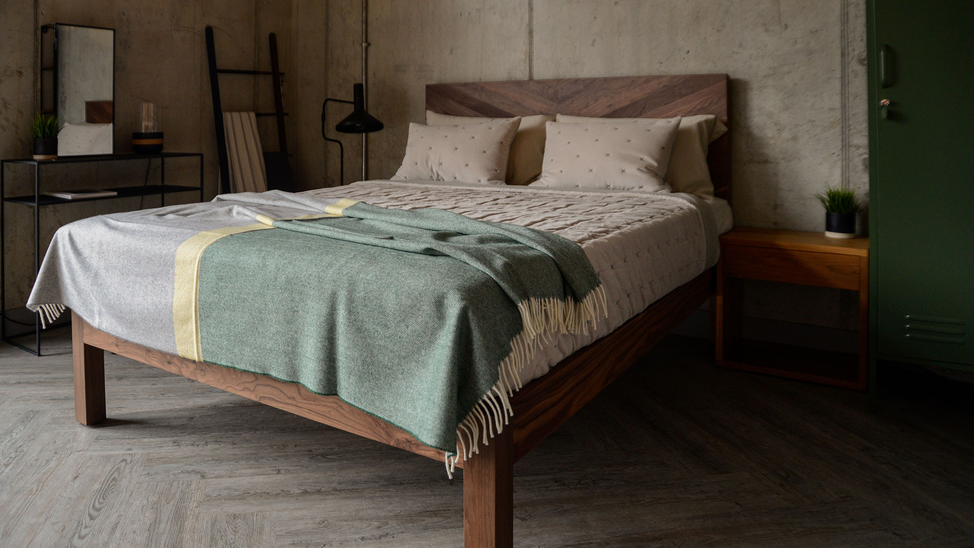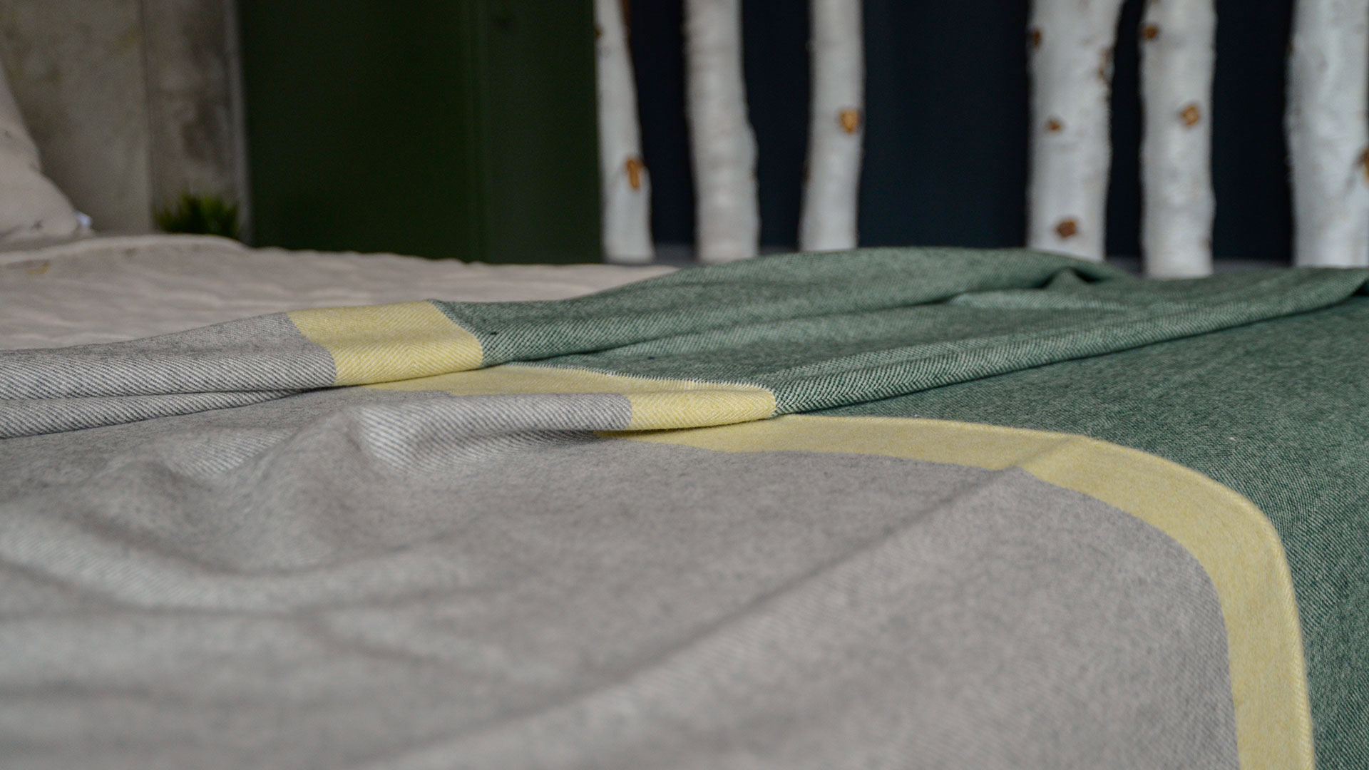Luxuriously soft, grey & green Merino lambswool throw. A modern, colour block throw in grey and emerald green with a lemon yellow stripe. It has an ivory fringe to both ends across the width. This blanket is large enough for over the end of your bed and soft enough to snuggle under on the sofa.