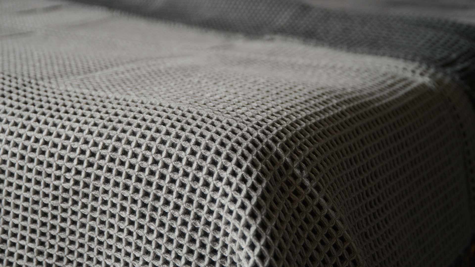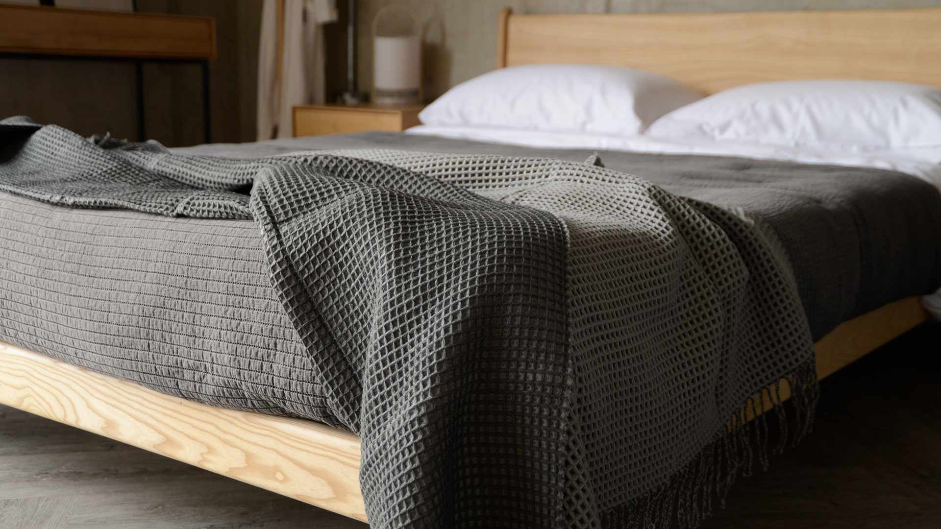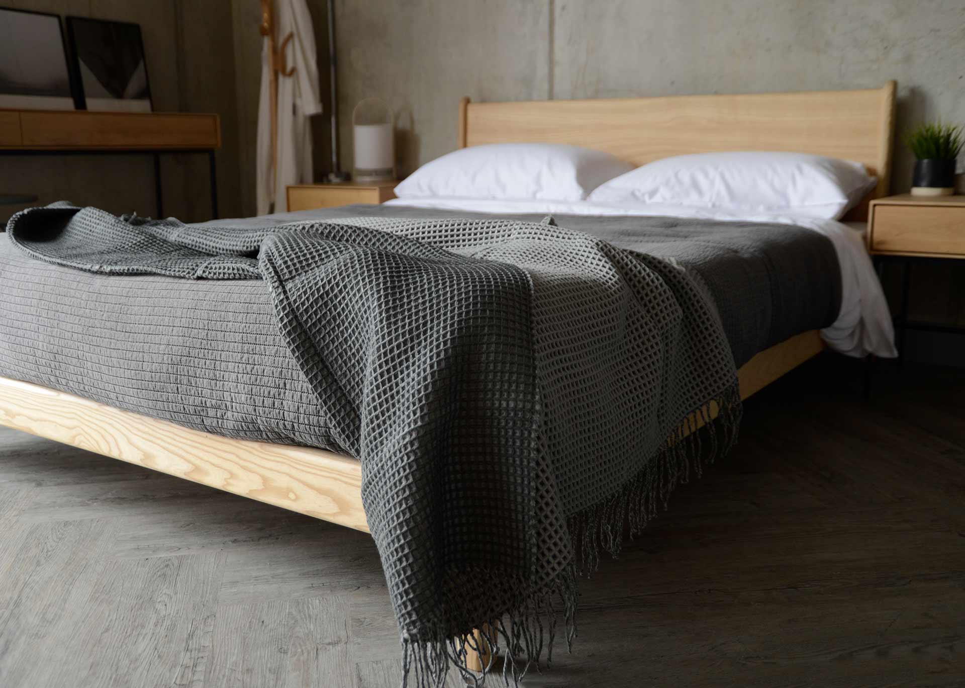 A stylish, modern blanket with a deep waffle look texture. Reversible – it has a paler grey look to one side and a deep grey look to the reverse.
