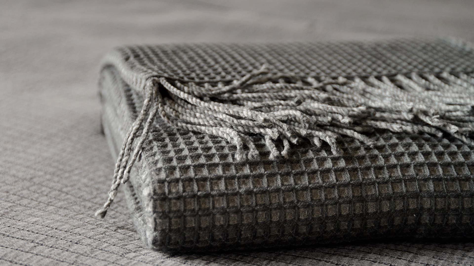 A stylish, waffle look throw in two shades of grey. A modern blanket with a deep waffle like texture, deep grey to one side and pale grey to the reverse. This grey waffle look throw is easy to pair with any monochrome room scheme styled in shades of grey, or as a neutral base to support brighter colours. Try pairing with pastel tones for a neat, yet colourful look.
