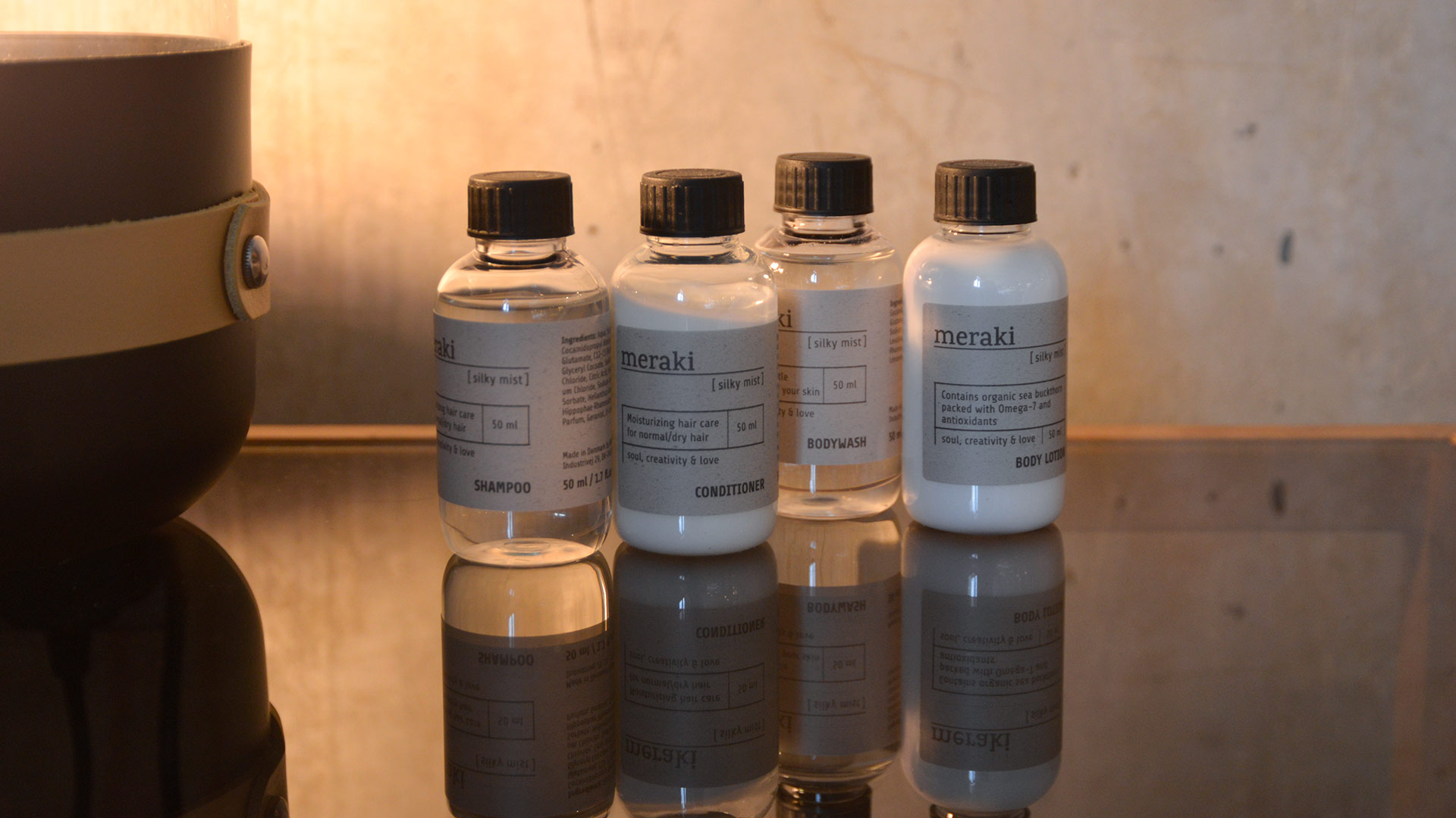 The set includes: 1x Moisturising Shampoo 50ml 1x Moisturising Conditioner 50ml 1x Soft & Gentle Bodywash 50ml 1x Conditioning Body Lotion 50ml 1x Cotton pouch