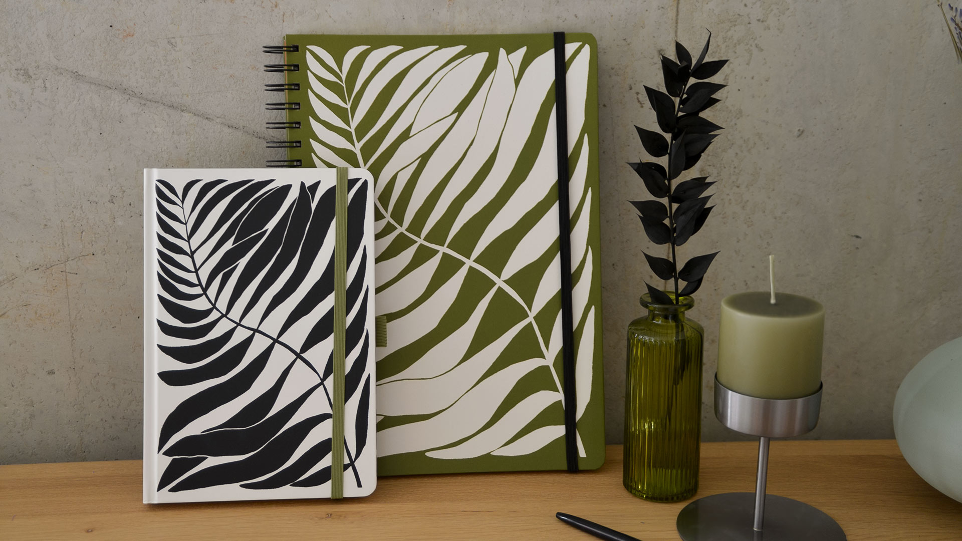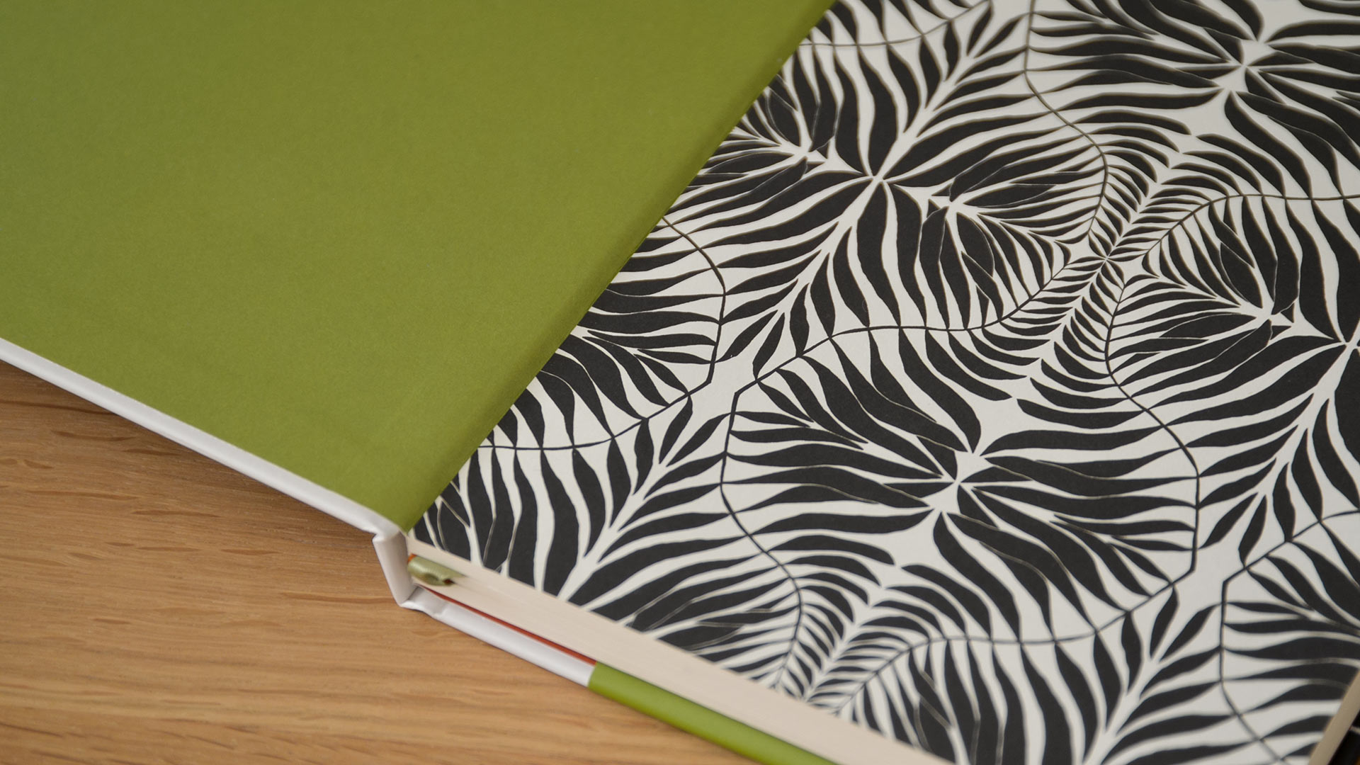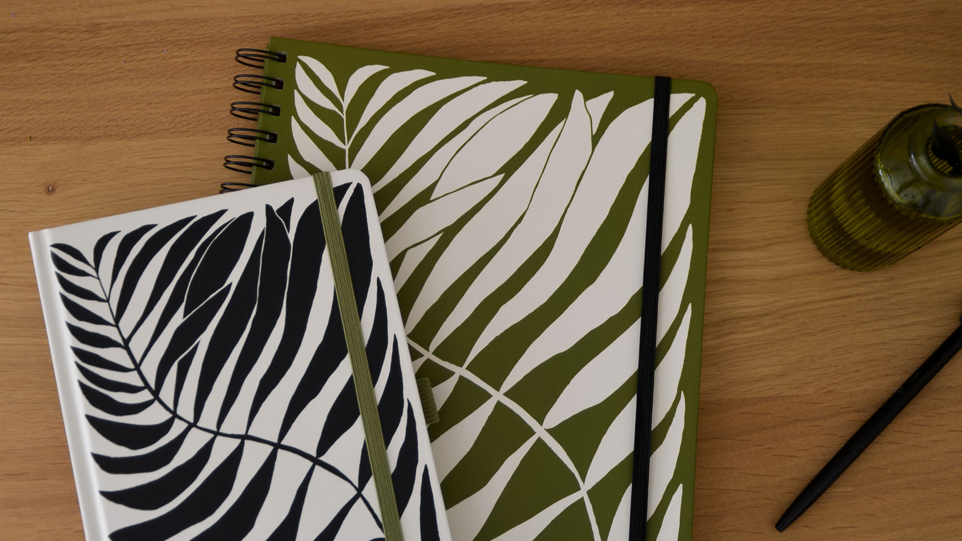 A5 – Off-white background and black leaf print. 180 lined pages of acid free paper (100gsm). Green elastic closure, pen holder, two page markers, internal pocket and lay-flat binding.