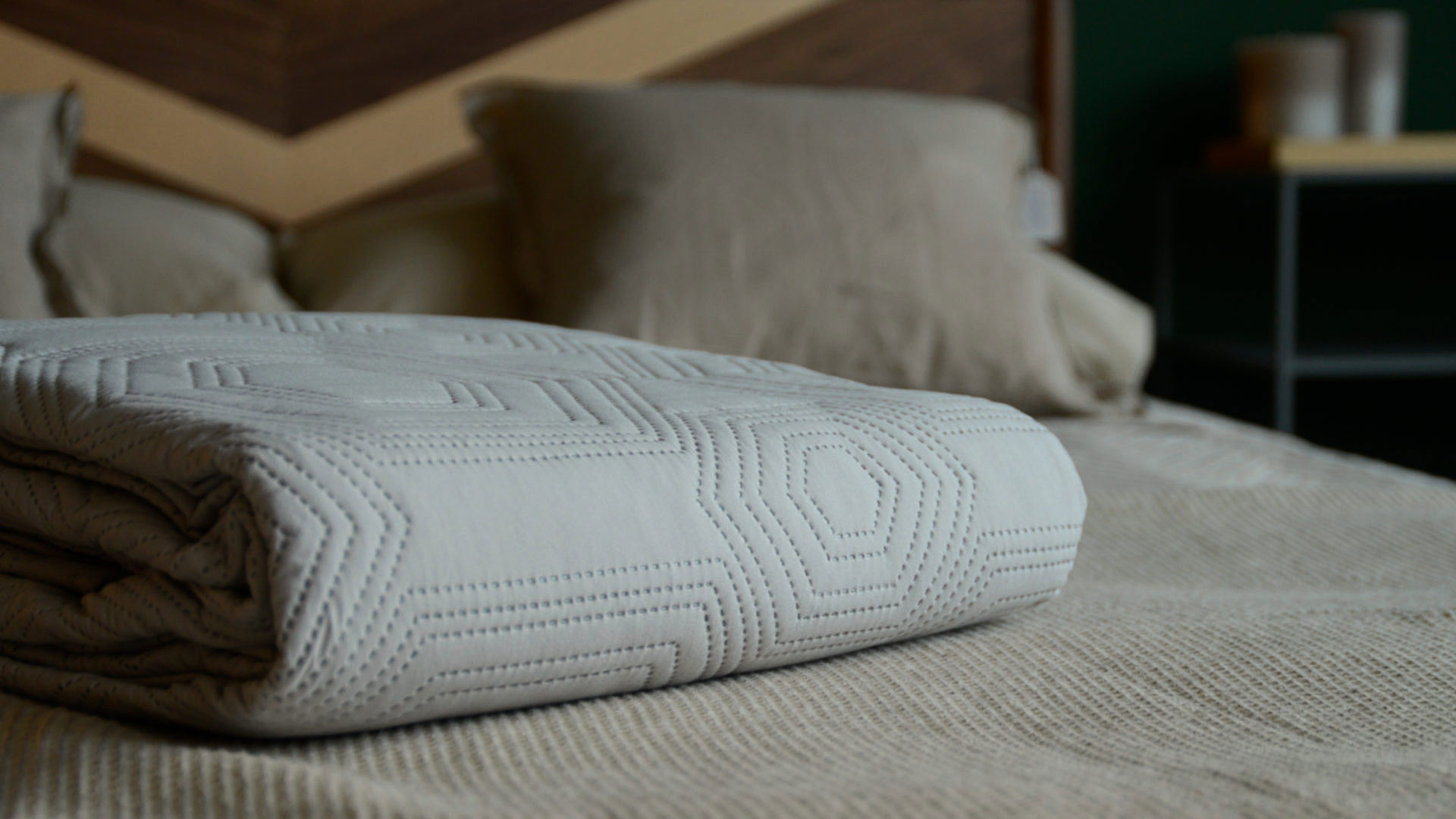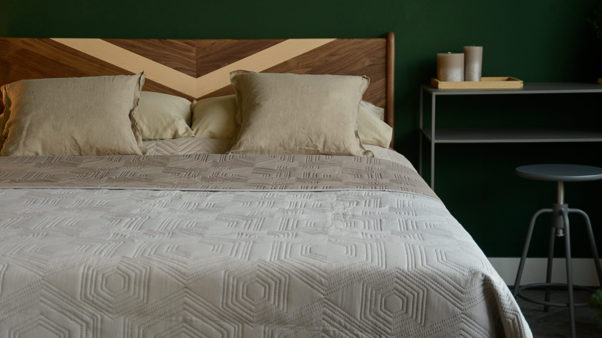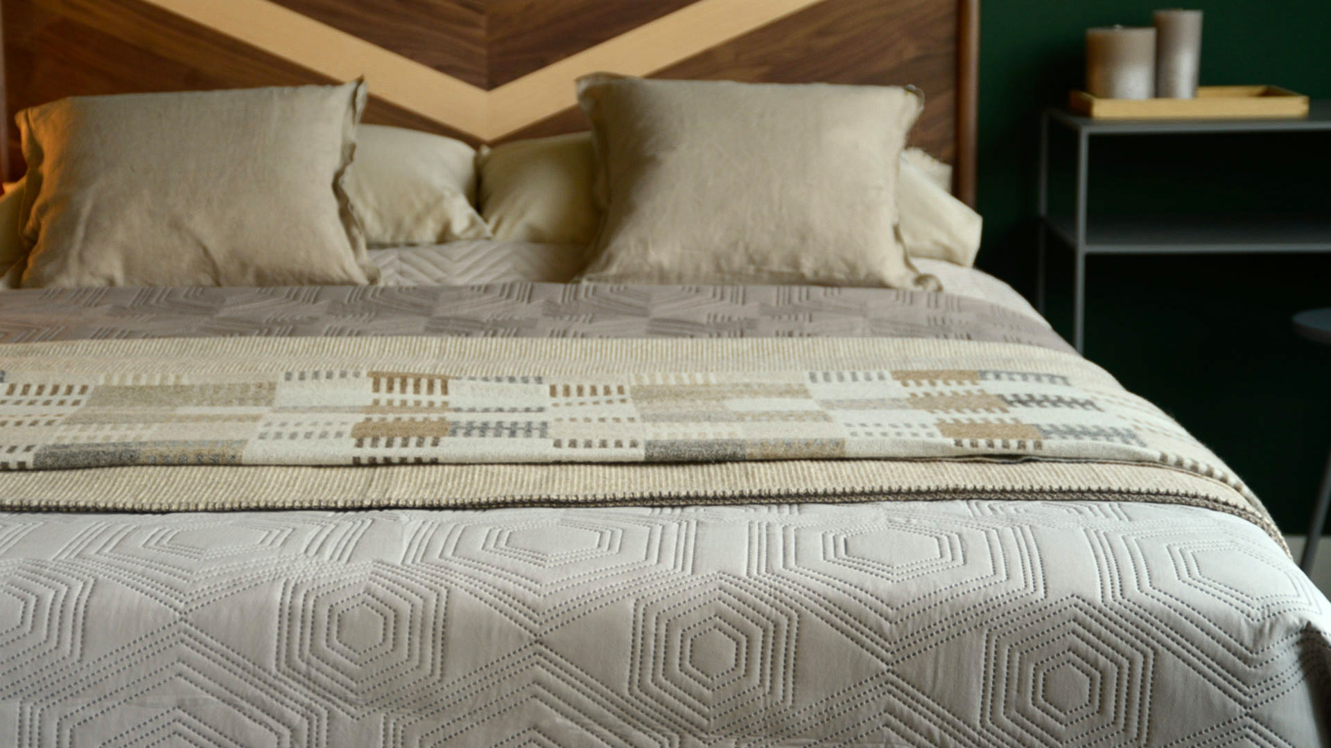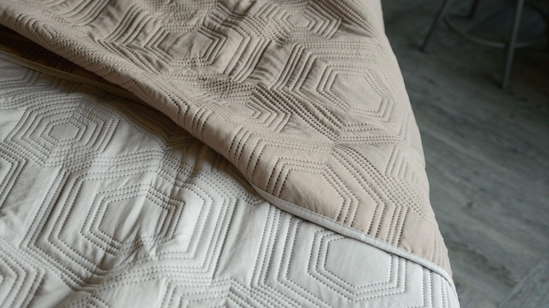 A stylish, hexagon pattern bedspread in a light grey with light chocolate brown reverse. This contemporary, light-weight bedspread has an embroidered look geometric design.