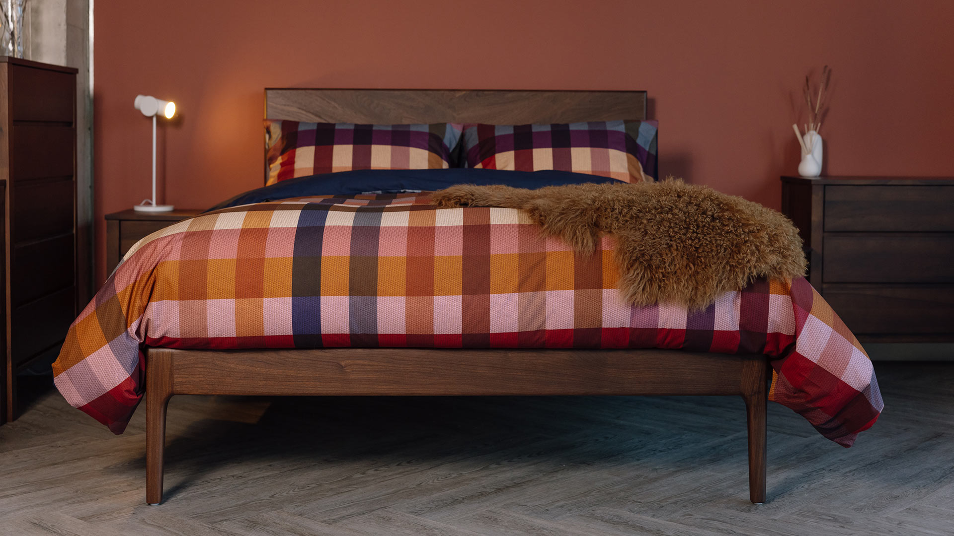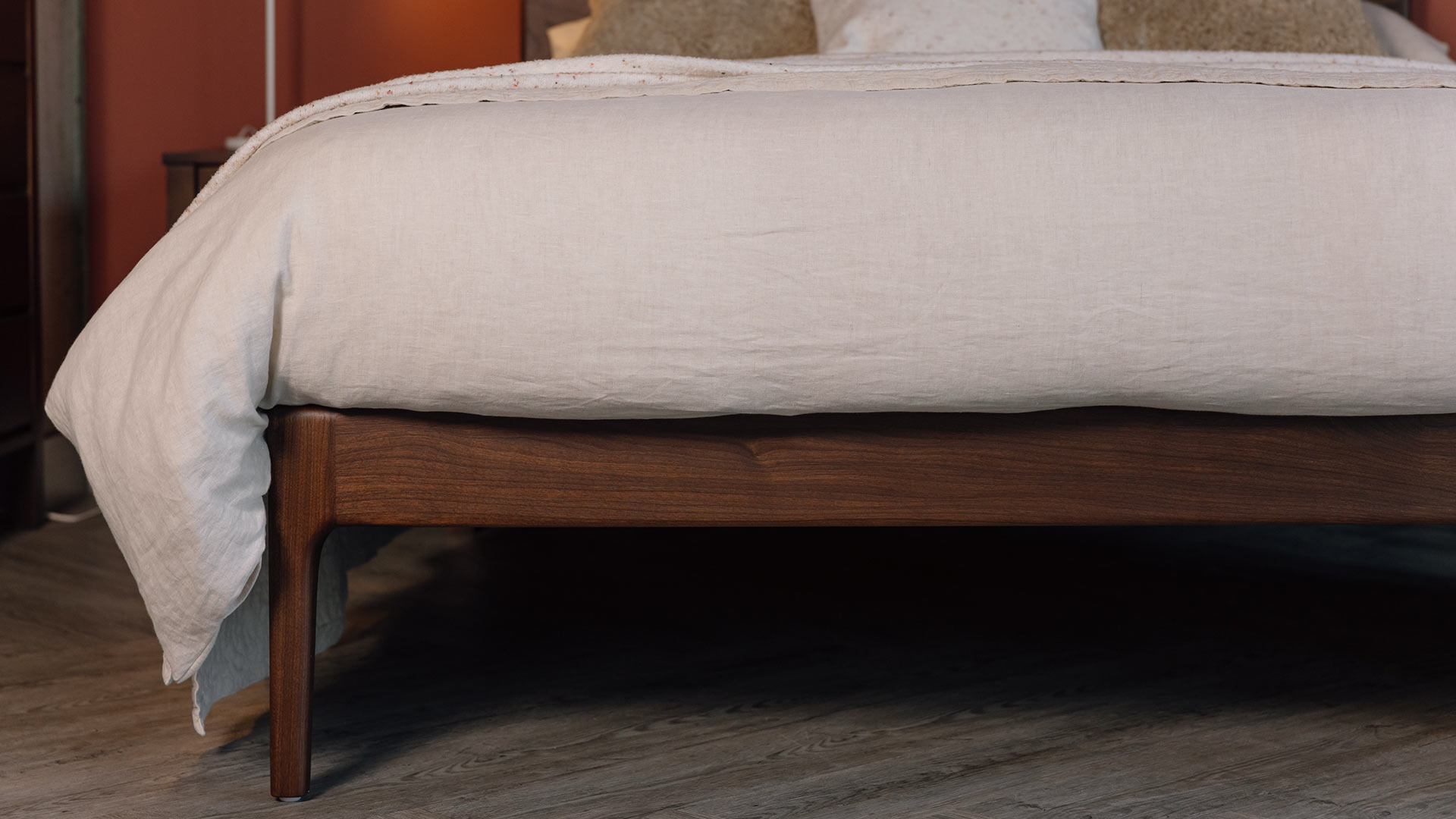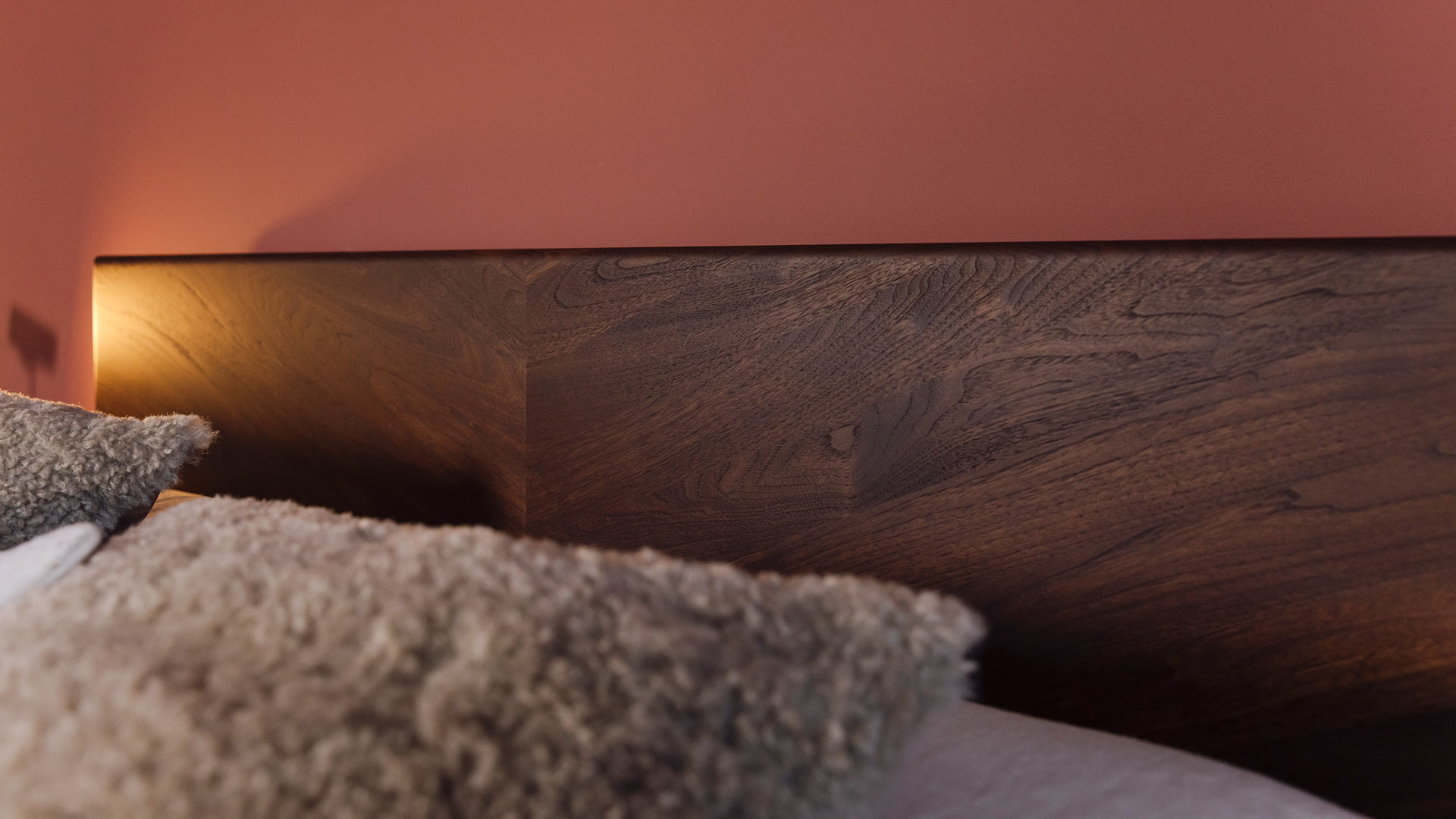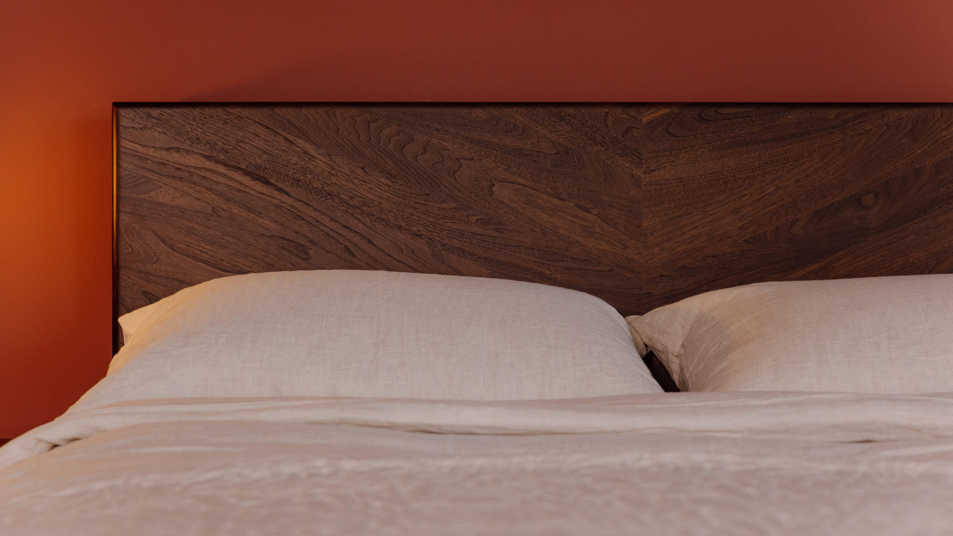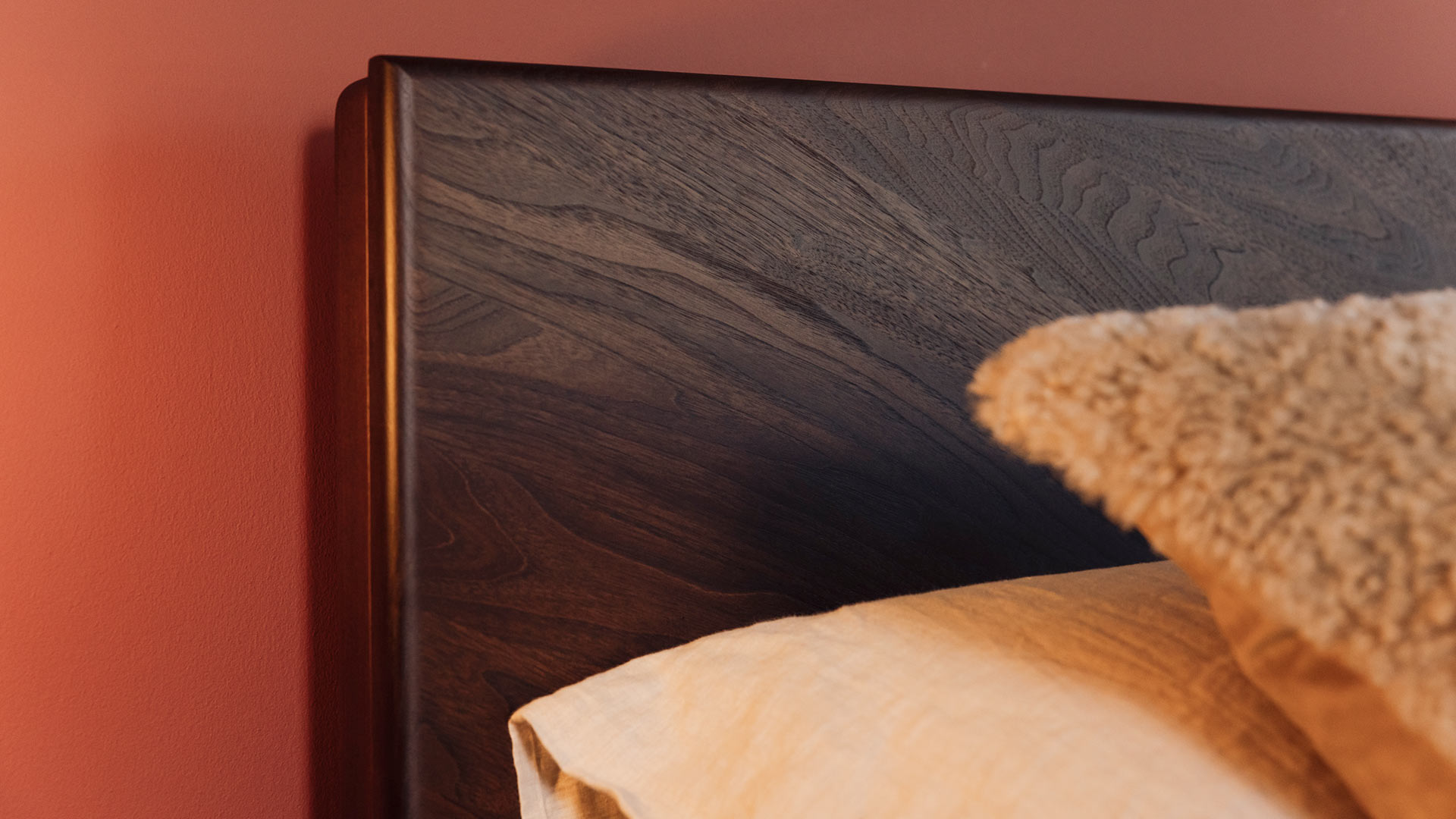 Lacquer Finish: The “smoked” stain used on this walnut bed creates a darker brown finish, whilst still allowing the texture and tones of the grain to show through. It retains a very subtle, soft sheen which protects the timber from grease marks and some stains.