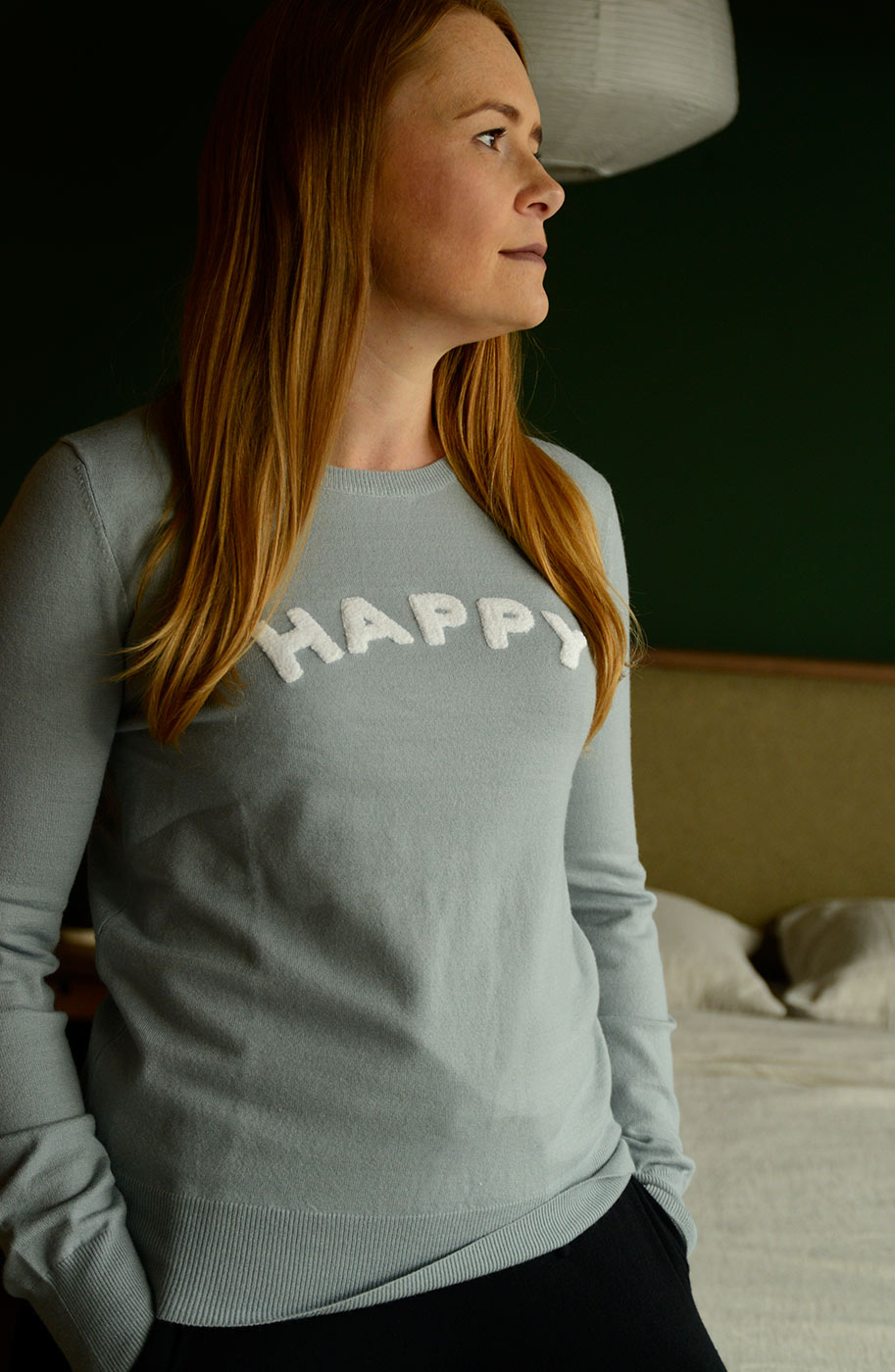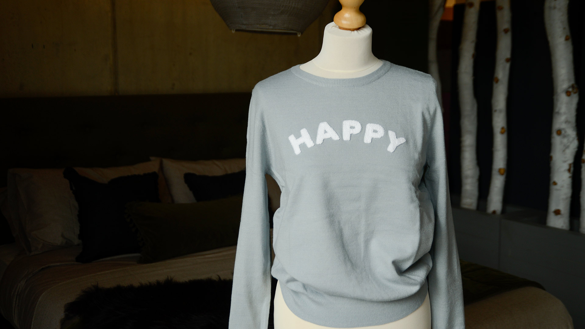 A soft and cosy ice blue jumper with a fluffy ‘HAPPY’ motif in white. This stylish piece of lounge-wear is a great way to keep warm this autumn. Find our full range of clothing and loungewear here on our website.