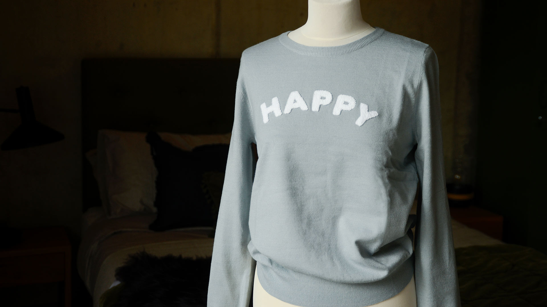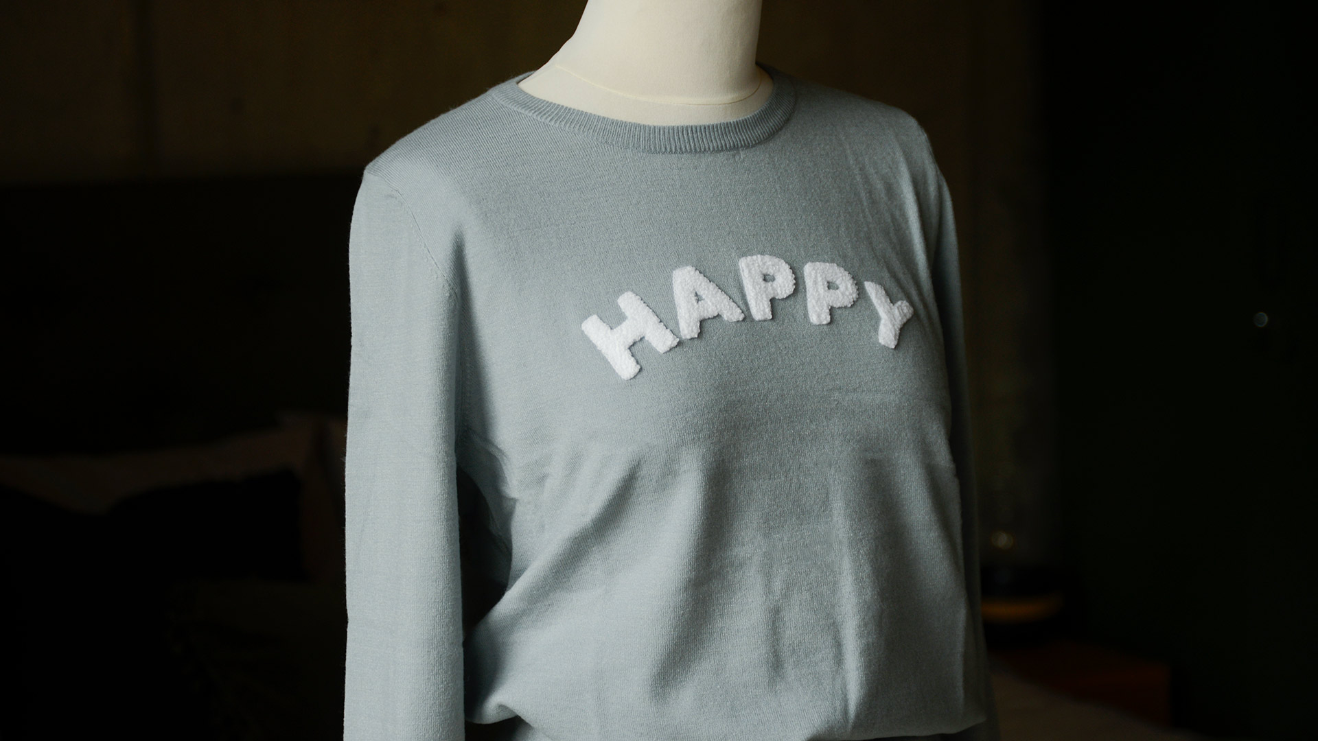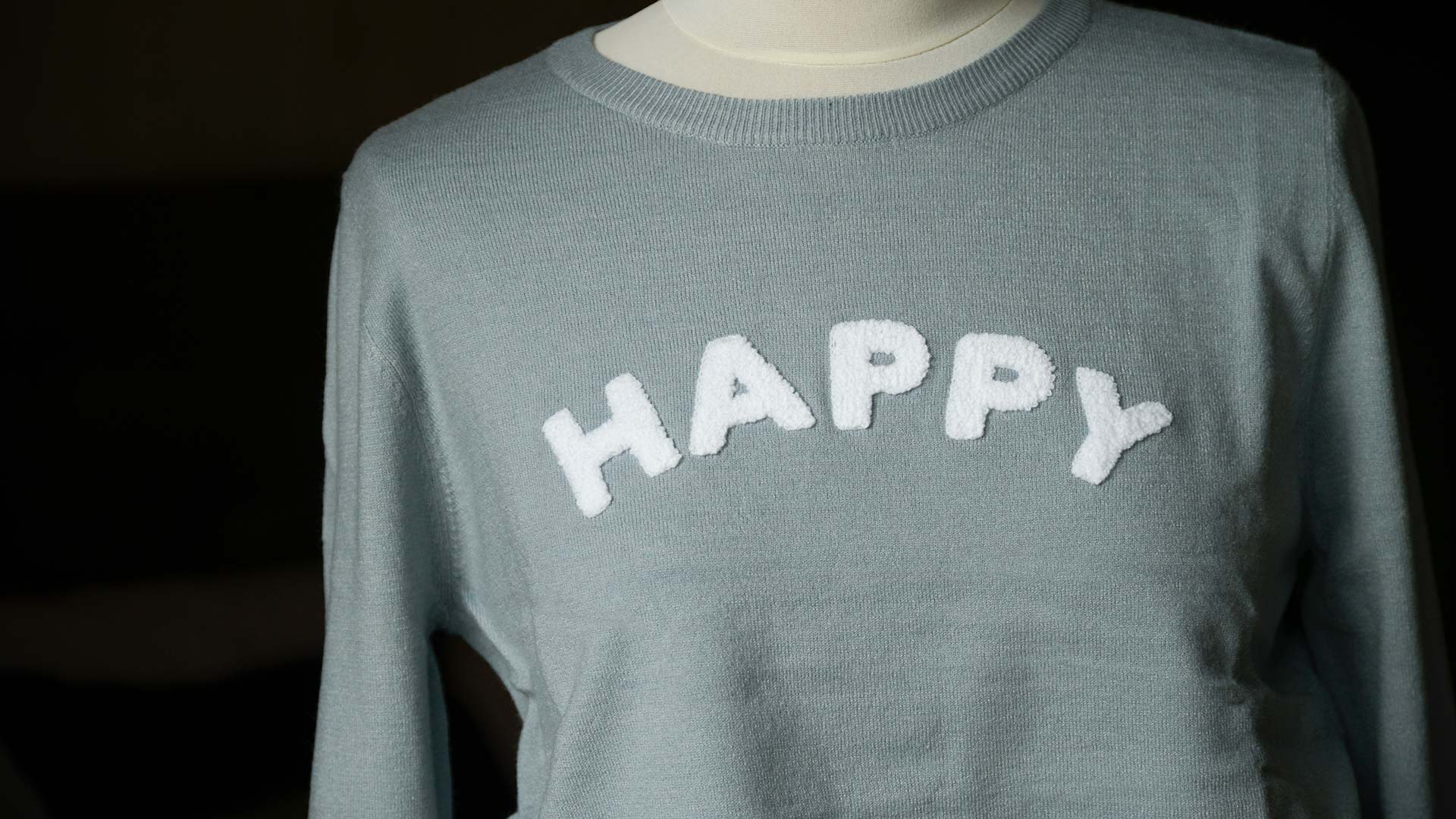 Stylish and comfortable ice blue jumper with a applique HAPPY in white. A fun and fashionable pale blue knitted top.