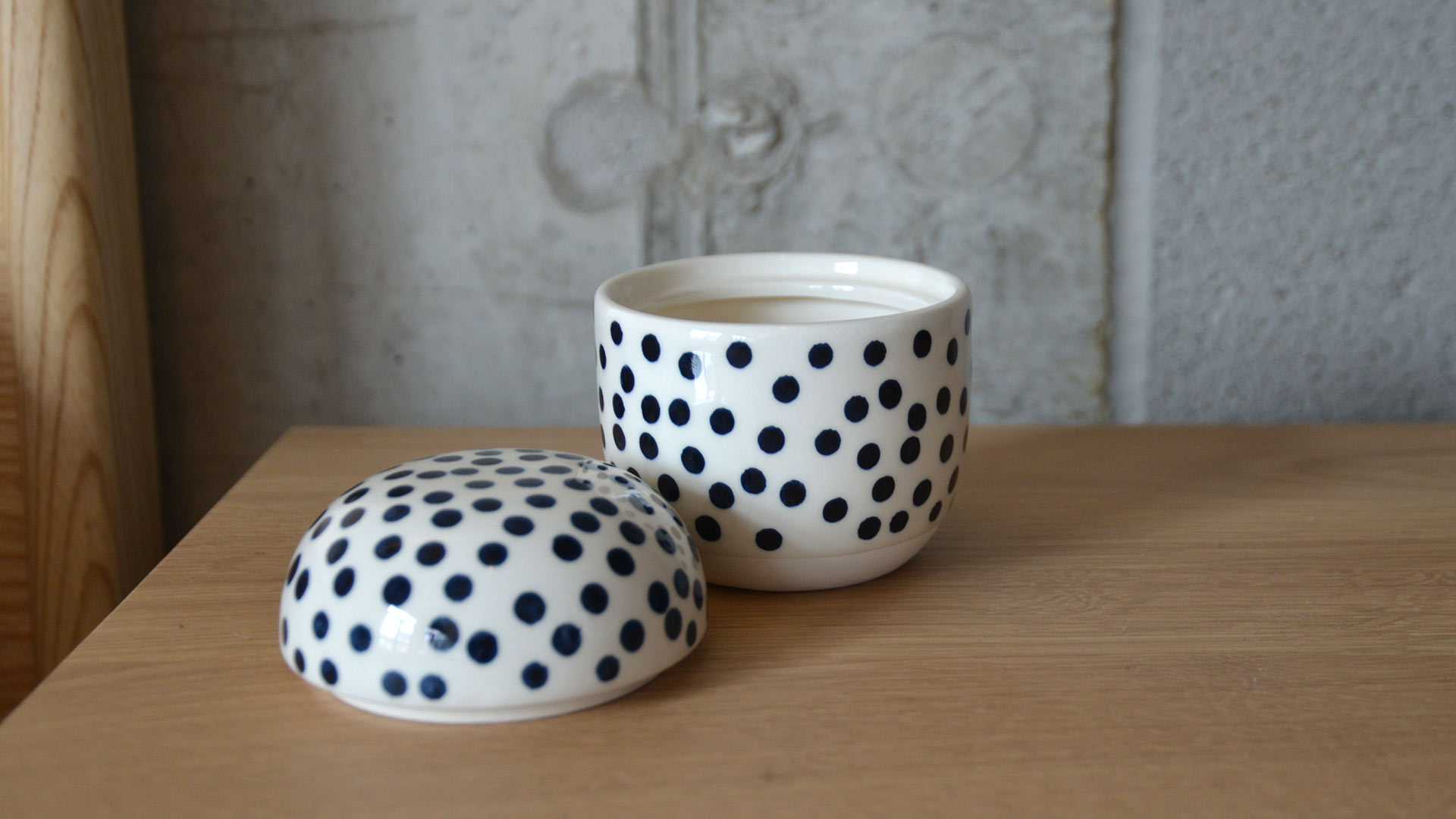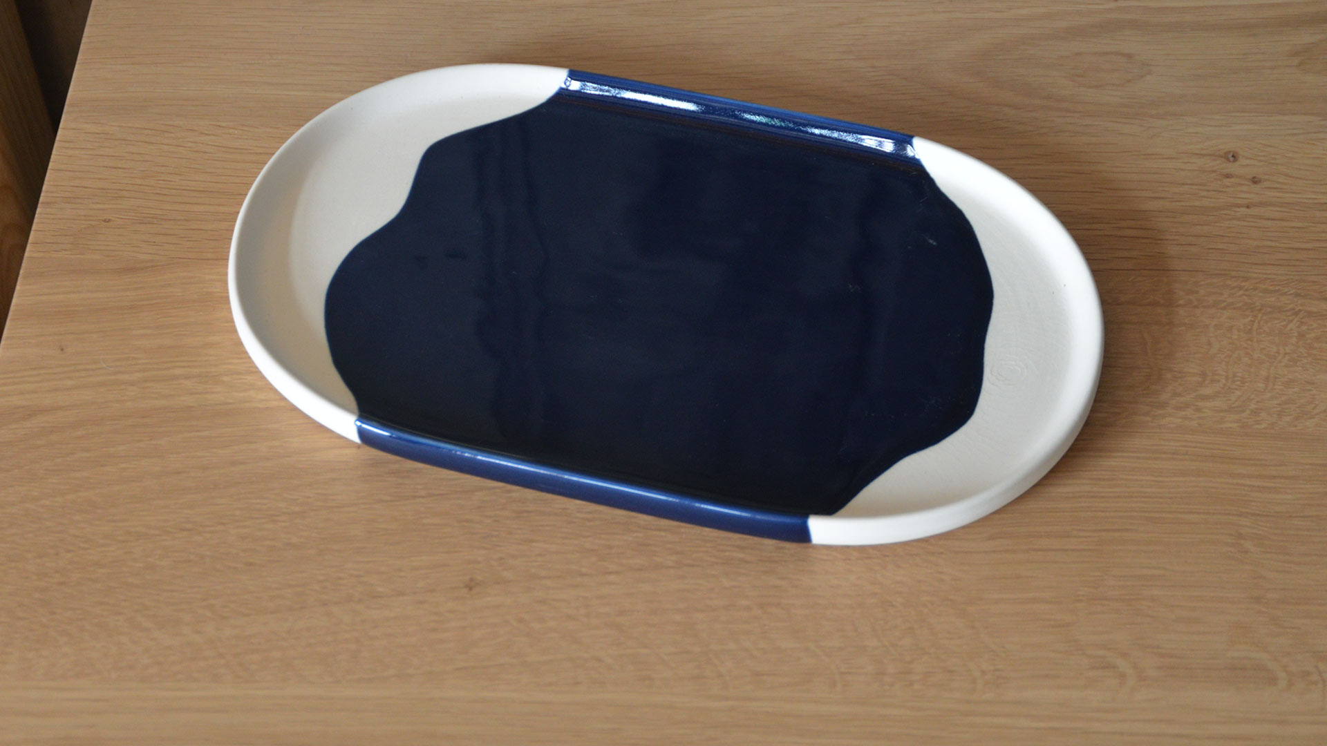 Collection: Mini Vase: decoration in ink blue spots. Approximately 3.5cm x H7cm Vase: decorated with ink blue vertical stripes. Approximately 6.5cm x H12.5cm Lidded Jar: decorated with small inky blue dots. Approximately 10cm x H12cm Tray: matte ceramic tray decorated with a ink blue, glazed splodge. Approximately 17 x 30cm