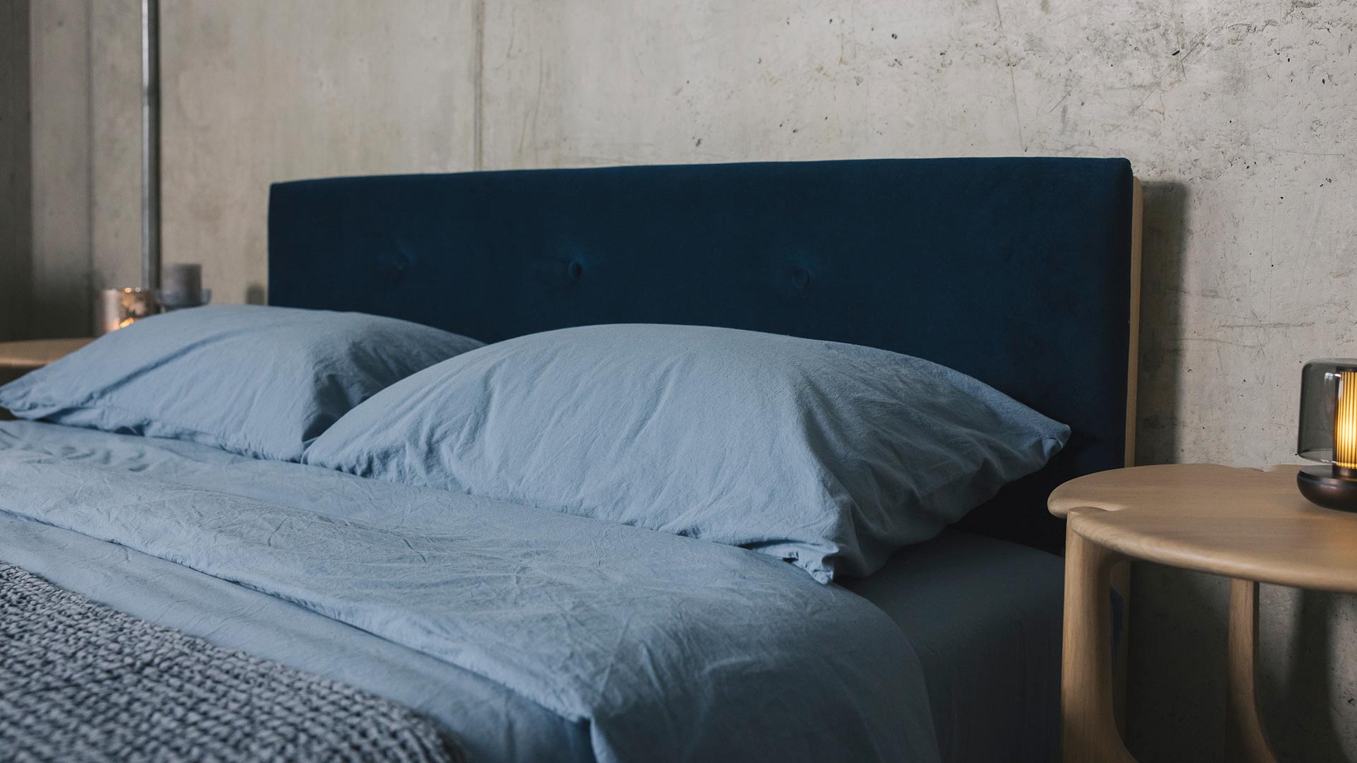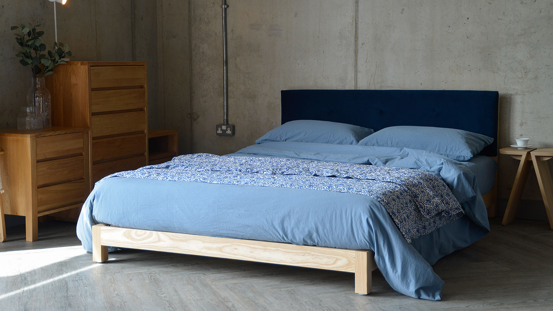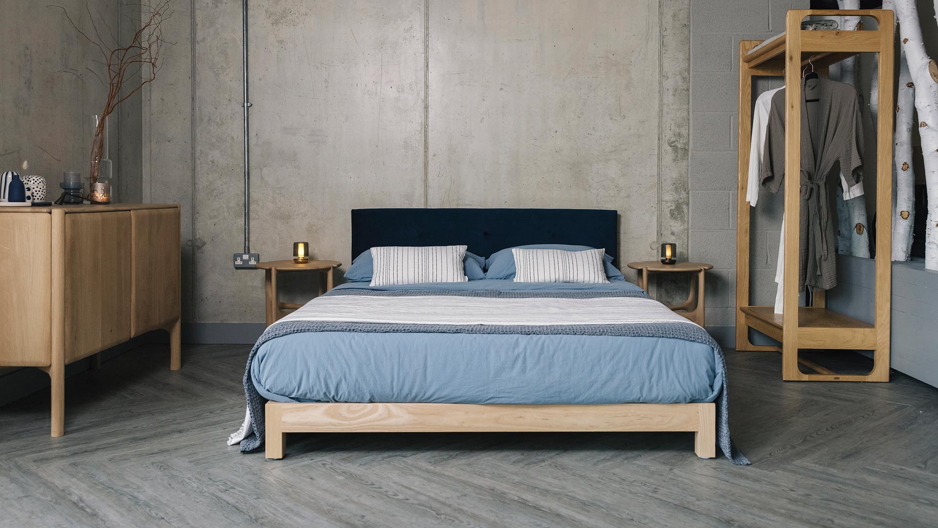 The Iona is a sleek, low bed available in a range of timbers. Characterised by its cosy headboard panel, you can also select from a range of fabrics for the upholstery. Our Iona is pictured here in the colour Amatheon Emperor and Eco Velvet (Indigo), and in Parquet Petrol from our premium fabric range. The Iona is available to order here in our standard upholstery options; Amatheon, Eco Velvet & Poole. It is also available to order in our premium fabric option (Parquet) just here.
