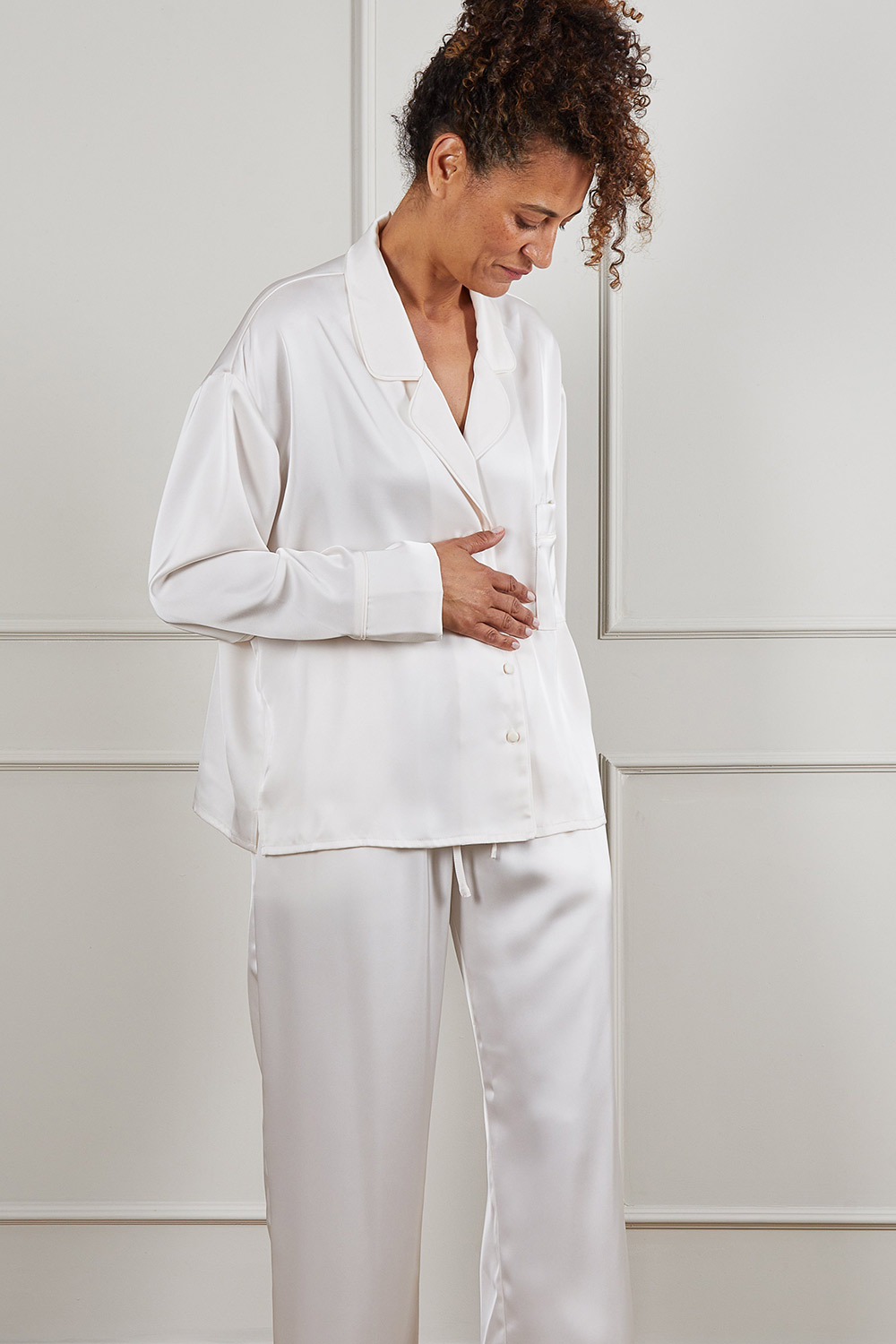 Lightweight, silky smooth satin pyjama set in a classic ivory white colour. A matching satin robe is also available.