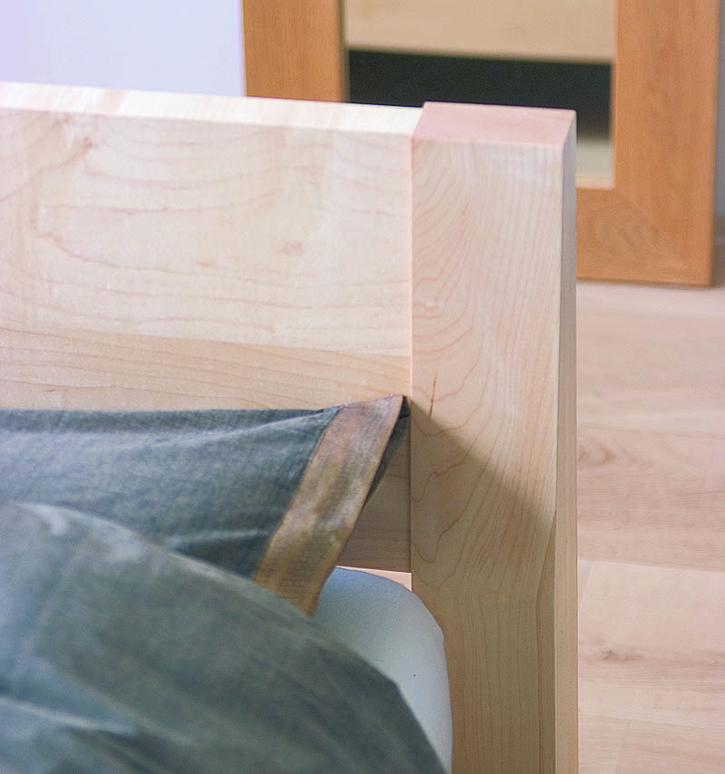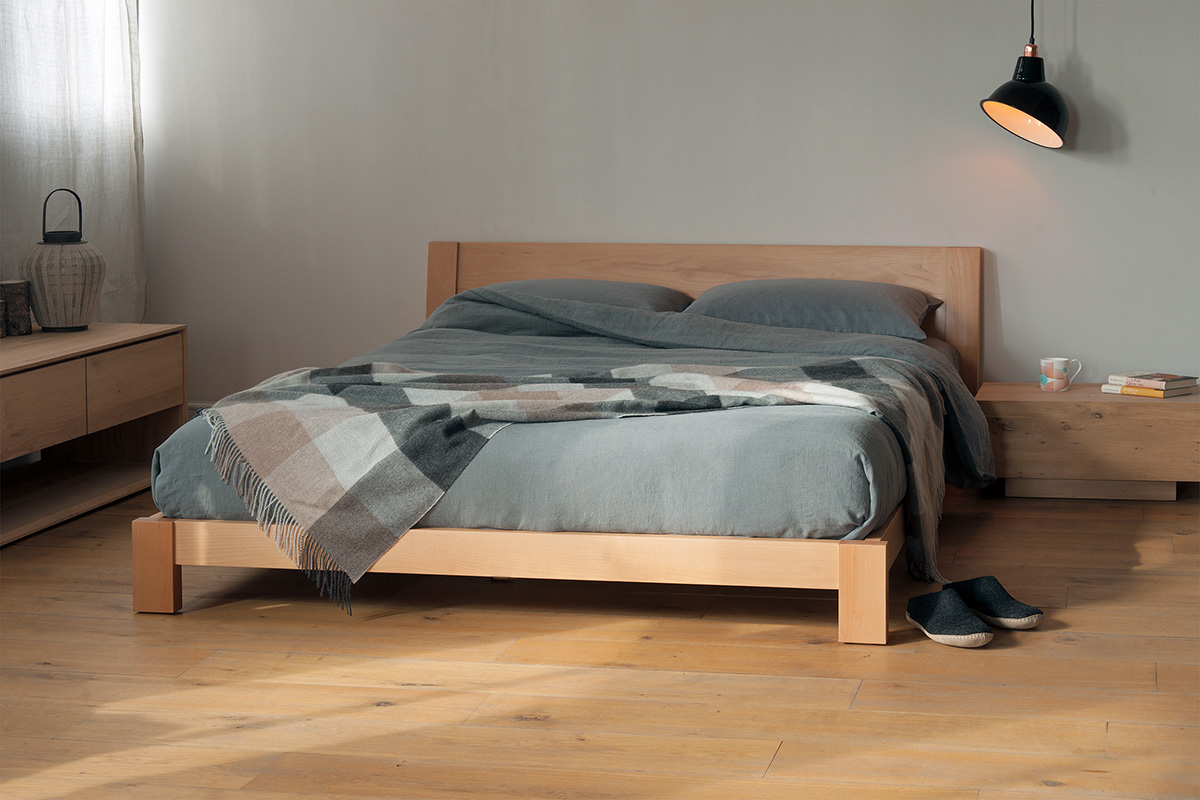 A low, solid wood bed with chunky legs and a sloping headboard. The Java is photographed here in solid beech and maple. The close-up images show the intricate patterns and grains found in natural timbers. Click on the main image and the thumbnail shots to see all the available images and to enlarge them.