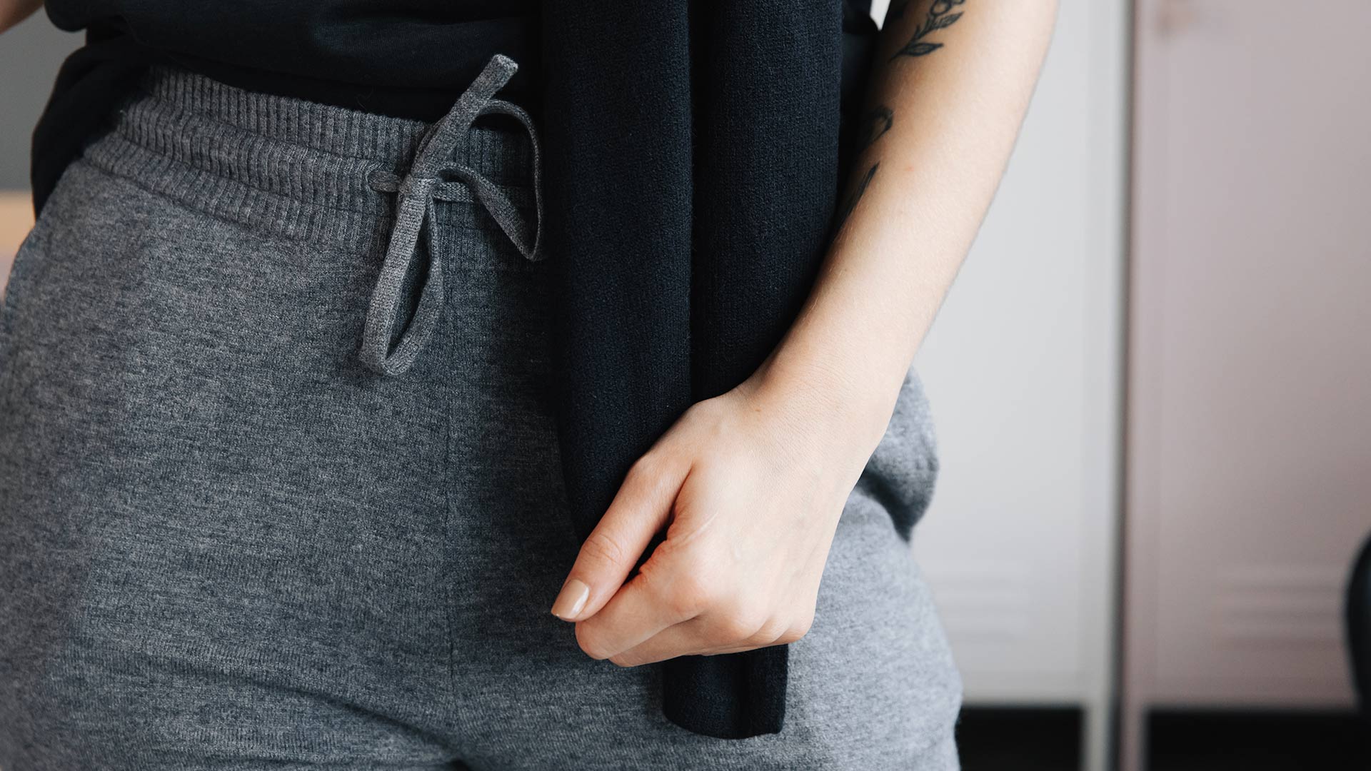 A collection of knitted lounge-wear in grey, soft fabric – perfect for lounging at home, stylish enough to wear out and about. The range includes a pair of joggers and a cosy hooded top. The jogger style bottoms have an elasticated waist and knitted tie belt, pockets to the front and elastic at the ankles. (Also shown in black – available here)