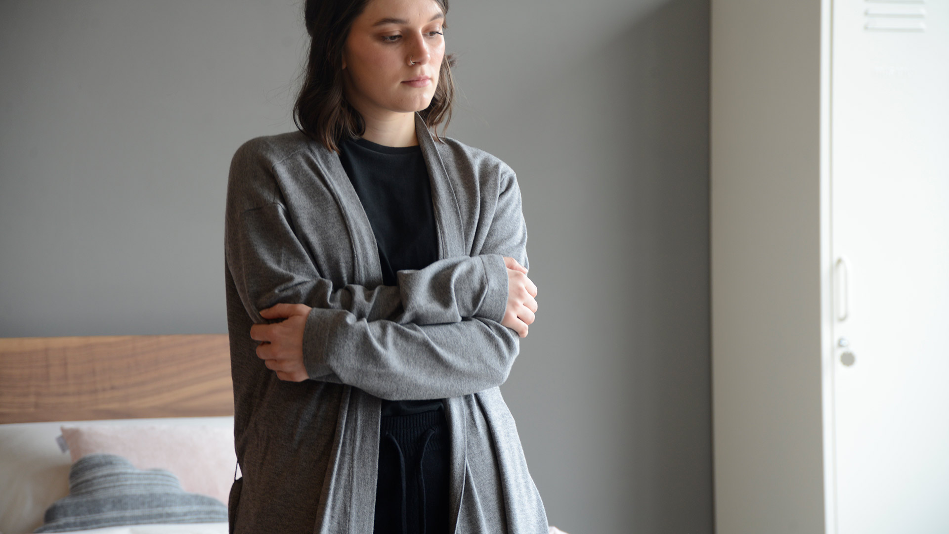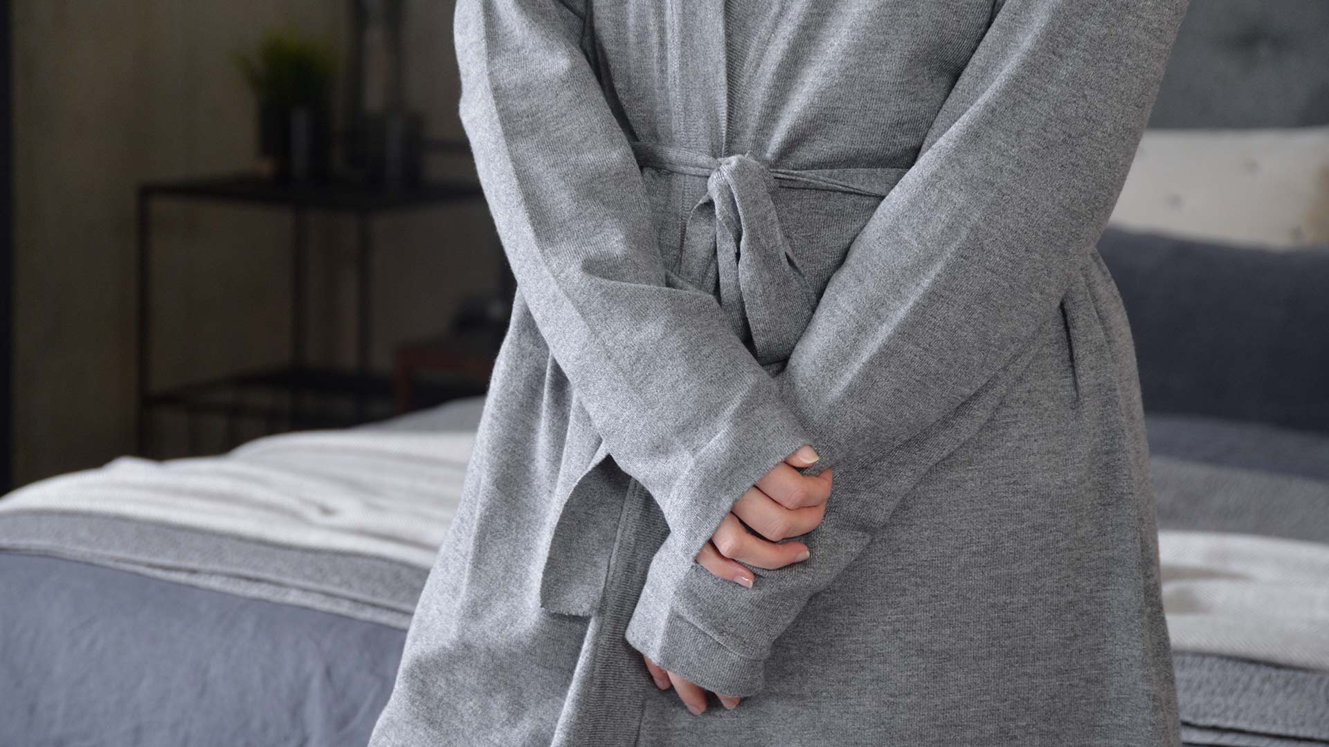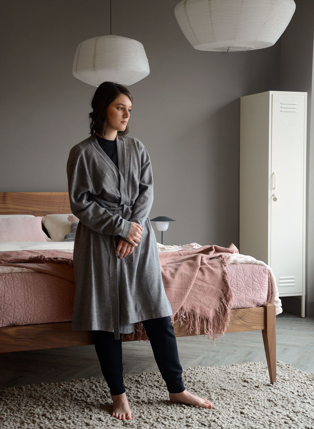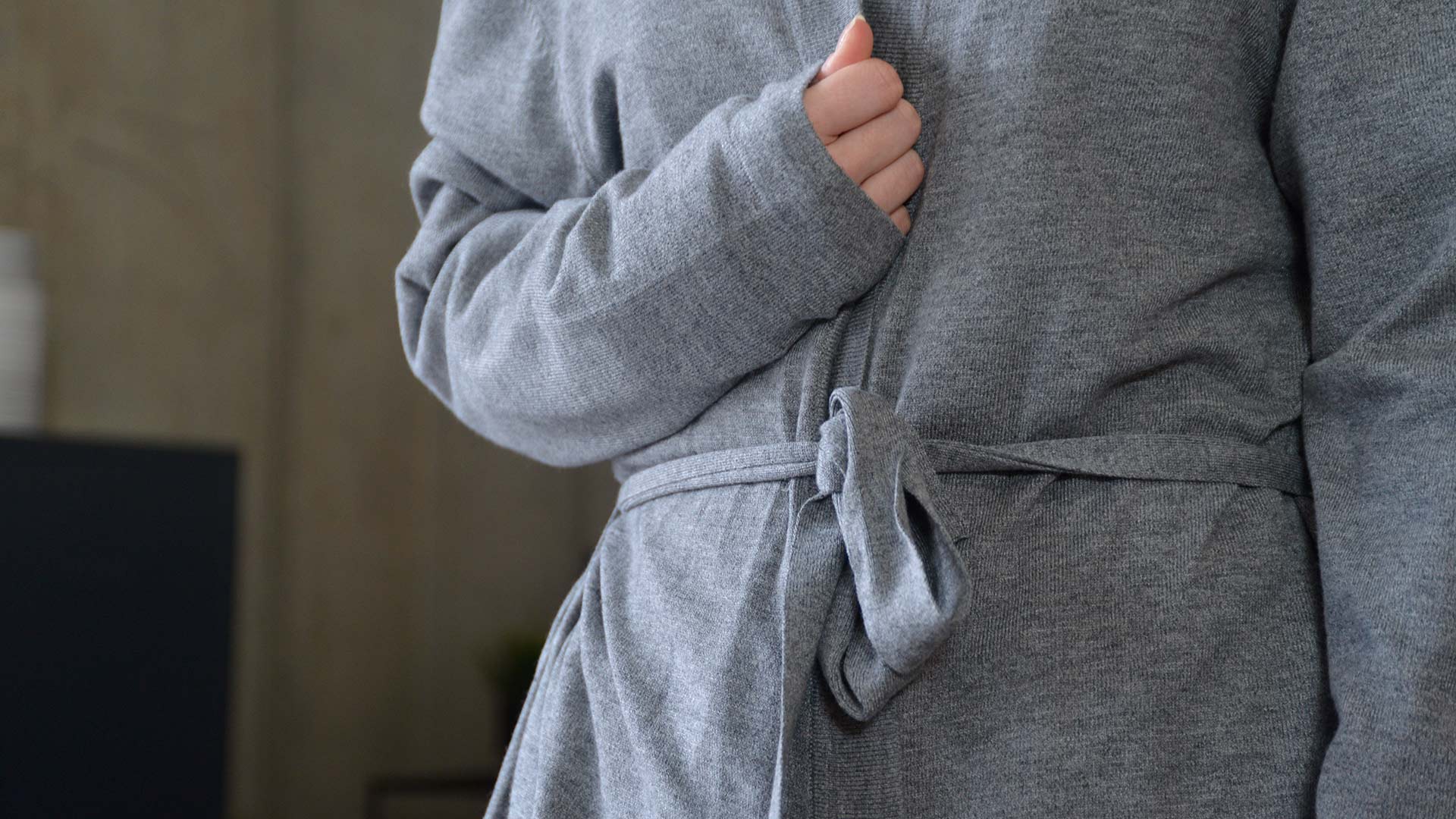 A knitted robe in grey, soft fabric – perfect for lounging at home. This flexible piece of lounge-wear is stylish enough to wear out and about as a long cardigan and so soft against the skin that makes a perfect robe.